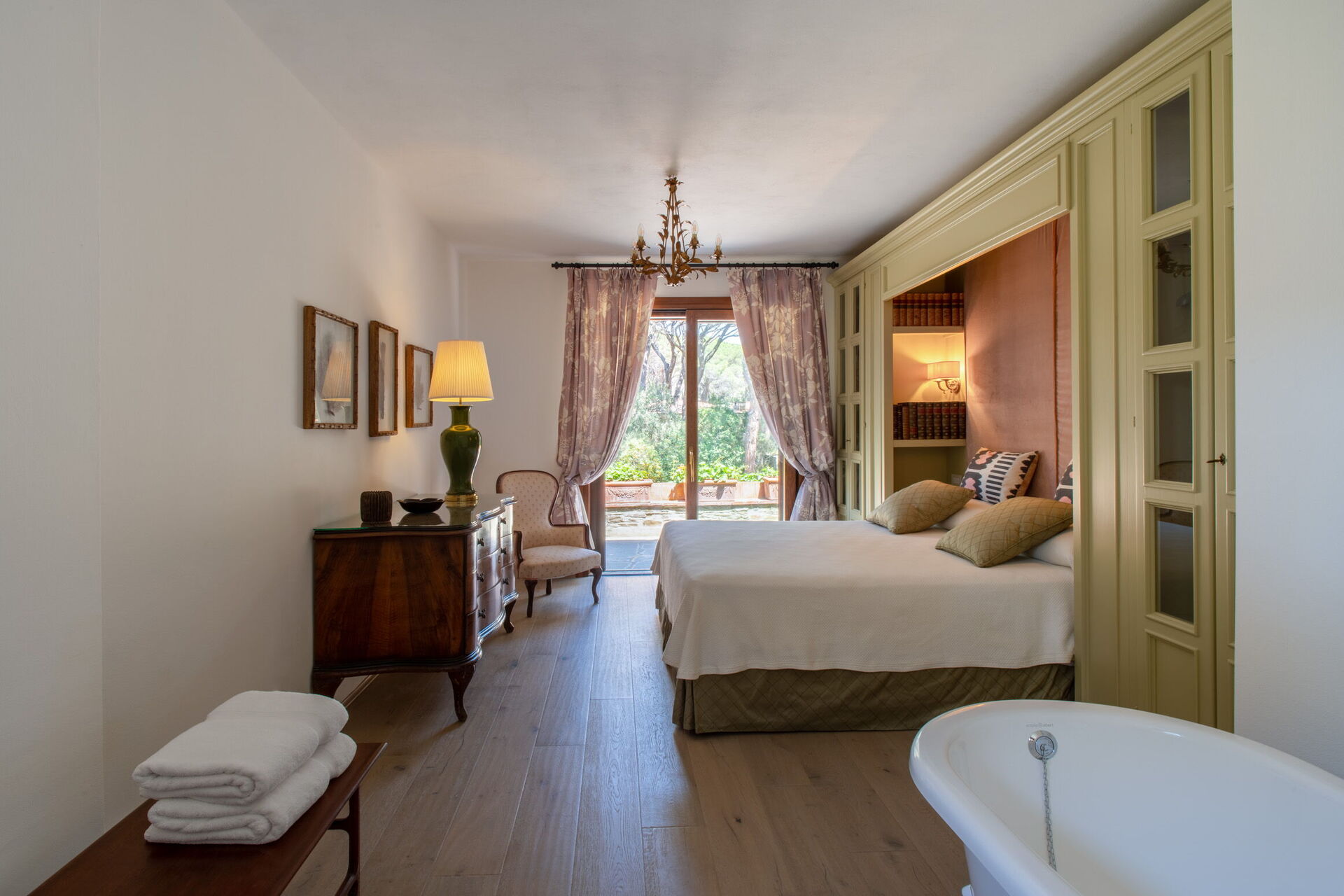 Soveværelse med bad 6: king size seng, WIFI internet, klimaanlæg, myggenet, lænestol, skrivebord, vask, wc, bidet, badekar, bruser, hårtørrer, udgang til have.