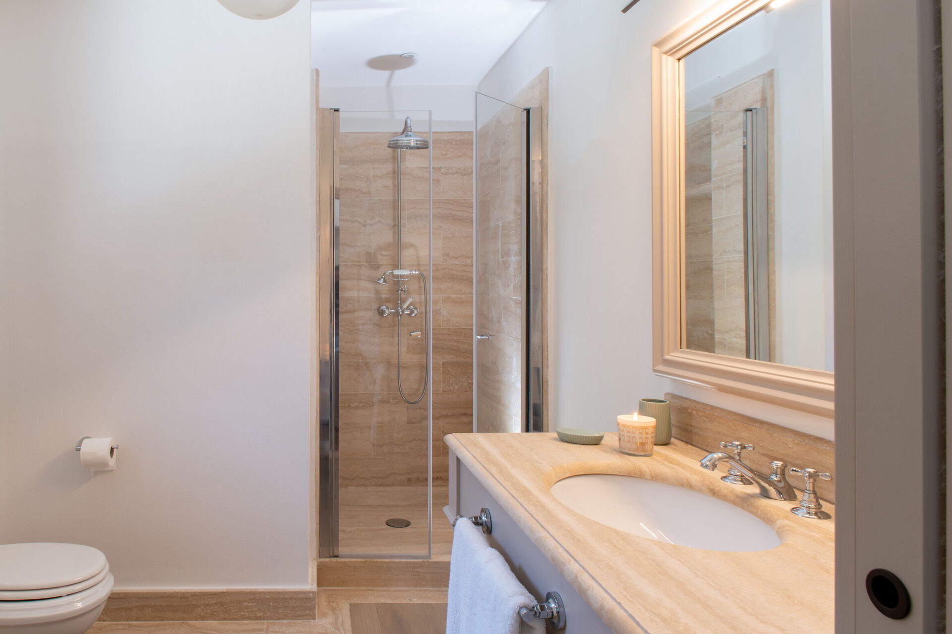 Soveværelse med bad 1: king size seng, WIFI internet, klimaanlæg, myggenet, lænestol, vask, wc, bidet, bruser, hårtørrer, udgang til have.
