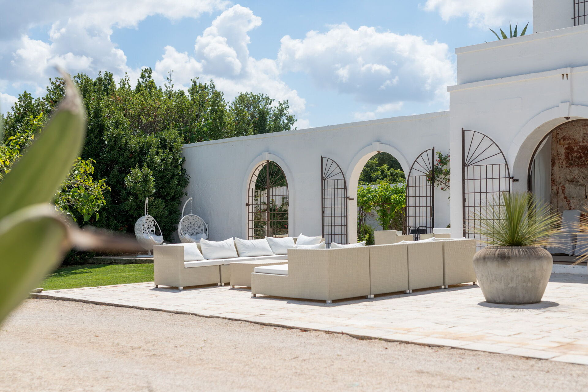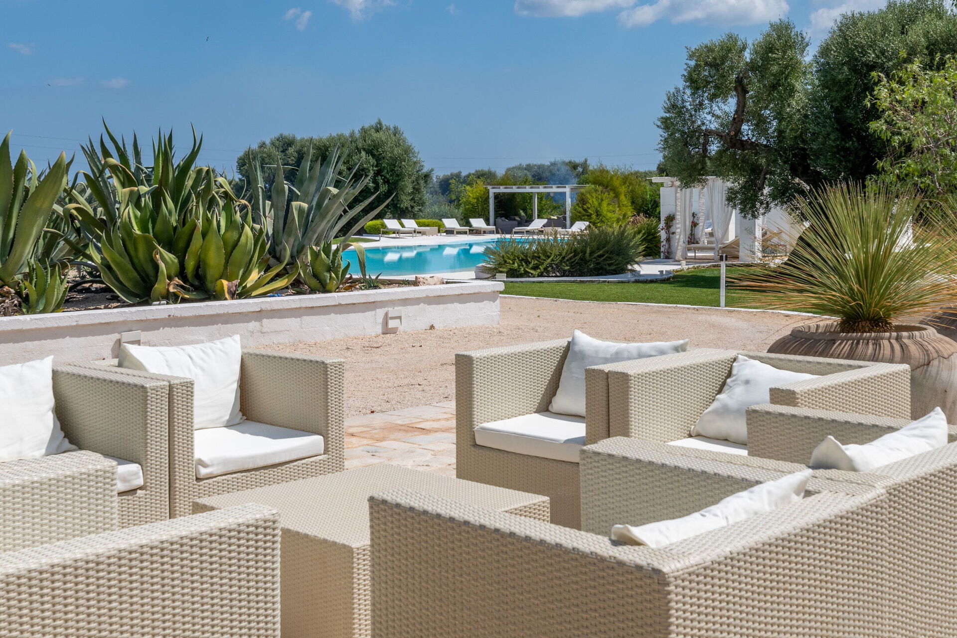 To frame this small courtyard there are several olive trees and succulent plants characteristic of Puglia, as well as numerous armchairs.