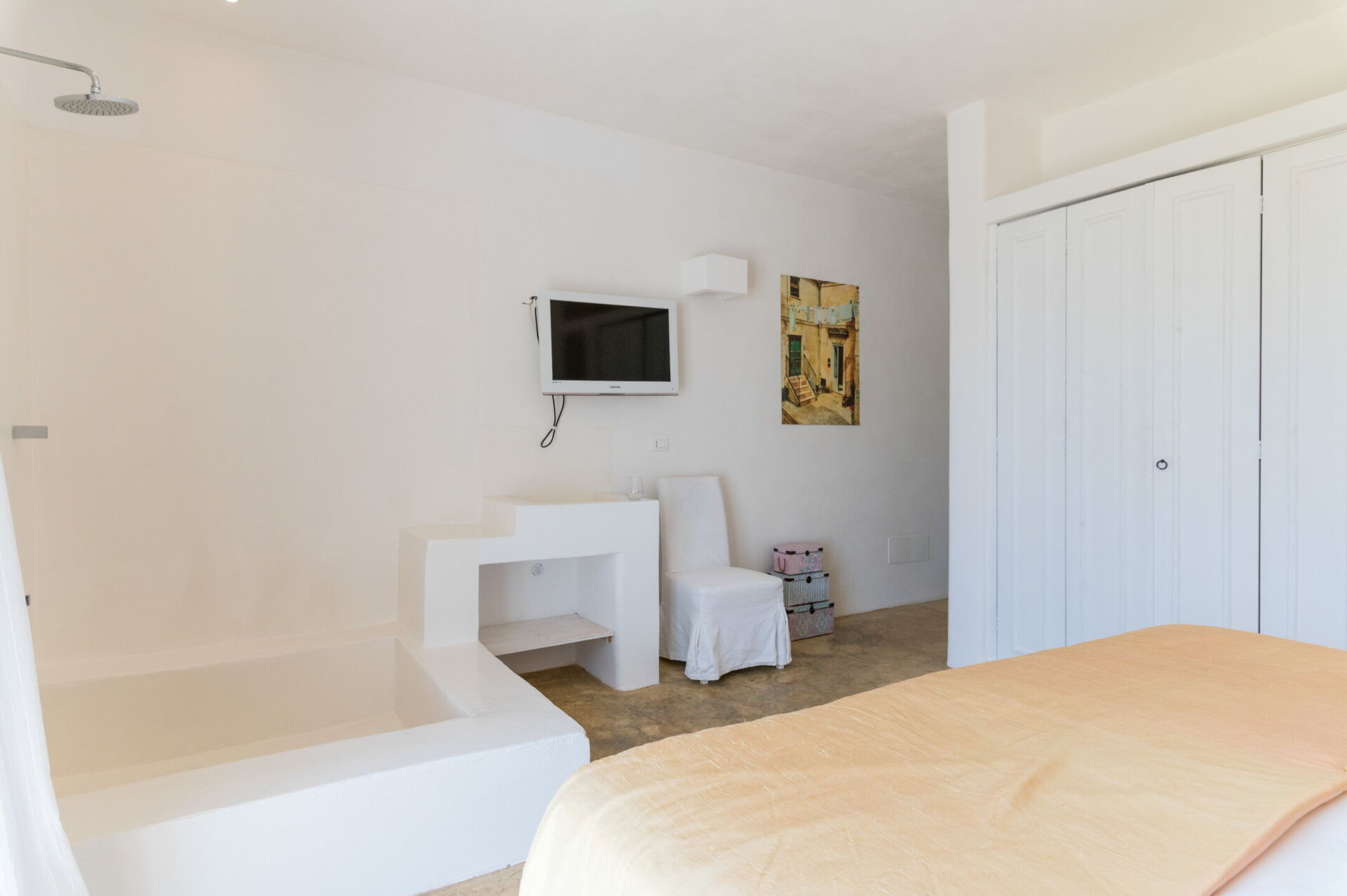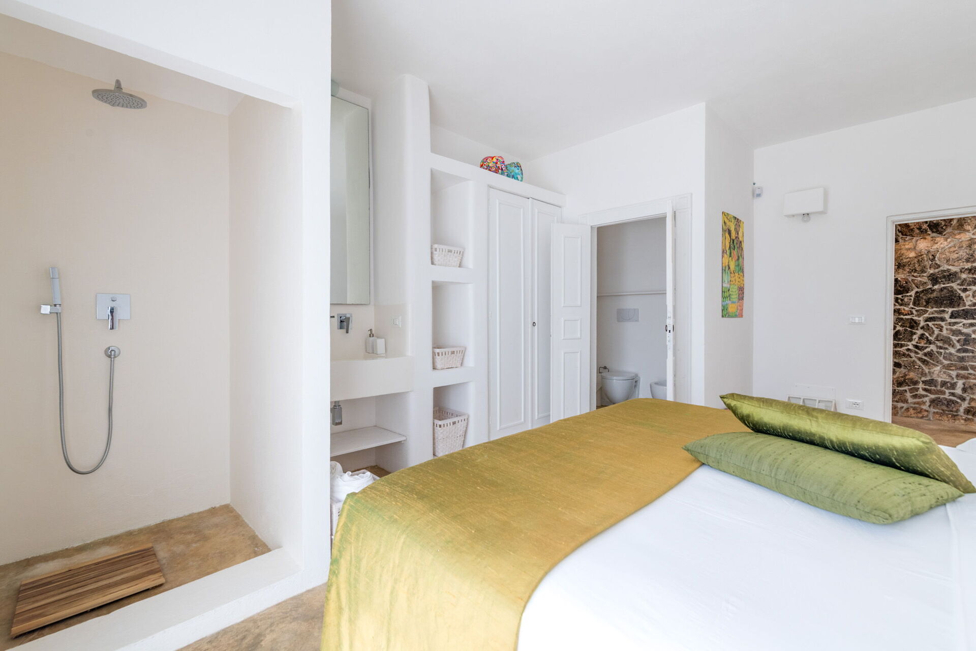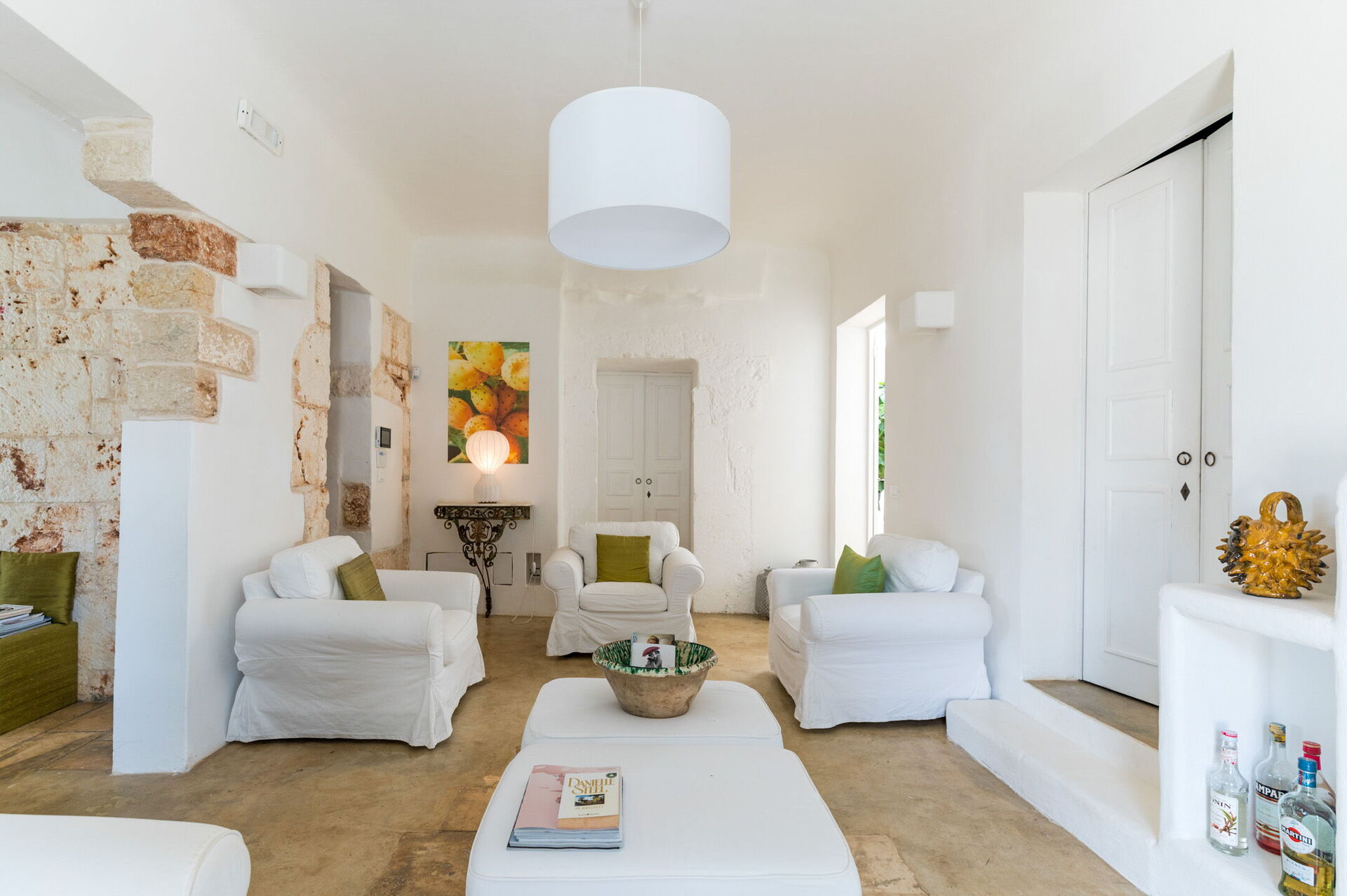 The second sleeping area is preceded by a living room with sofas and a glass pergola shaded by wonderful white drapes, from here you have access to two double bedrooms with characteristic exposed dry stone walls, as well as the further 3 double bedrooms which also have access from the outside.
