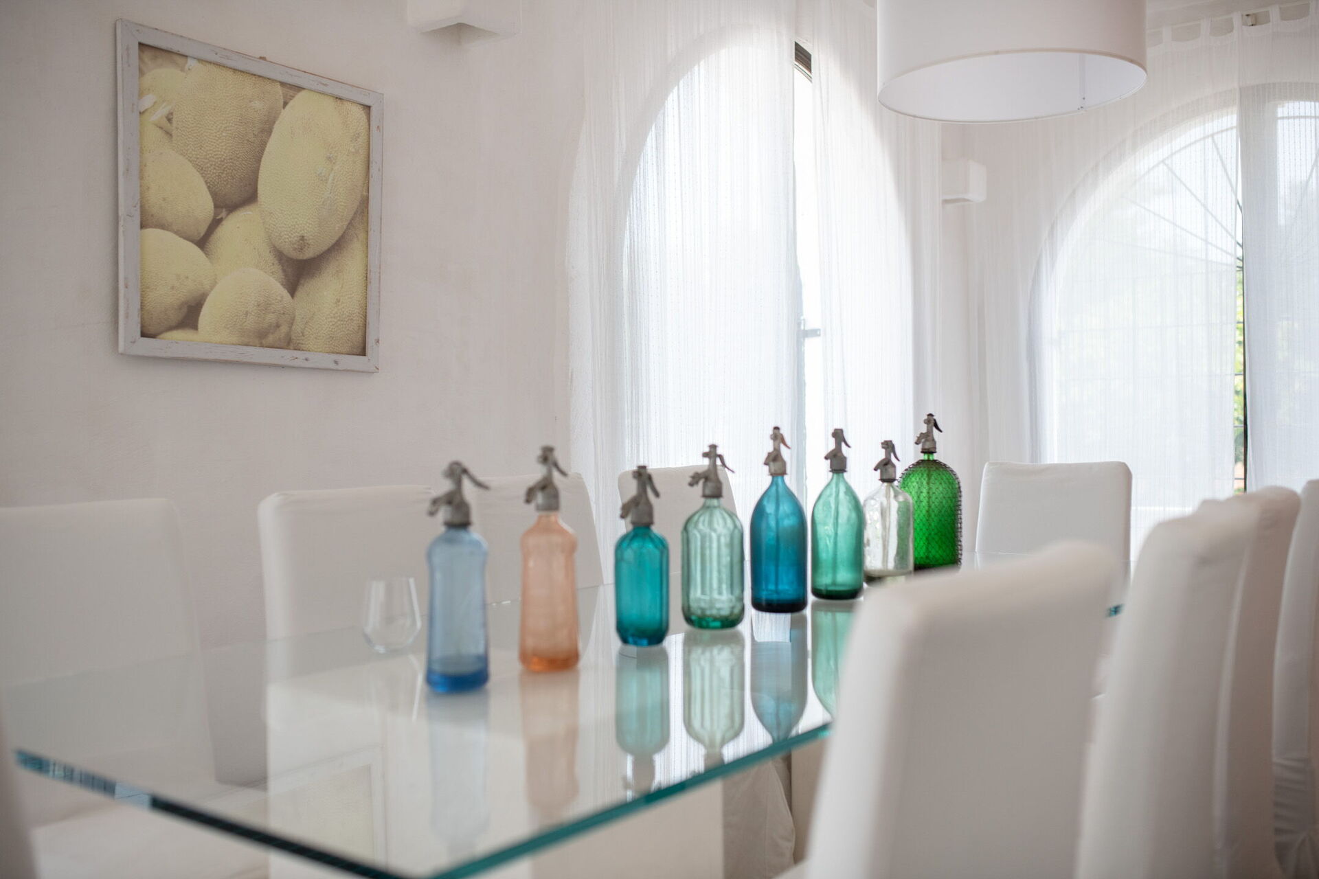 You will be able to access the garden and the pool area, both from the kitchen and the living room. Located below a large veranda, covered with the characteristic reeds, you will find the dining table and the various relaxation corners furnished with comfortable seats and sofas, like the orangery with umbrellas.