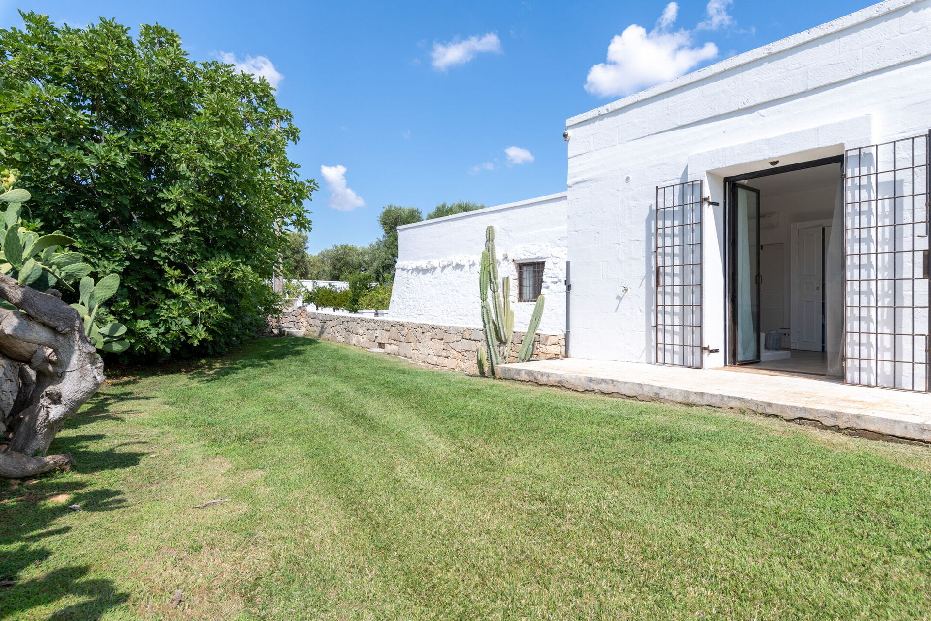 The characteristic lime white of the external walls contrasts with the green garden with lawn and olive trees making the atmosphere suggestive and magical especially at sunset.