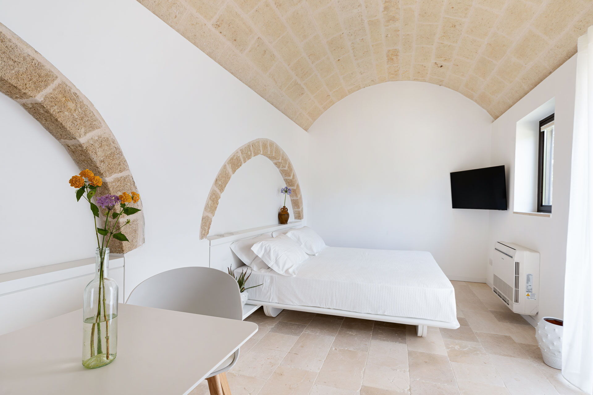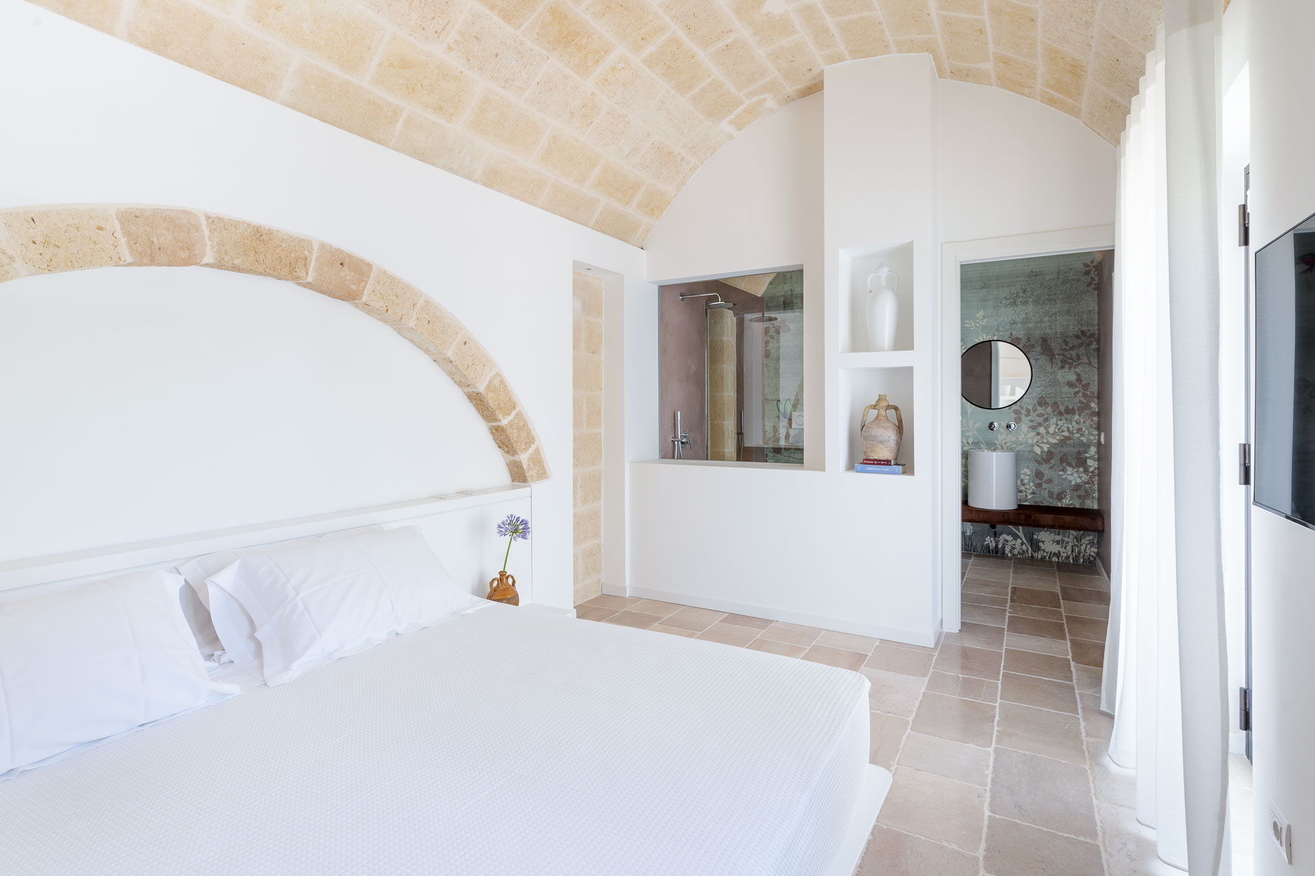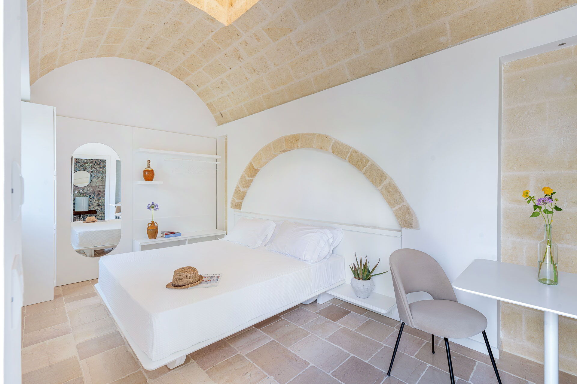 Each room is designed to offer a unique and unforgettable experience. Details play a fundamental role in creating an atmosphere of refined elegance. The bright shades of tuff, contrasting with the pure white of the furniture and walls, create a harmonious contrast that welcomes guests in a feeling of calm and serenity.