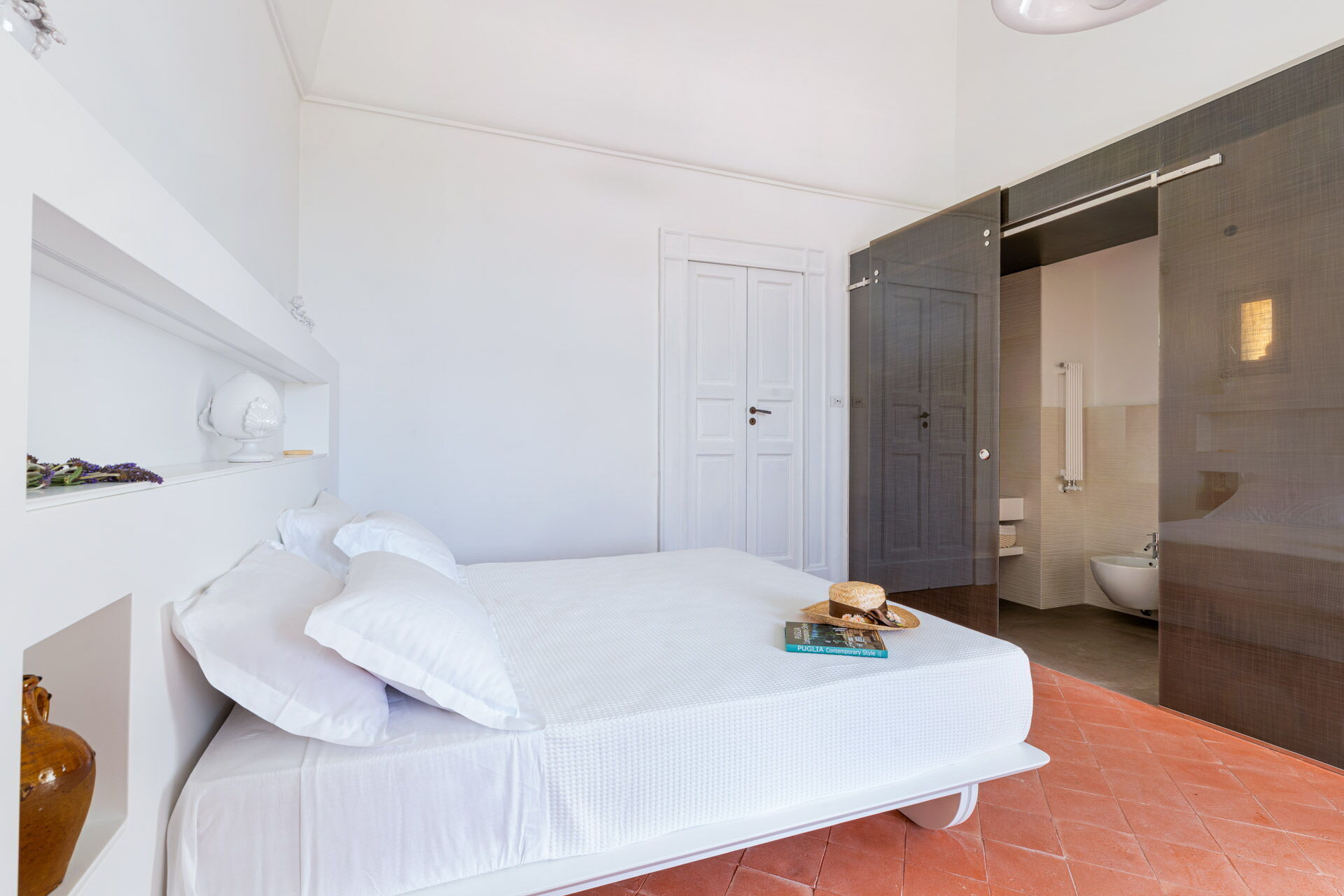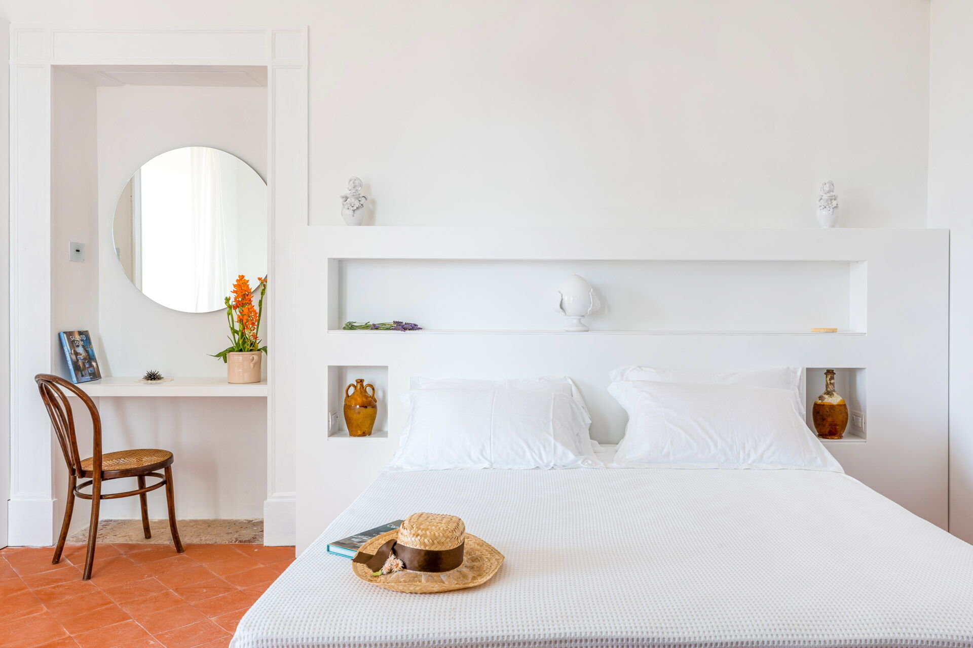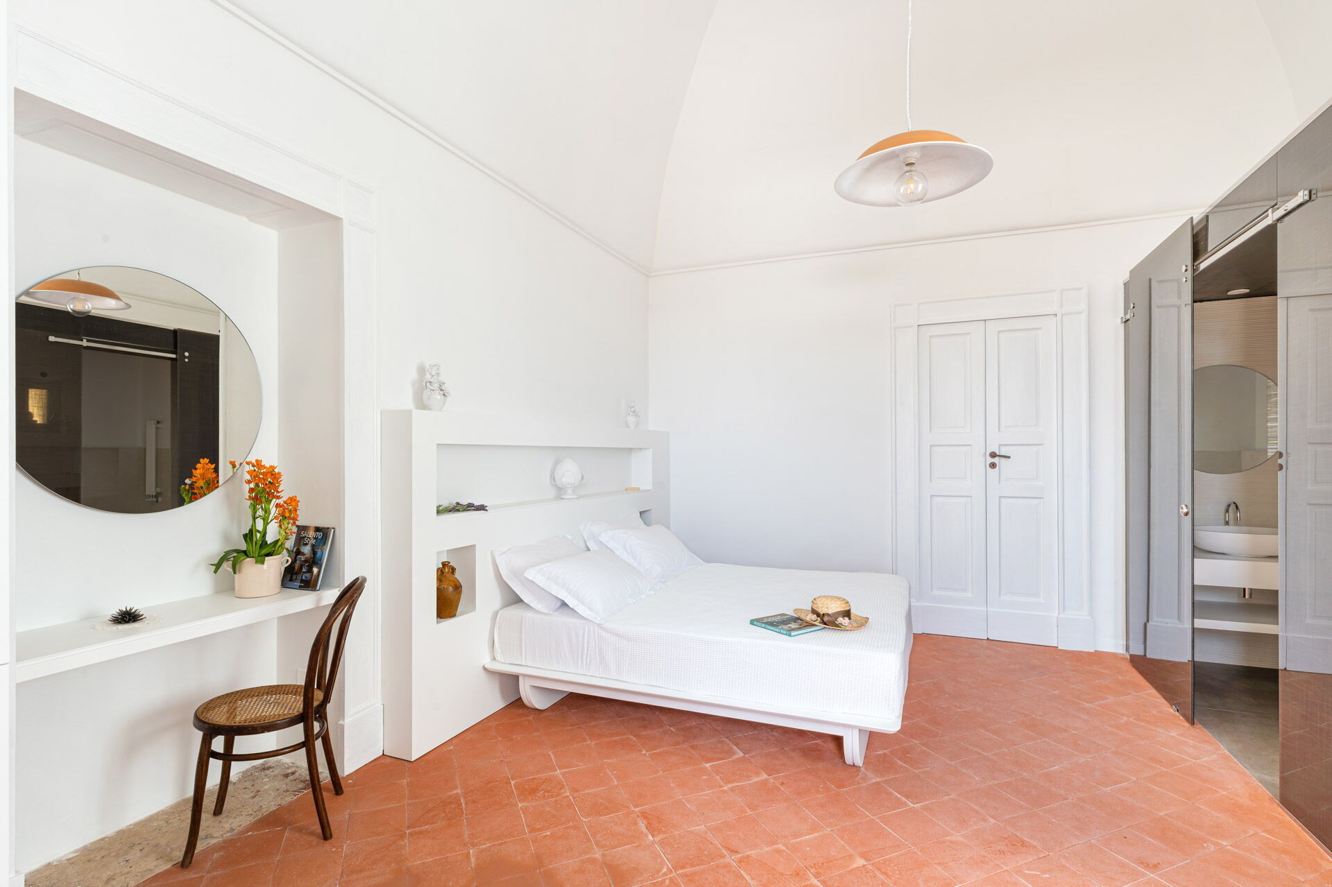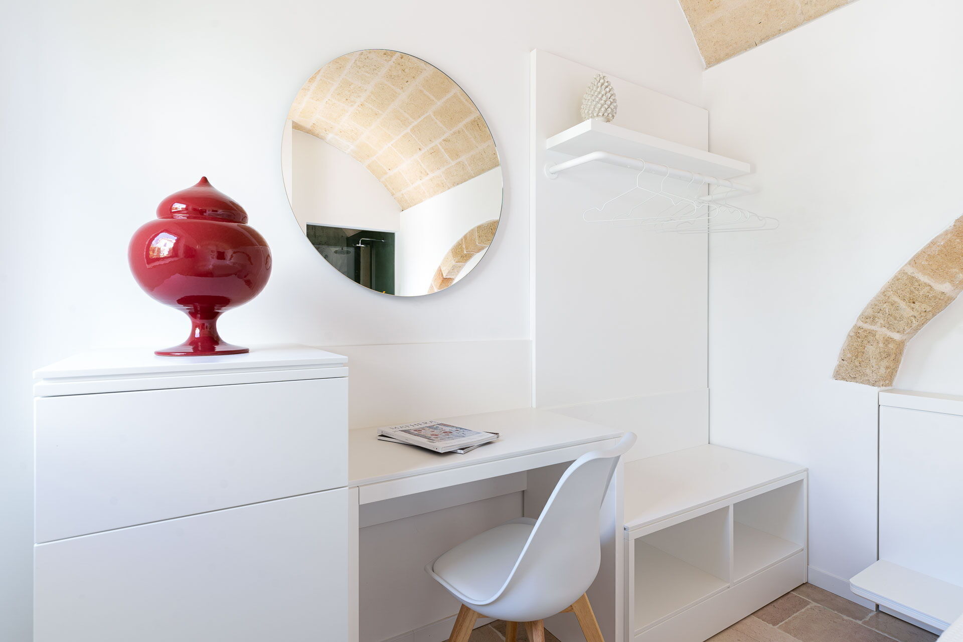 Each room is designed to offer a unique and unforgettable experience. Details play a fundamental role in creating an atmosphere of refined elegance. The bright shades of tuff, contrasting with the pure white of the furniture and walls, create a harmonious contrast that welcomes guests in a feeling of calm and serenity.