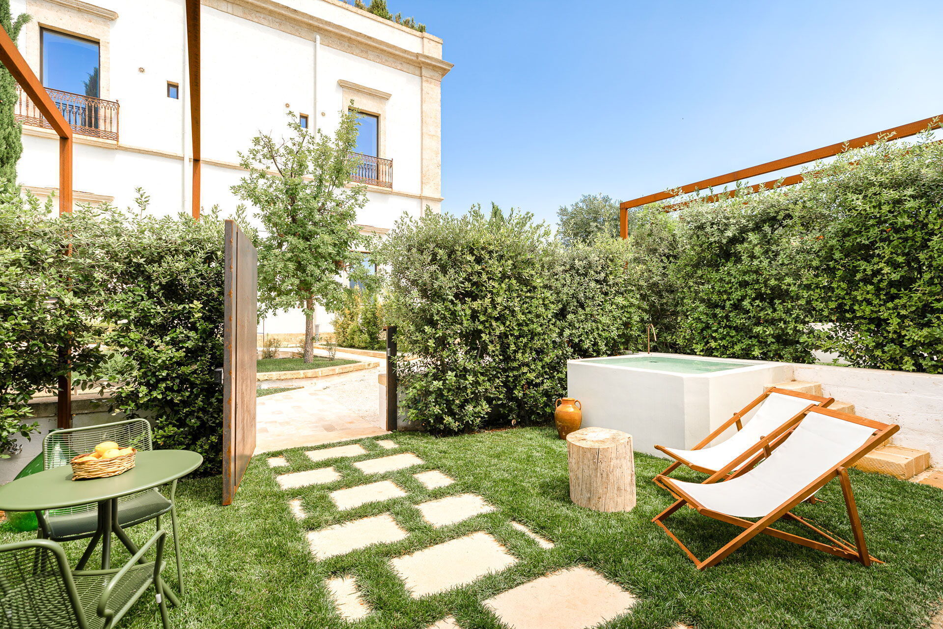 Inside the building, six refined rooms await visitors, with a distribution of two on the first floor and four on the ground floor, each of the four rooms accompanied by a private garden and a luxurious outdoor Jacuzzi. These resting spaces have been skilfully created from the old private stables, transforming into shelters of comfort and style.