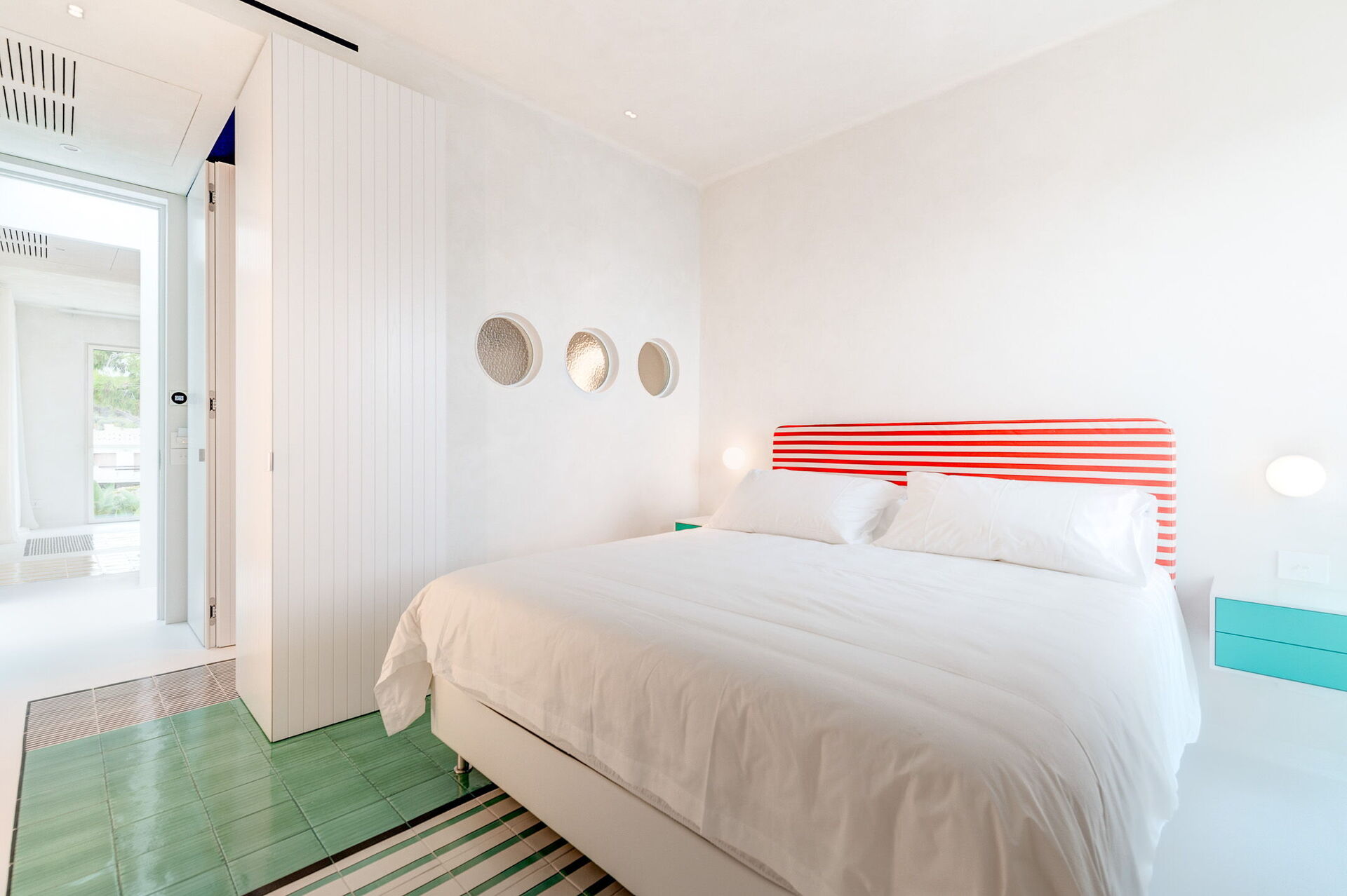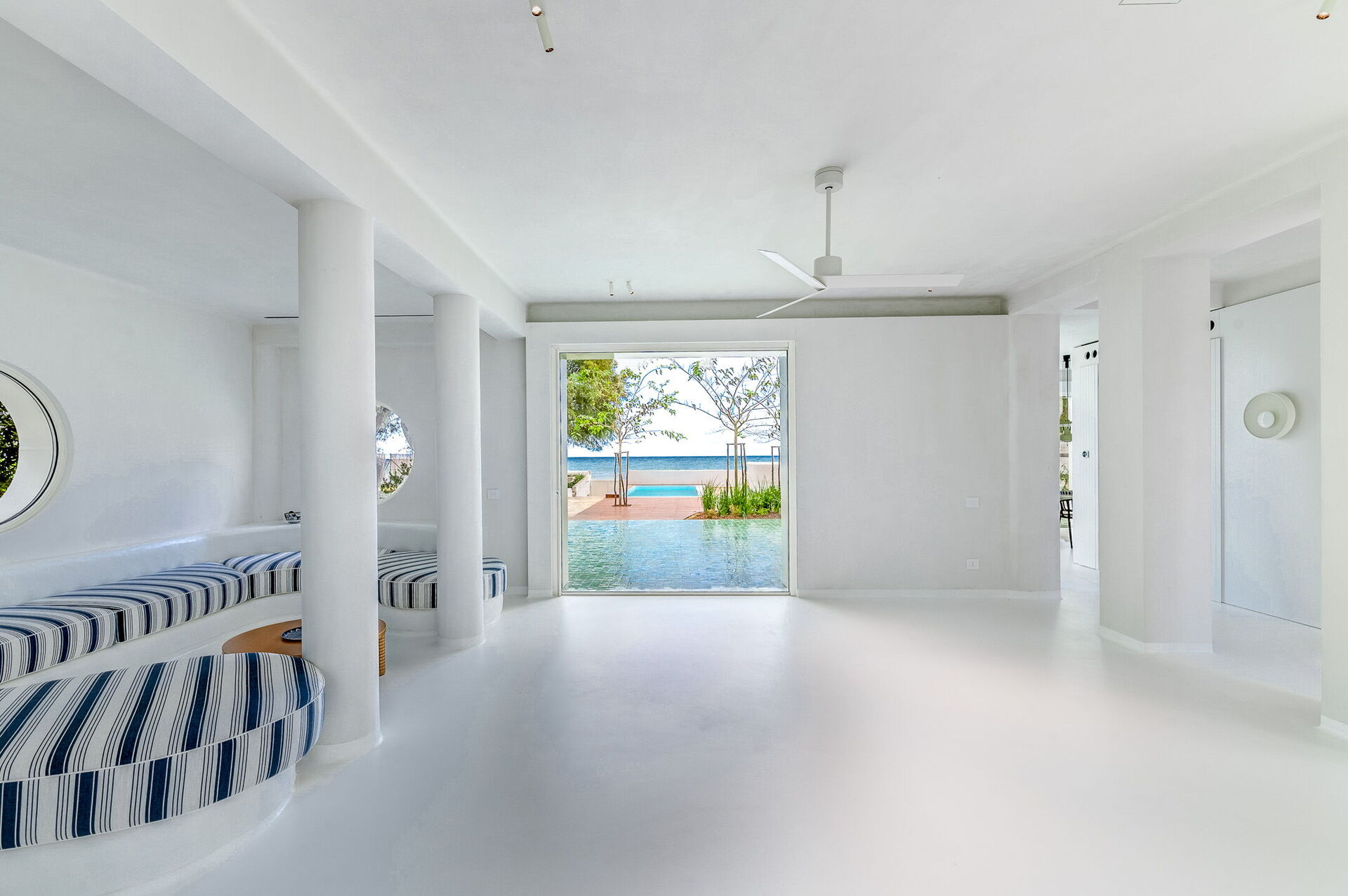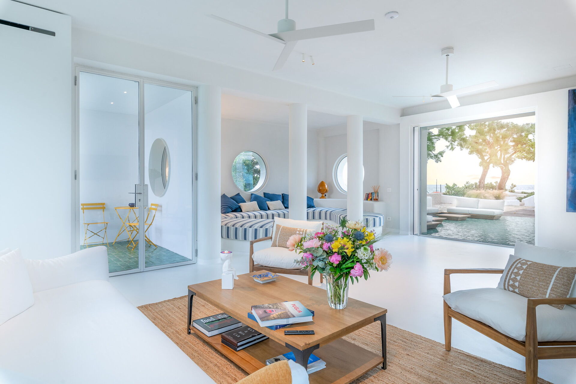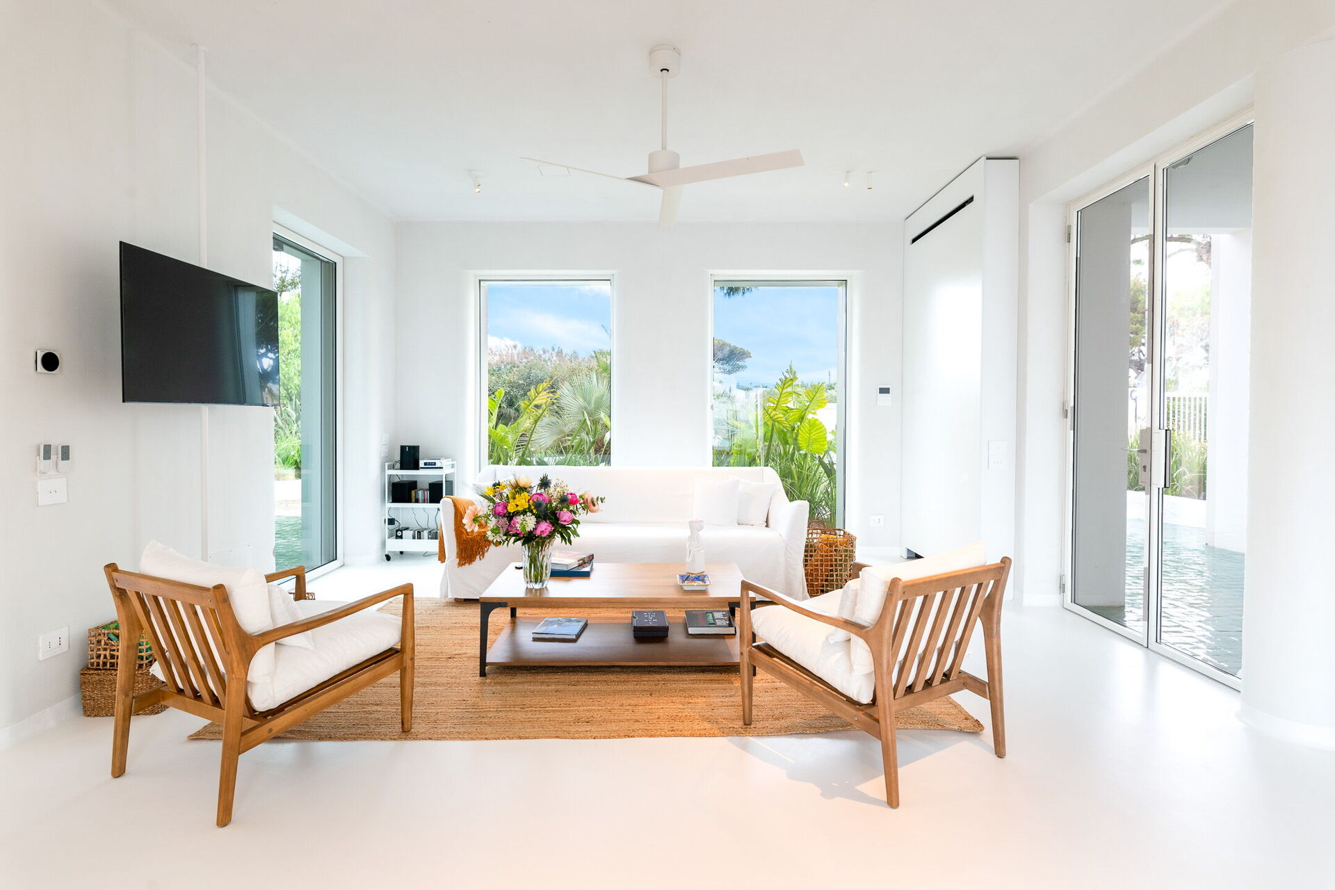 The villa has a living area on the ground floor and 5 bedrooms with private bathrooms on the first floor. The recently renovated property features contemporary furnishings and design elements that evoke the sea.