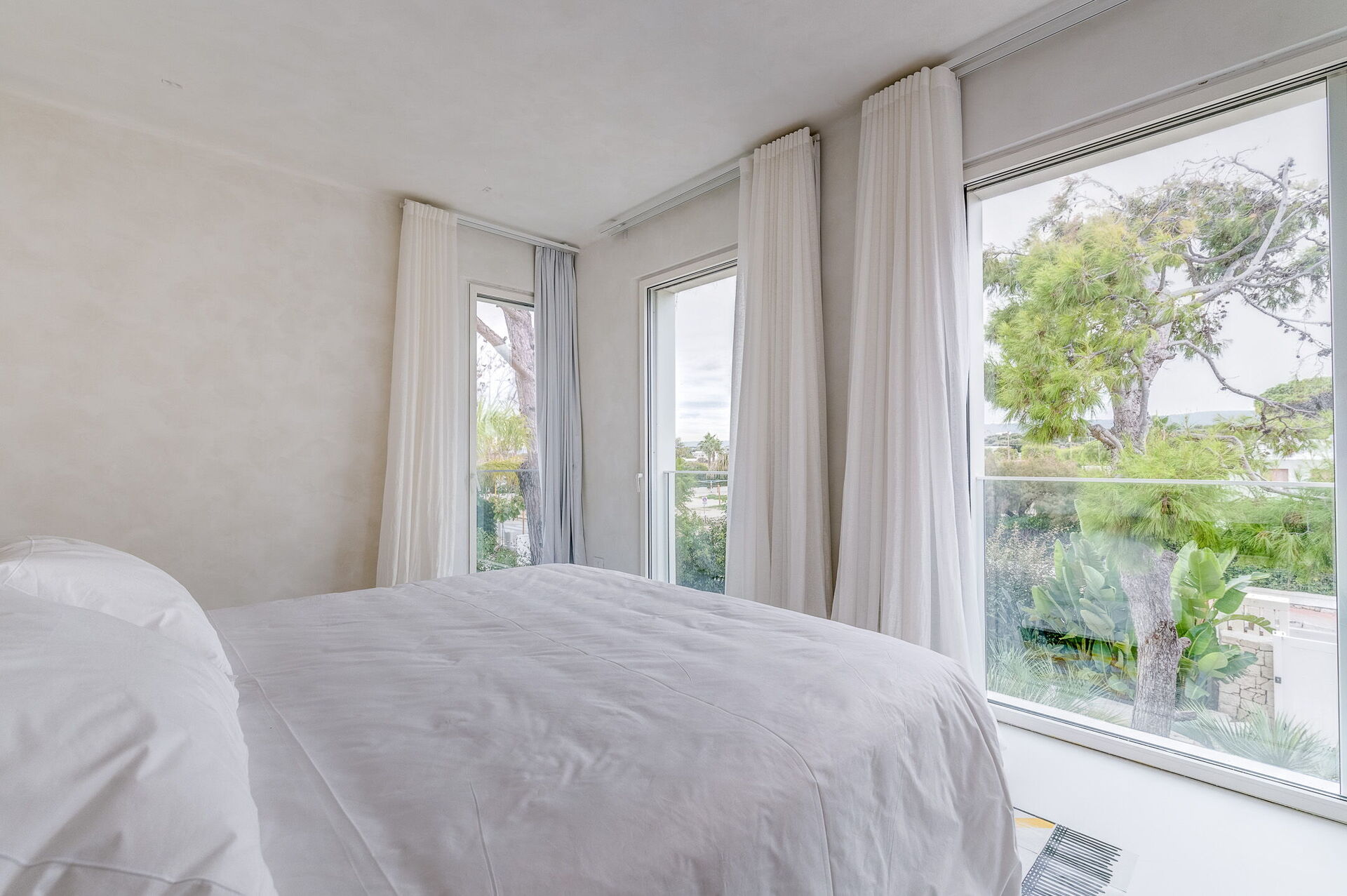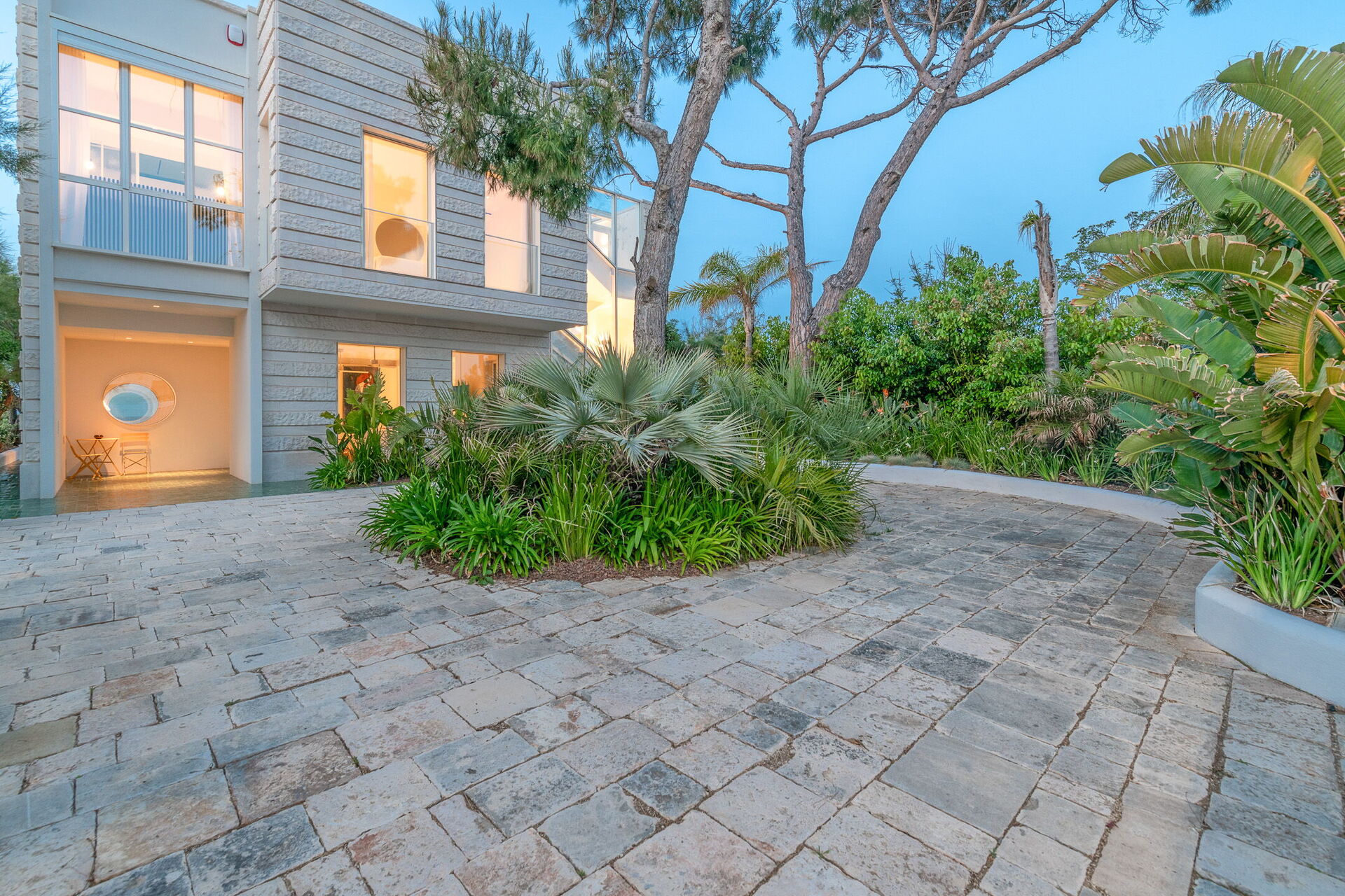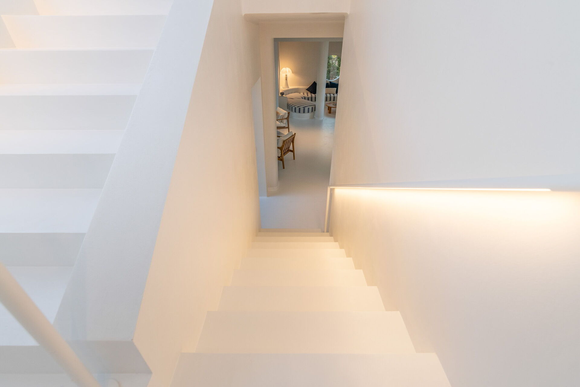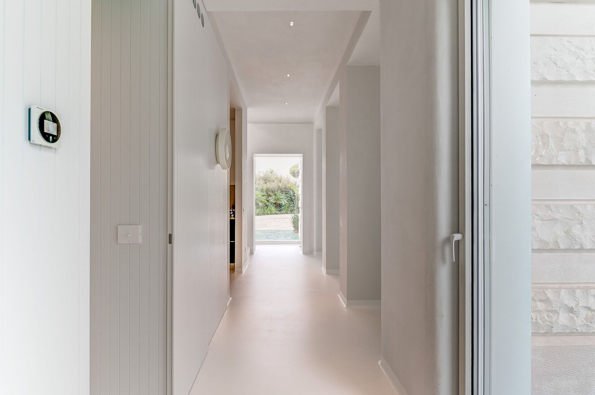 The villa has a living area on the ground floor and 5 bedrooms with private bathrooms on the first floor. The recently renovated property features contemporary furnishings and design elements that evoke the sea.
