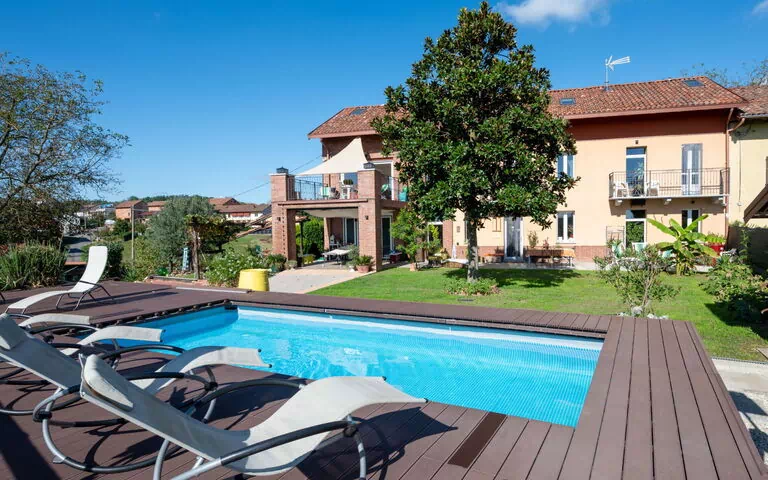Moderne, smuk feriehytte "Helix1912", ensidig tilbygget, omgivet af græsmarker, marker og vingård. Uden for byen, 3 km fra bymidten af San Damiano d'Asti, solrige beliggenhed på en bakke. Til medbenyttelse: grund 1'500 m2 (indhegnet), velplejet have med blomster og træer. Til alene benyttelse: pool (7 x 3 m, 130 cm dyb, Sæsonbestemt tilgængelighed: 01.Maj. - 01.Okt.). Udendørs brus, terrasse, Underholdning af poolen af ejeren/gartneren. Tilkørsel til til huset. Parkeringsplads (for 3 biler) ved huset. Supermarked 3 km, restaurant 3 km, busstoppested 1.5 km, banegård "Asti" 15 km. Nærliggende attraktioner: Asti 15 km, Turin 60 km, Alba 35 km. Bemærk venligst: bil anbefales. Ejeren bor i et separat parcelhus. Ejeren har en hund.