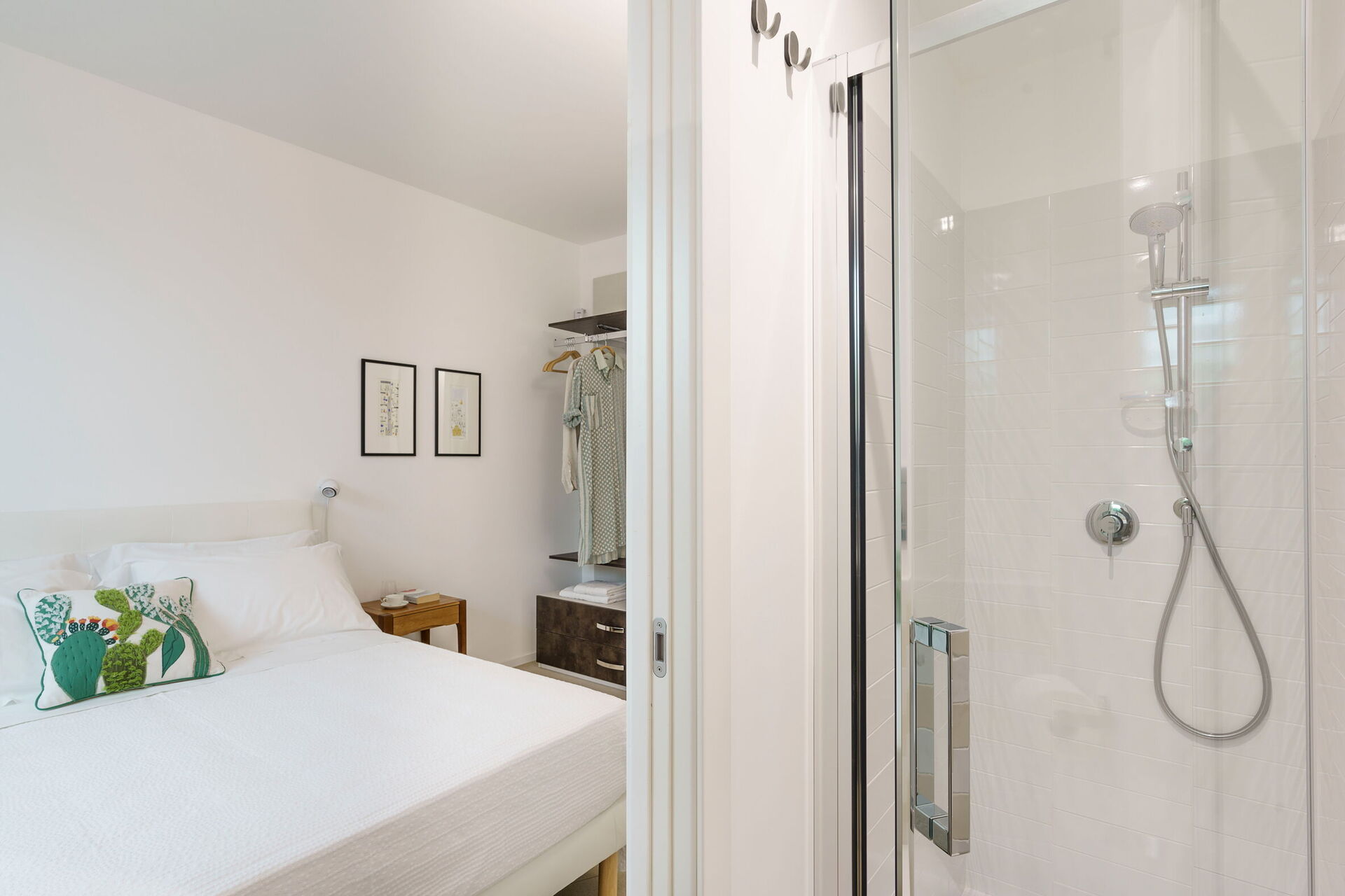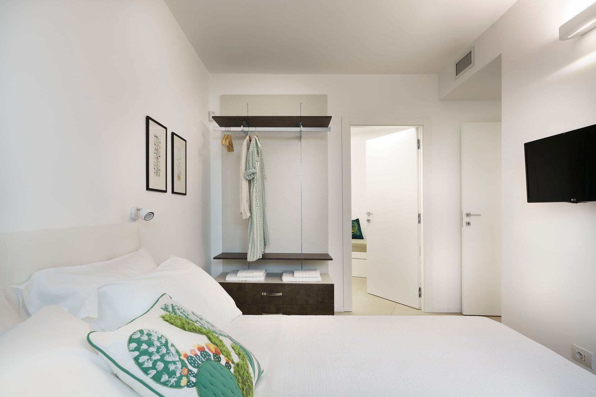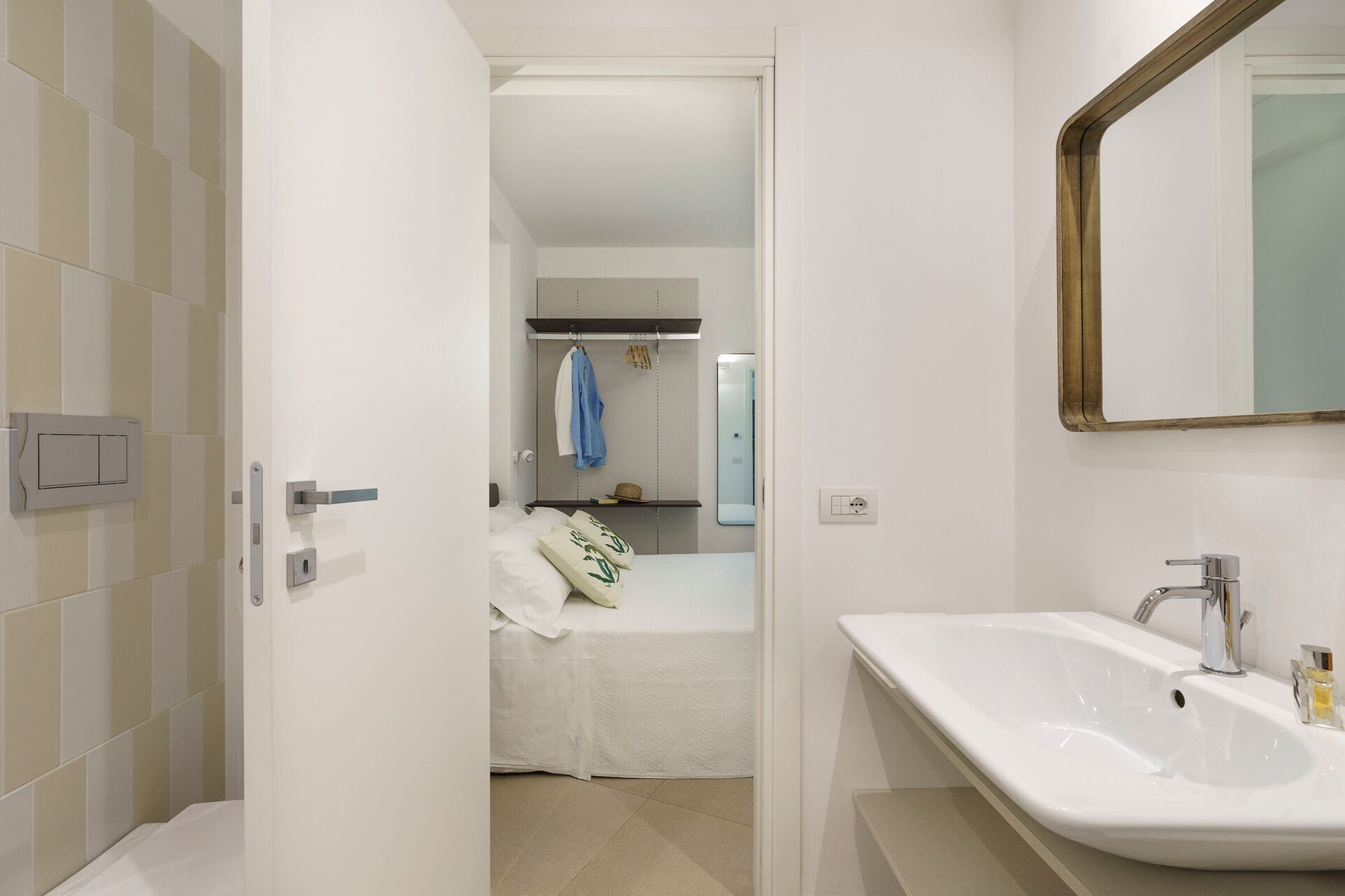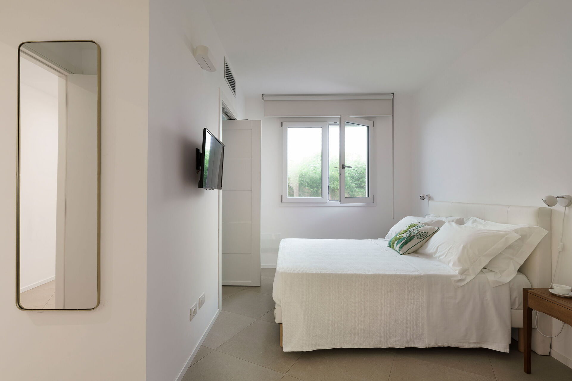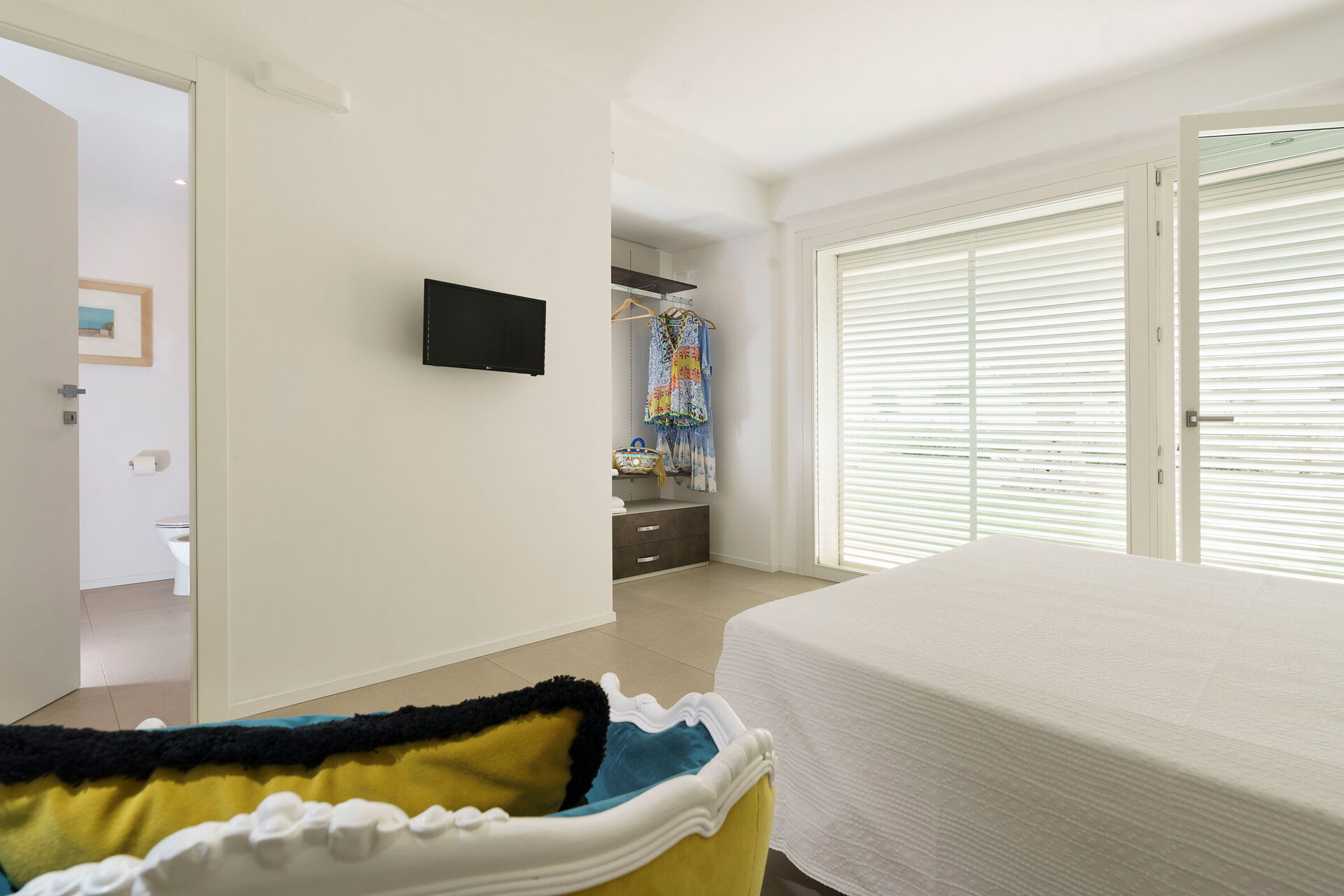 Soveværelse med bad 1: dobbeltseng, vugge, WIFI internet, internet, klimaanlæg, myggenet, satellit tv, lænestol, vask, wc, bidet, bruser, hårtørrer, badeværelse uden vindue, udgang til terrasse.