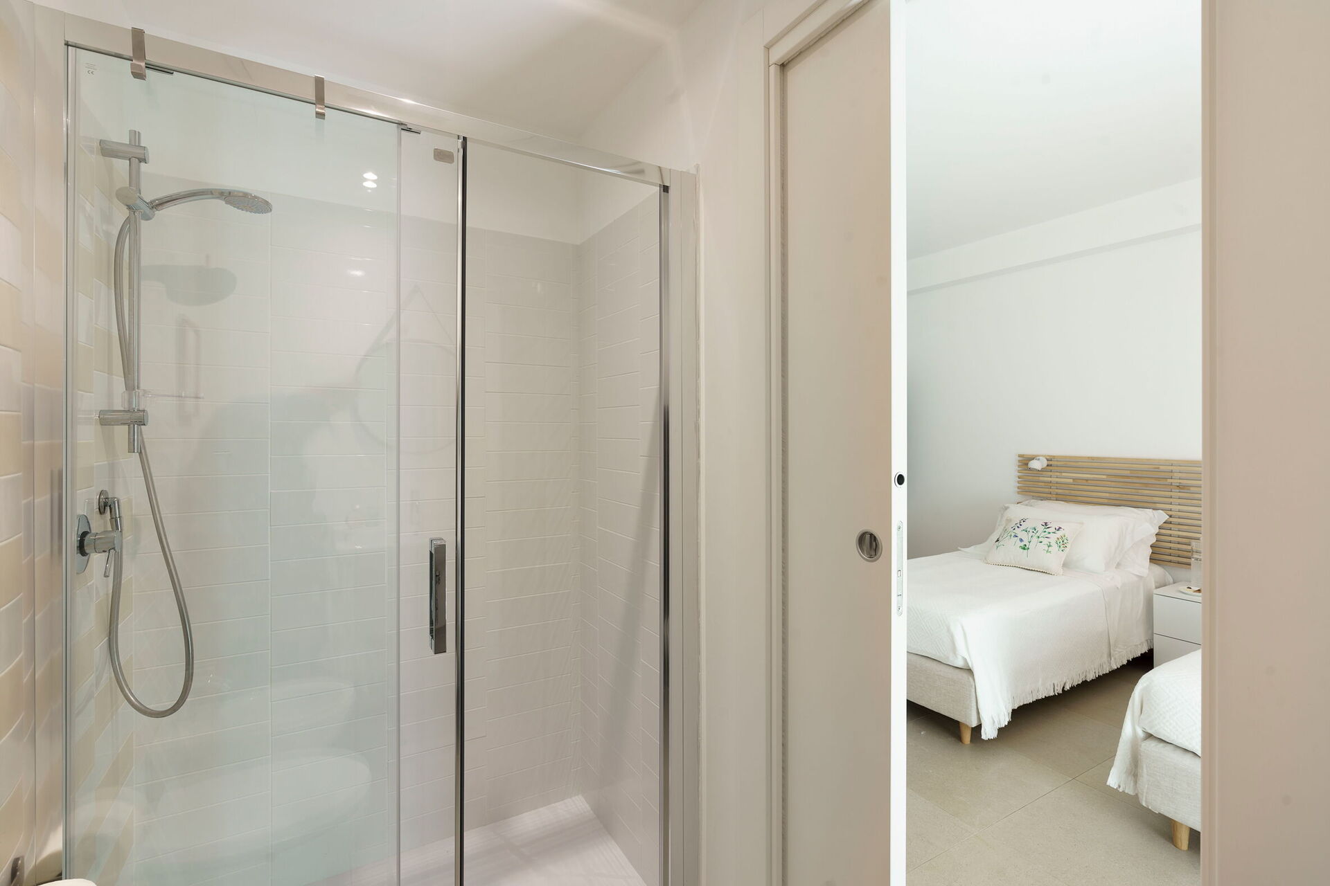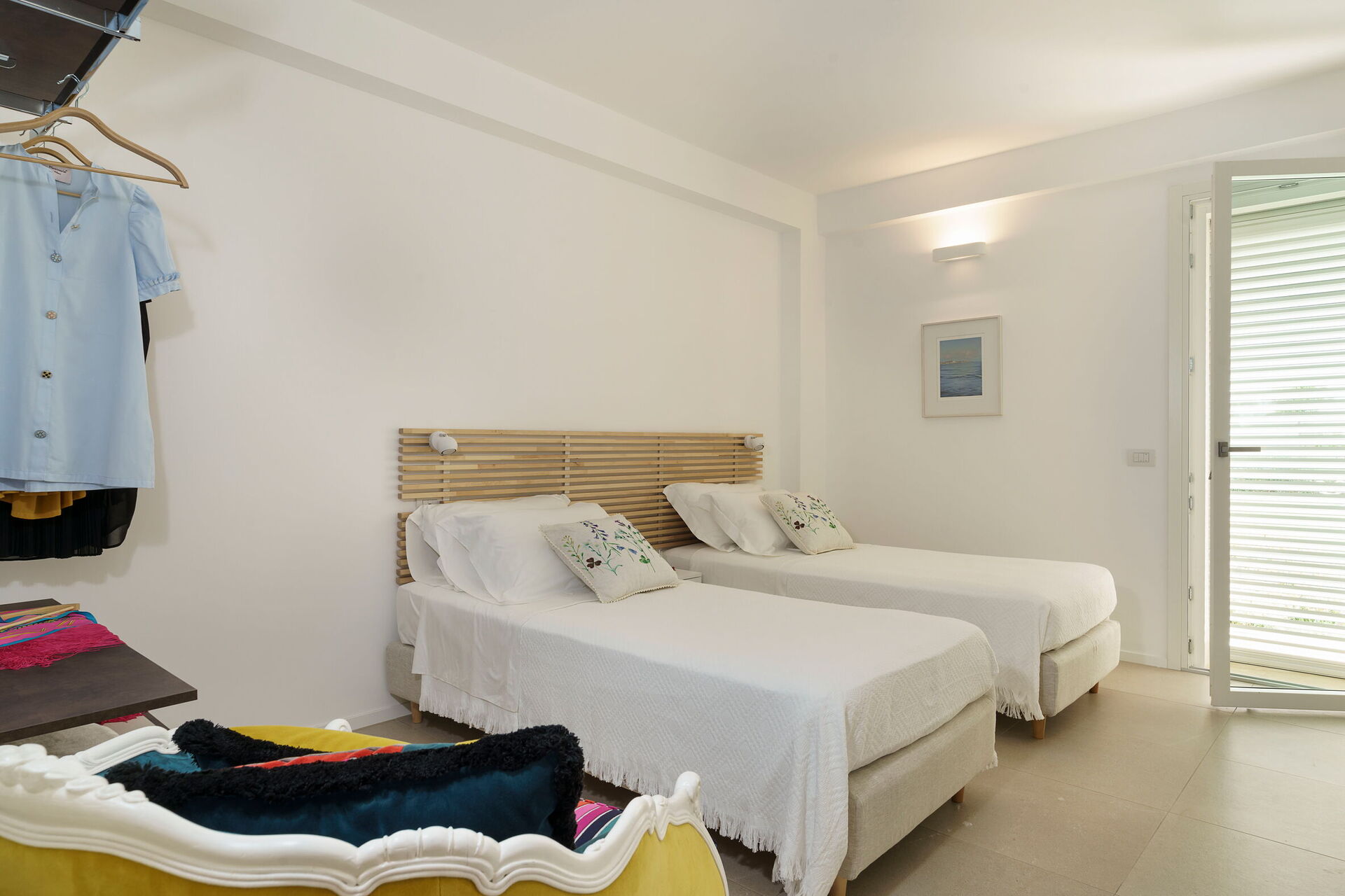 Soveværelse med bad 4: to enkeltsenge, WIFI internet, internet, klimaanlæg, myggenet, satellit tv, lænestol, vask, wc, bidet, bruser, hårtørrer, udgang til terrasse.
