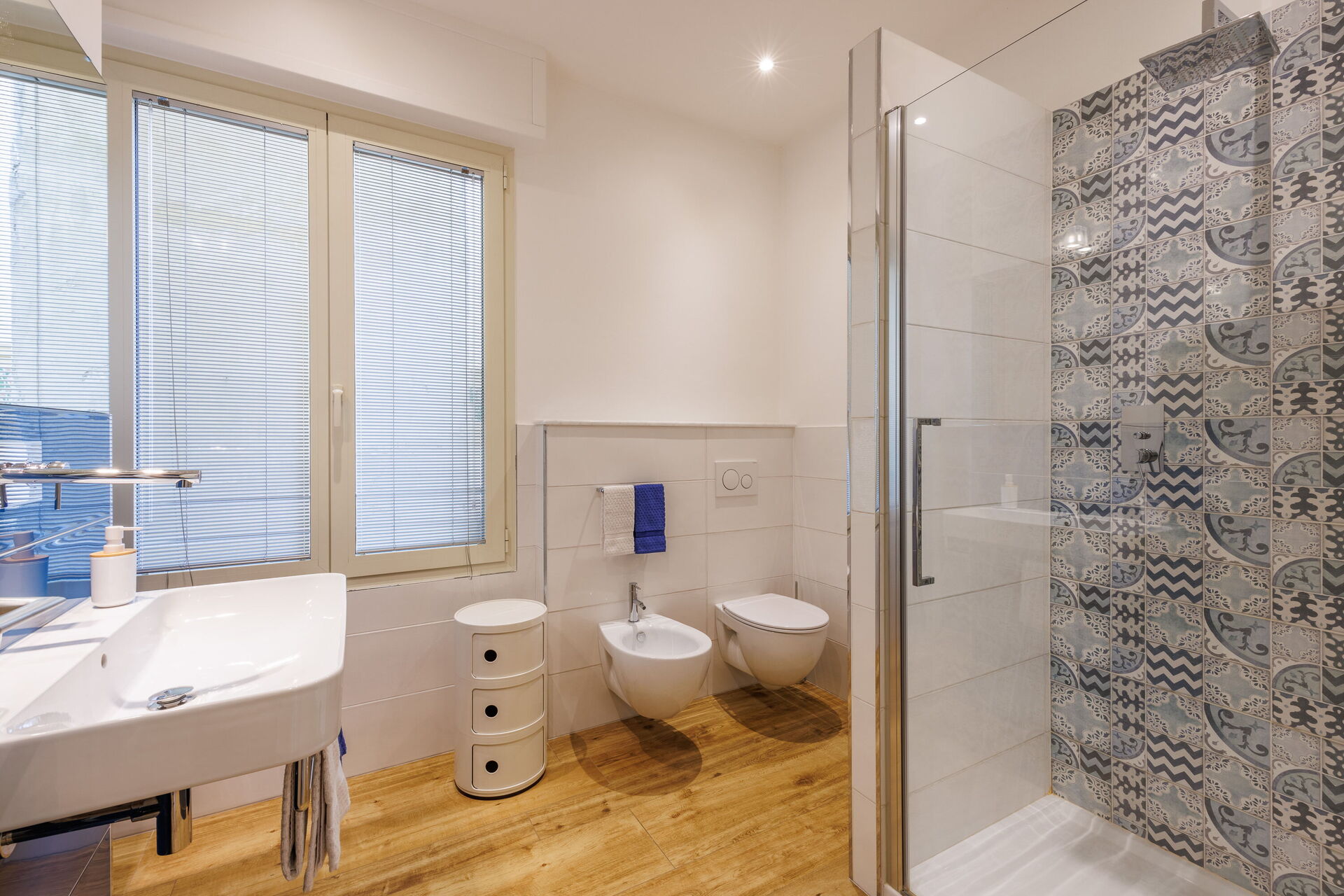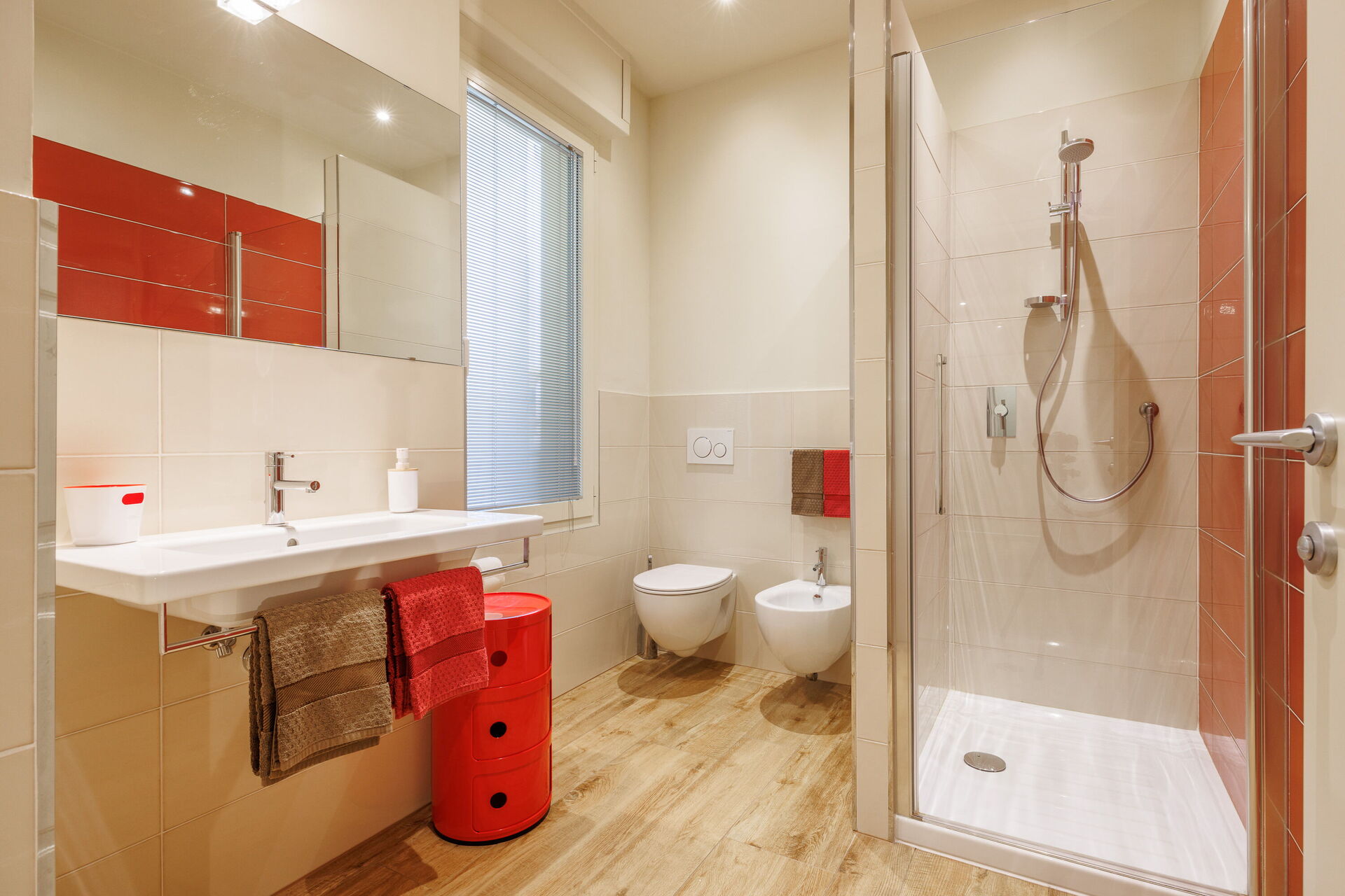 Soveværelse med bad 1: dobbeltseng, WIFI internet, klimaanlæg, satellit tv, satellit tv, vask, wc, bidet, bruser, hårtørrer.