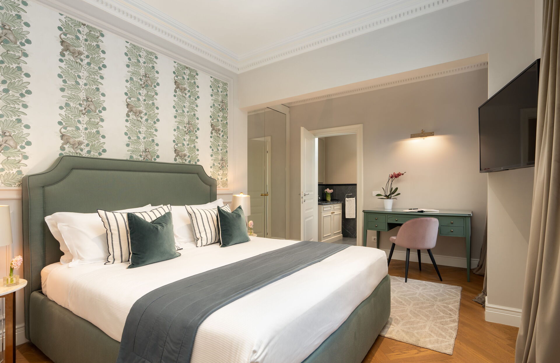 Soveværelse med bad 3: dobbeltseng, WIFI internet, klimaanlæg, satellit tv, vask, wc, bidet, bruser.