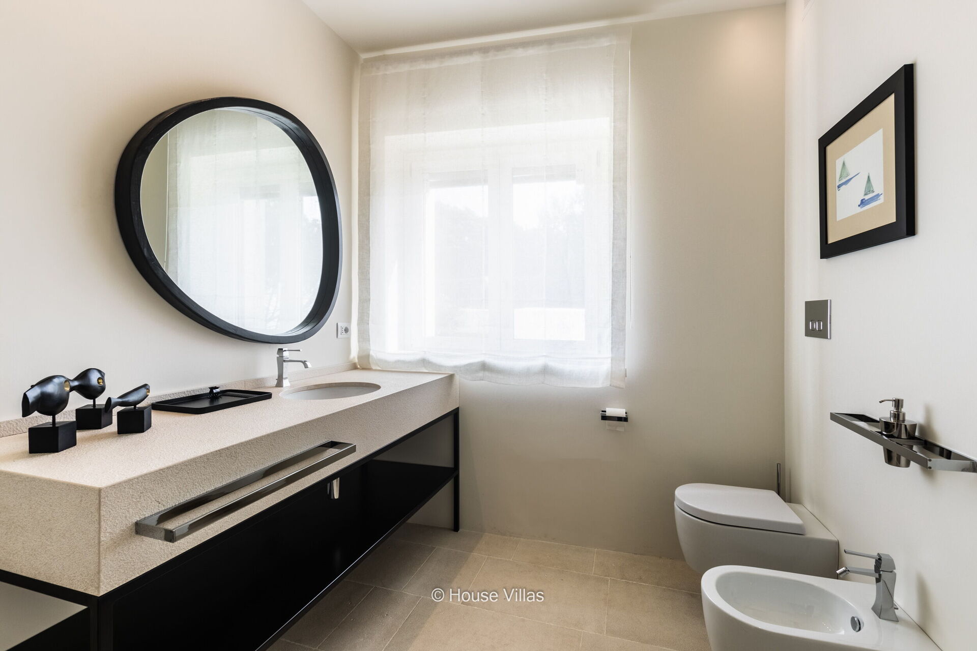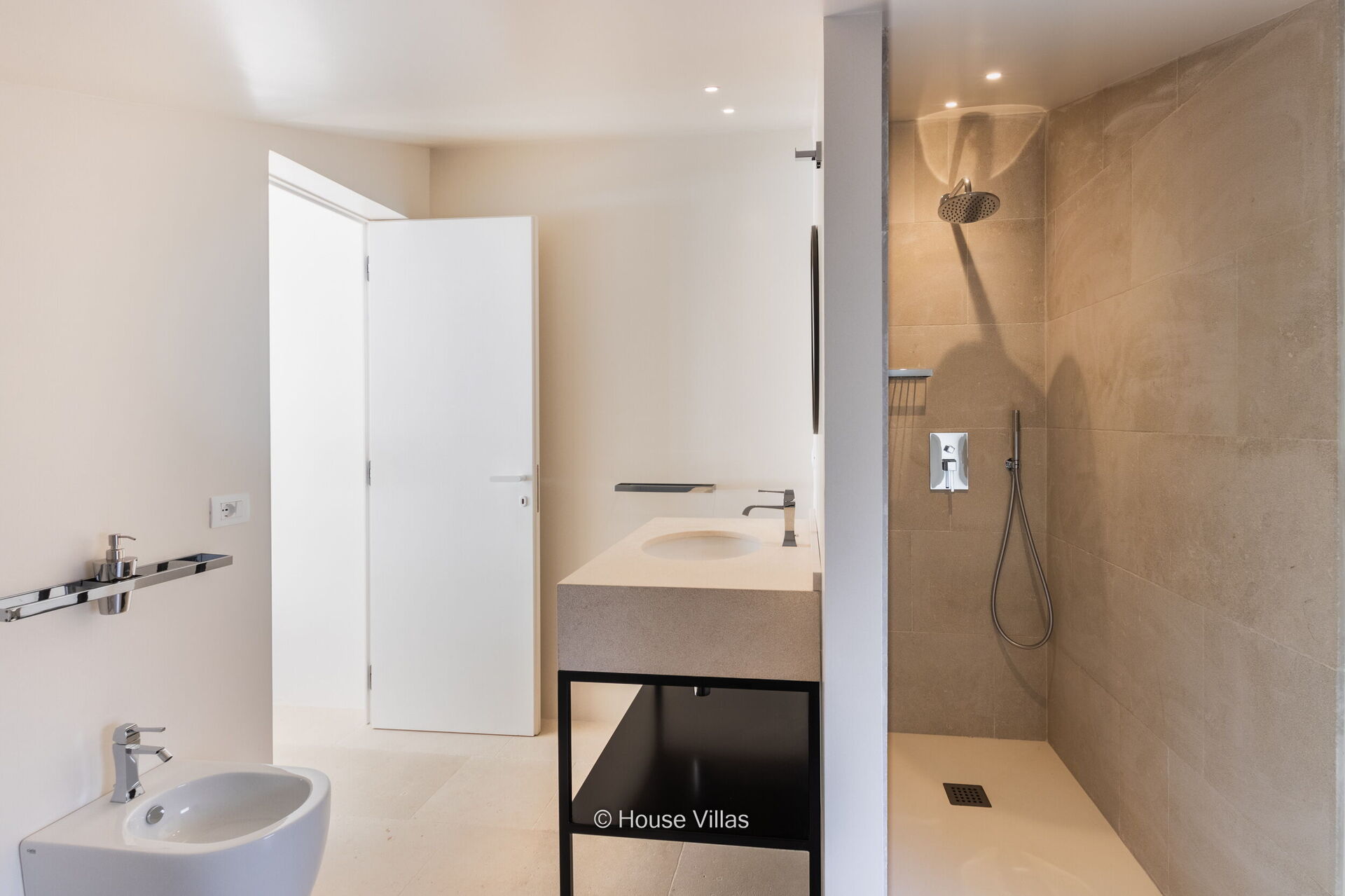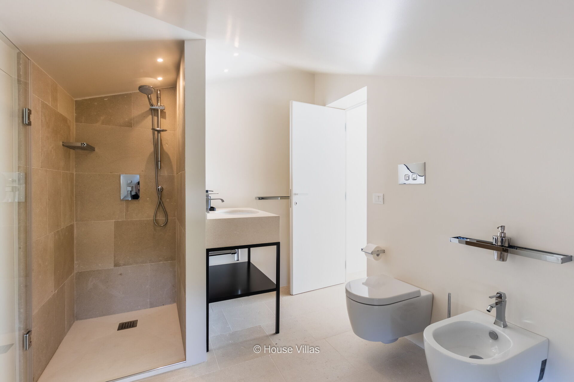 Soveværelse med bad 1: dobbeltseng, WIFI internet, klimaanlæg, pengeskab, vask, wc, bidet, bruser, hårtørrer, badeværelse uden vindue, udgang til terrasse.