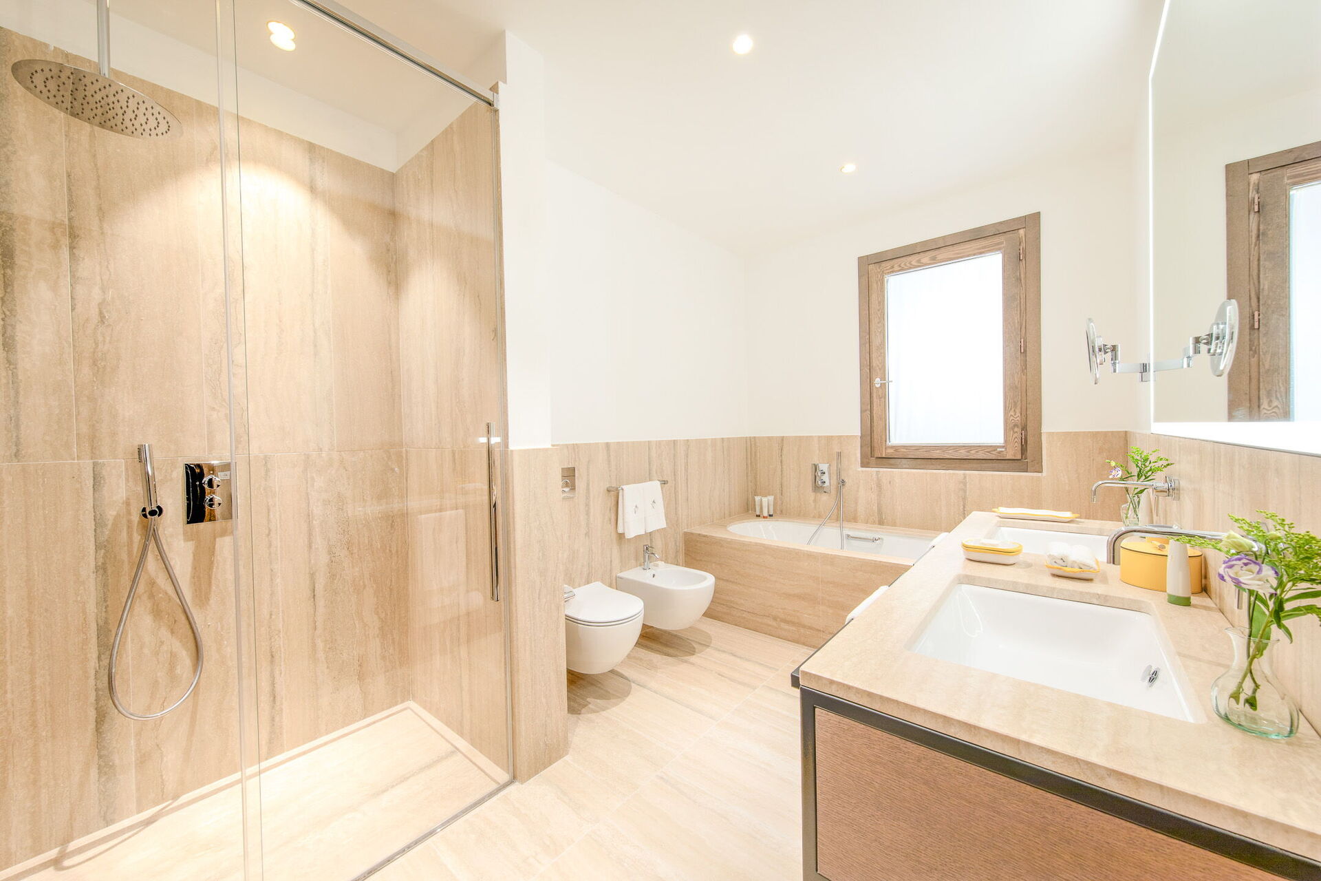 Bedroom + Ensuite Bathroom 1: king size bed (length: 2m, width: 1.8m), working desk, television, safe, air conditioning, toilet, bidet, shower, bathtub, double basin, hairdryer, WIFI internet, exit to the balcony.