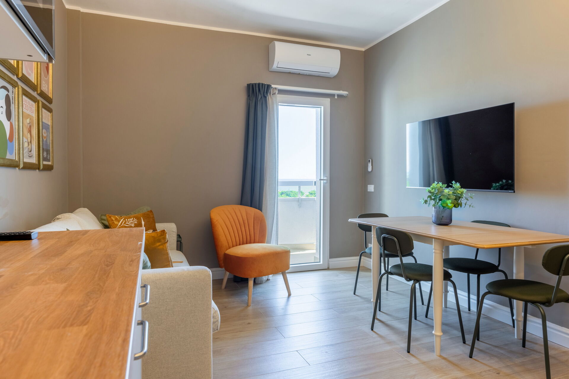 Køkken - stue: veludstyret køkken, spisebord, køleskab, fryser, kogeplader, ovn, strygejern, italiensk kaffemaskine, lænestol, dobbelt sovesofa, WIFI internet, klimaanlæg, satellit tv.