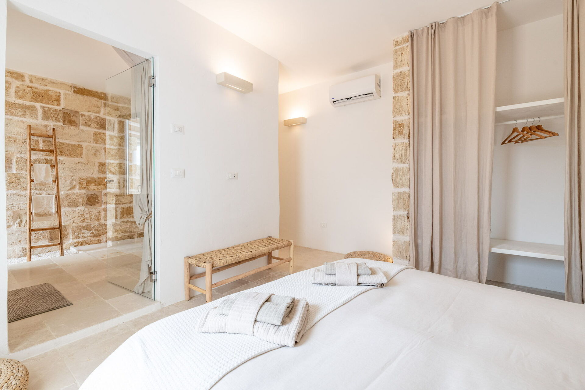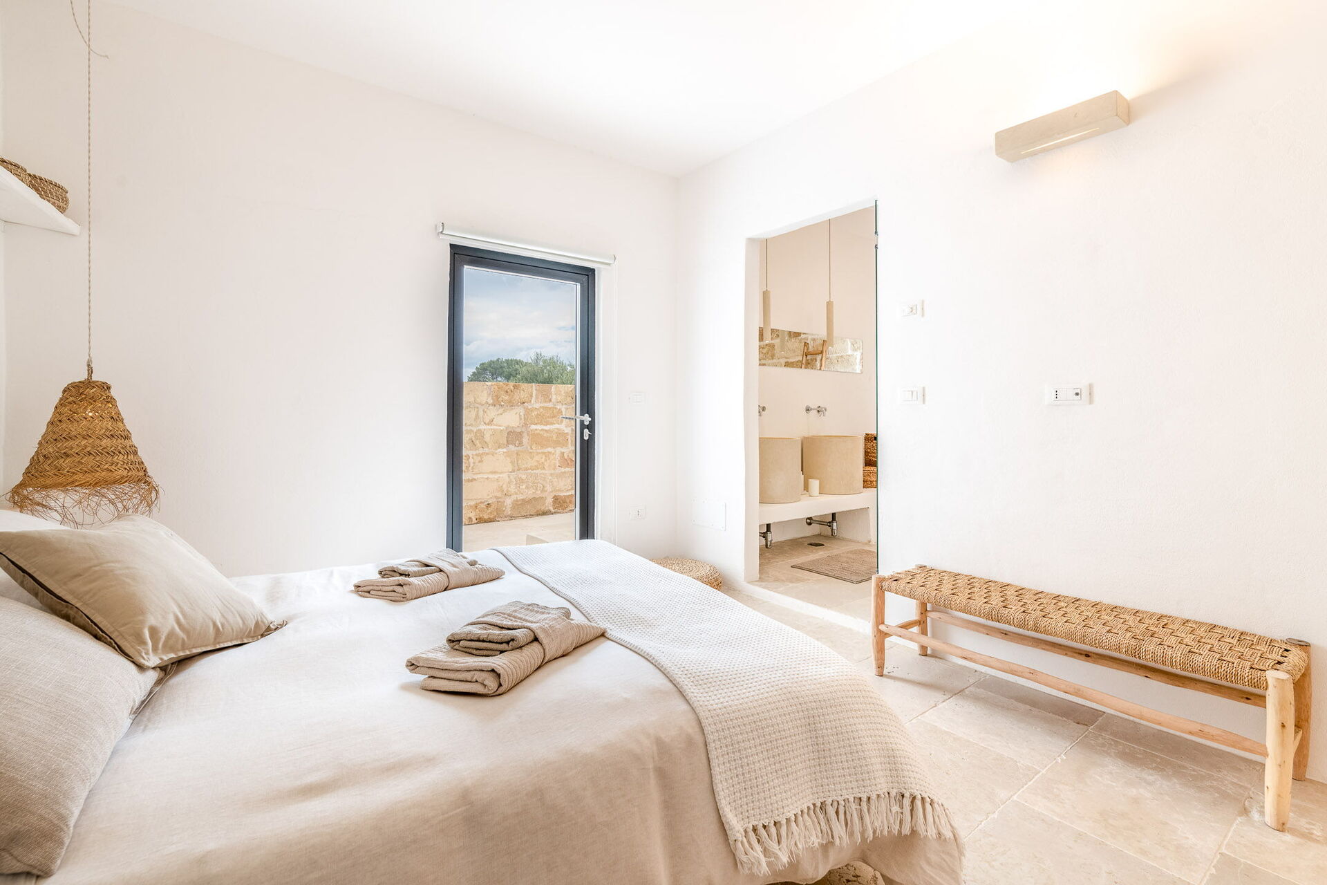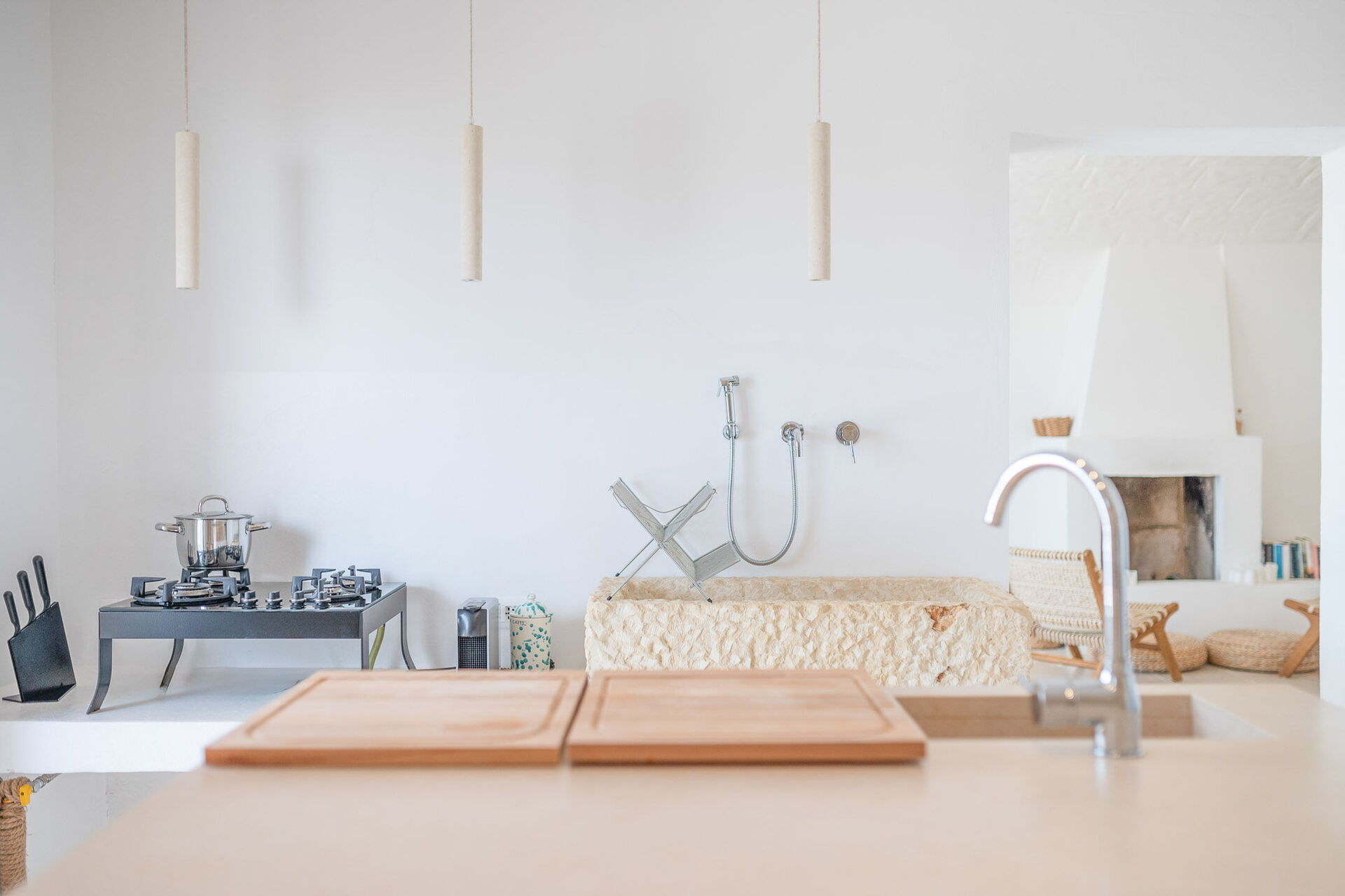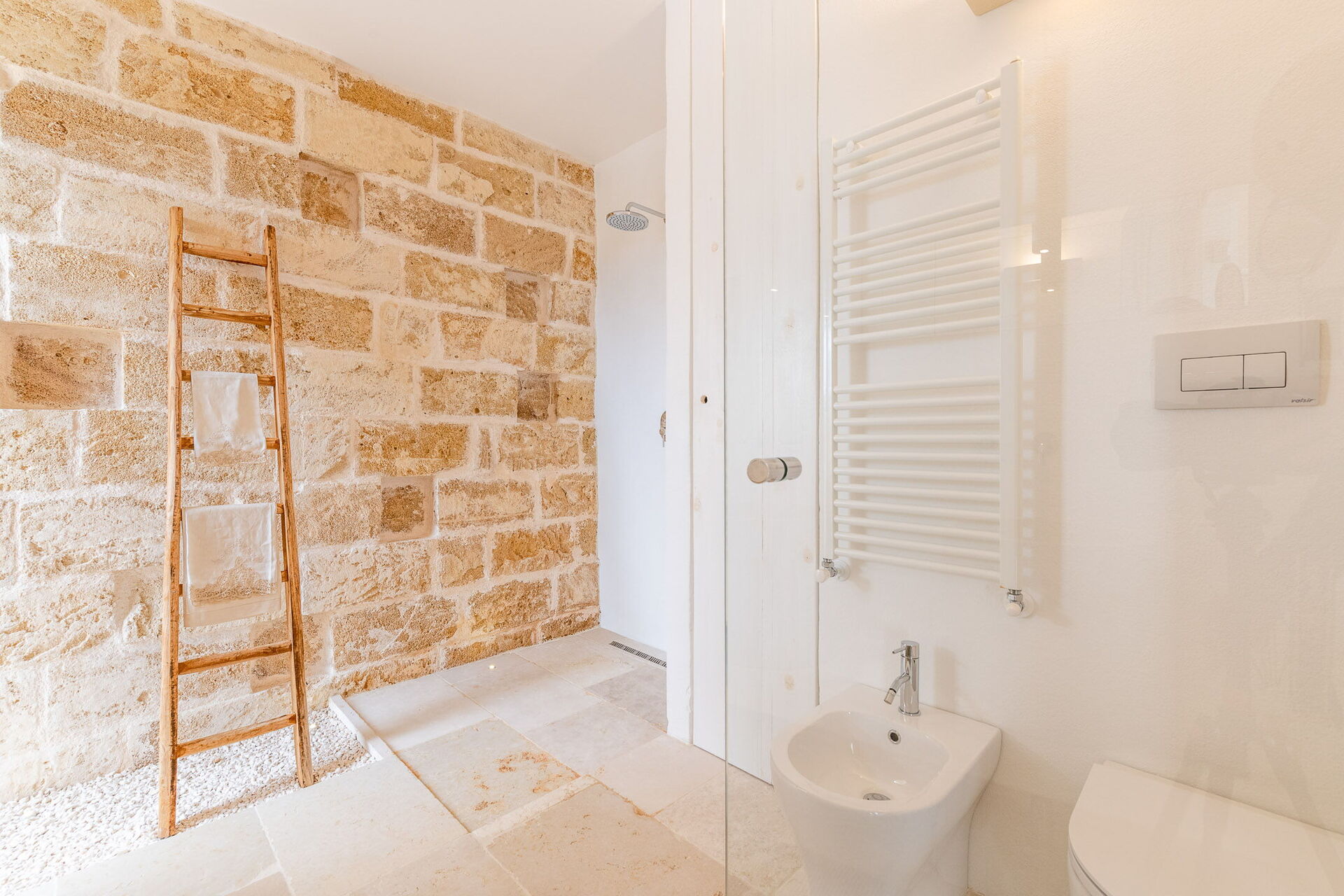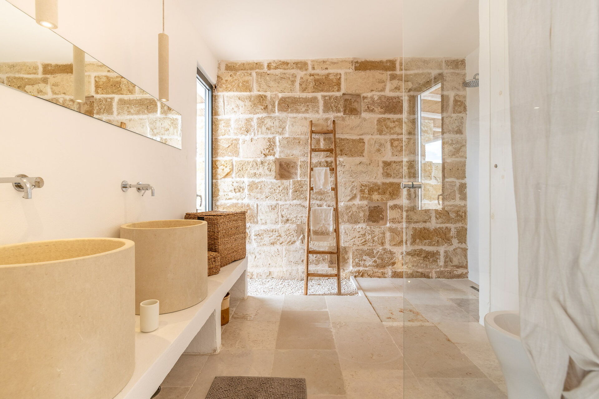 Upon entering the main building, guests will find a large living room with comfortable sofas, a fireplace, and a TV. Accessible from the living room, the well-appointed kitchen serves as the connection to the sleeping quarters. The three double bedrooms are elegantly furnished with a simple and stylish design, boasting features such as exposed stone walls, wooden accents, open wardrobes, double beds, bedside tables, and reading lights. Two of the bedrooms come with en-suite bathrooms, while the third shares a bathroom with the living area. The bathrooms are equipped with all the necessities including a toilet, bidet, sink, mirror, and a shower.