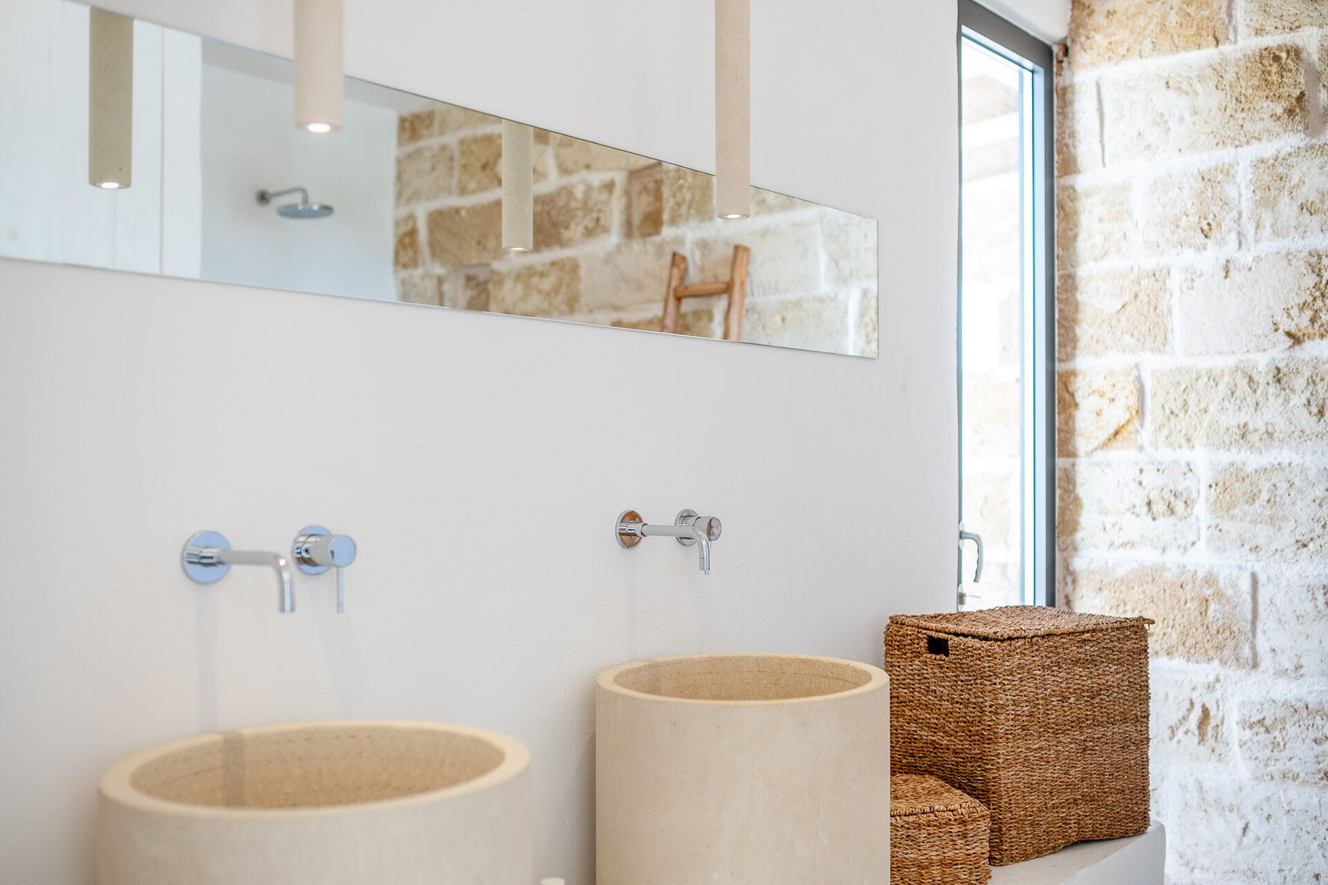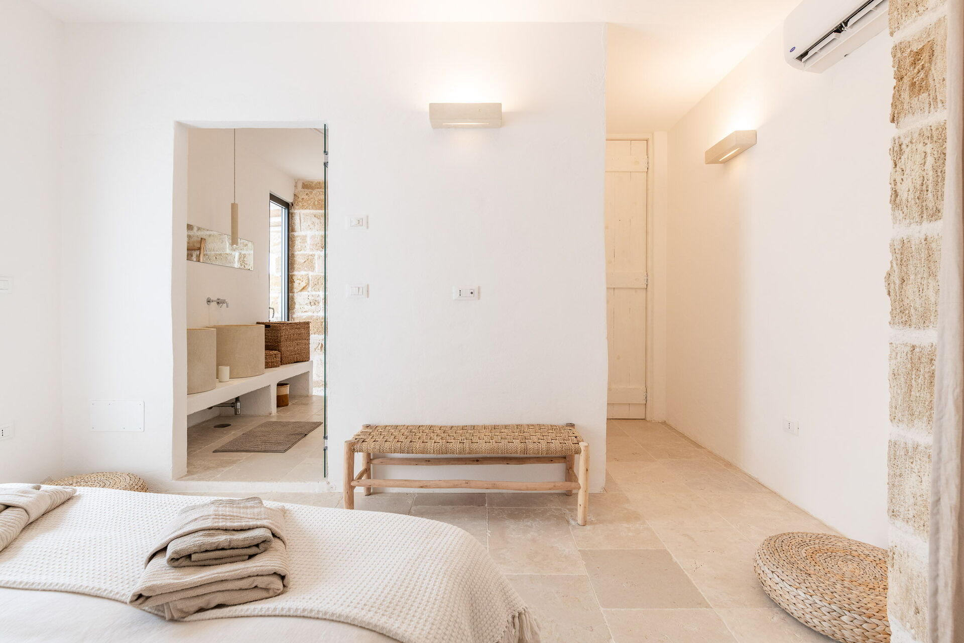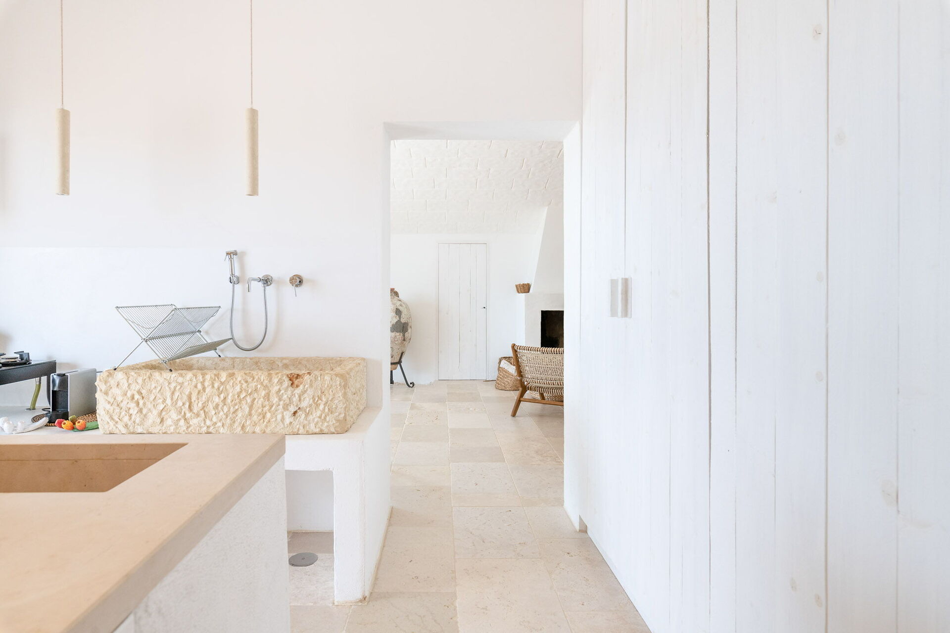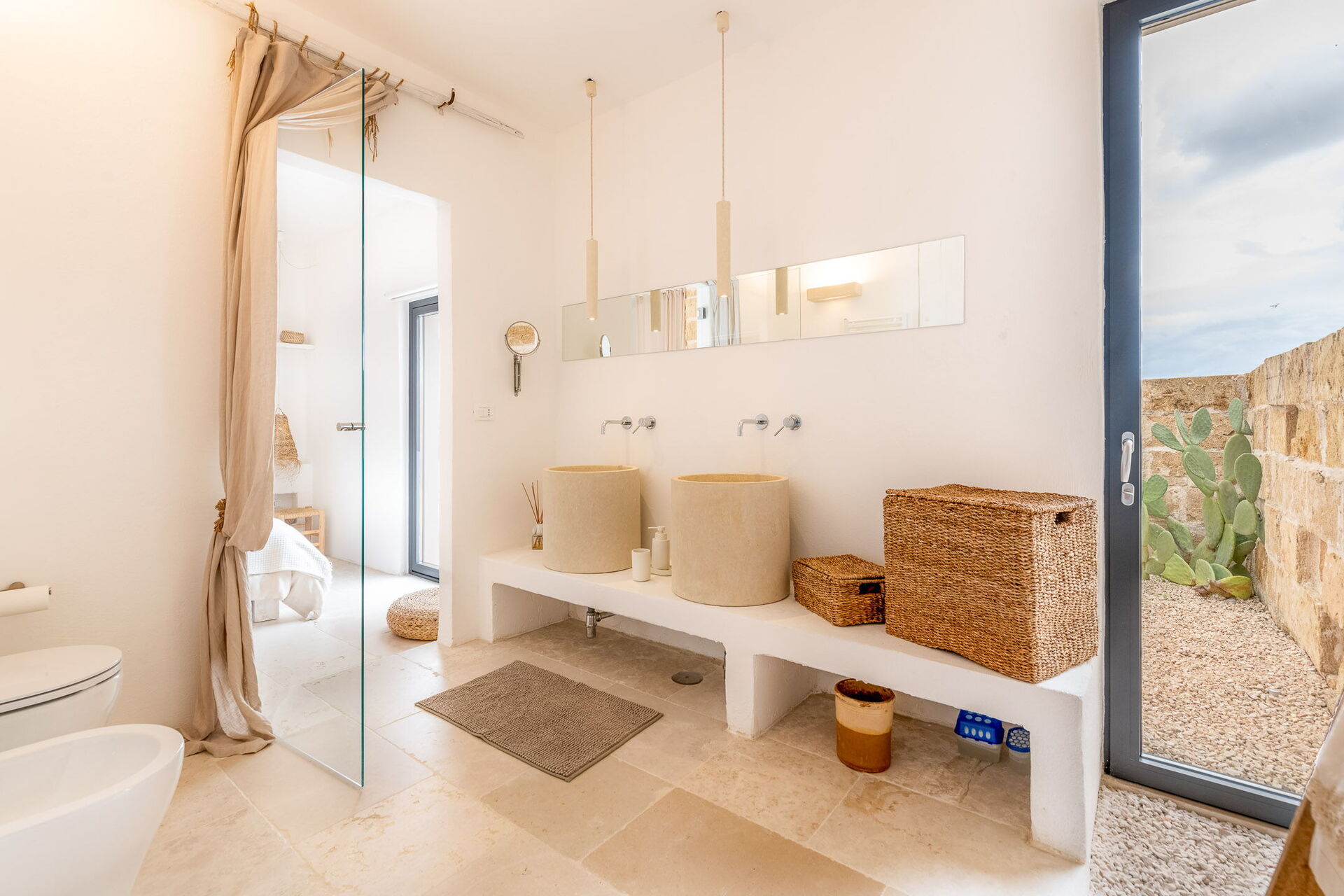 Upon entering the main building, guests will find a large living room with comfortable sofas, a fireplace, and a TV. Accessible from the living room, the well-appointed kitchen serves as the connection to the sleeping quarters. The three double bedrooms are elegantly furnished with a simple and stylish design, boasting features such as exposed stone walls, wooden accents, open wardrobes, double beds, bedside tables, and reading lights. Two of the bedrooms come with en-suite bathrooms, while the third shares a bathroom with the living area. The bathrooms are equipped with all the necessities including a toilet, bidet, sink, mirror, and a shower.
