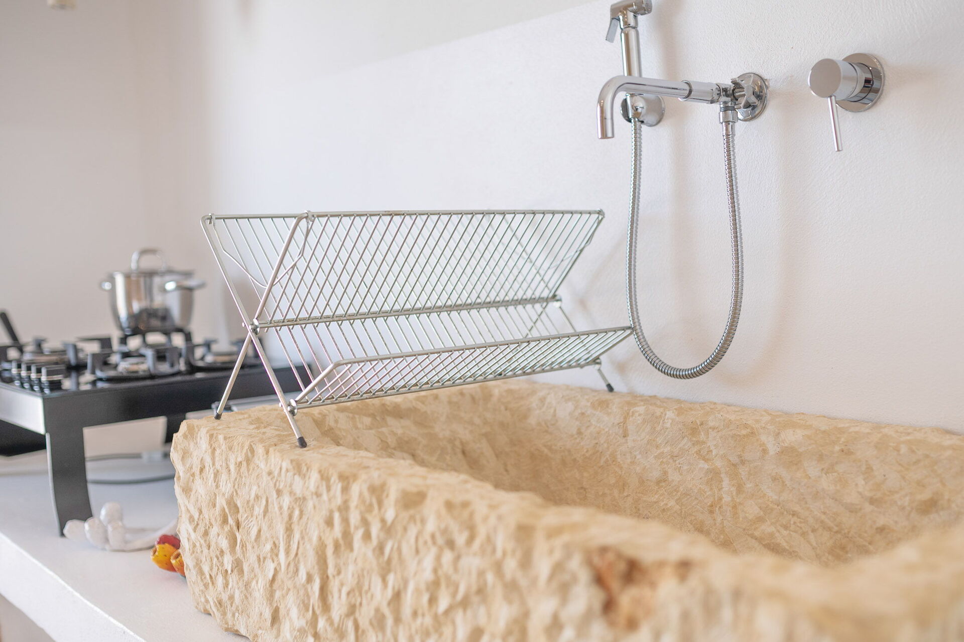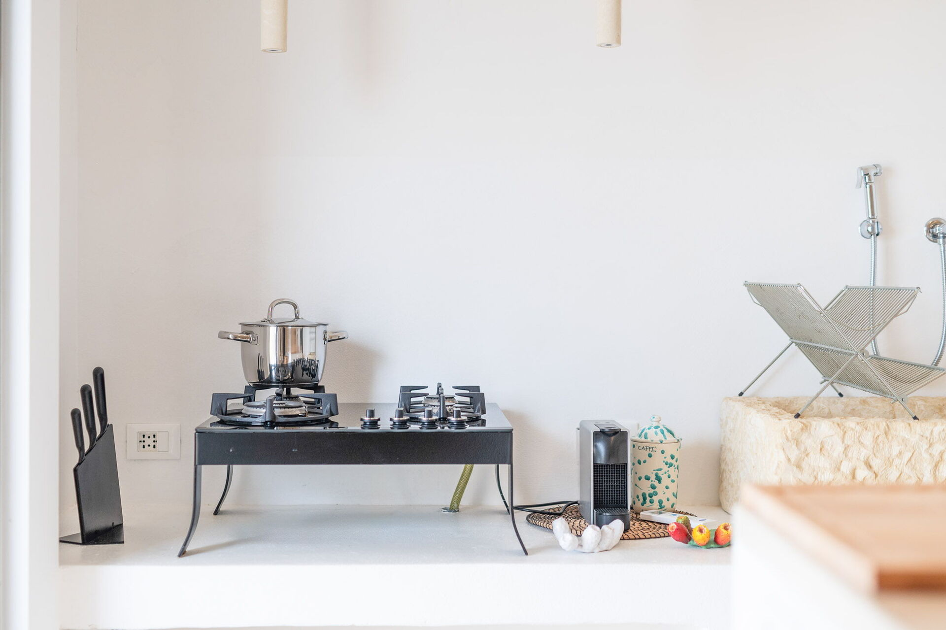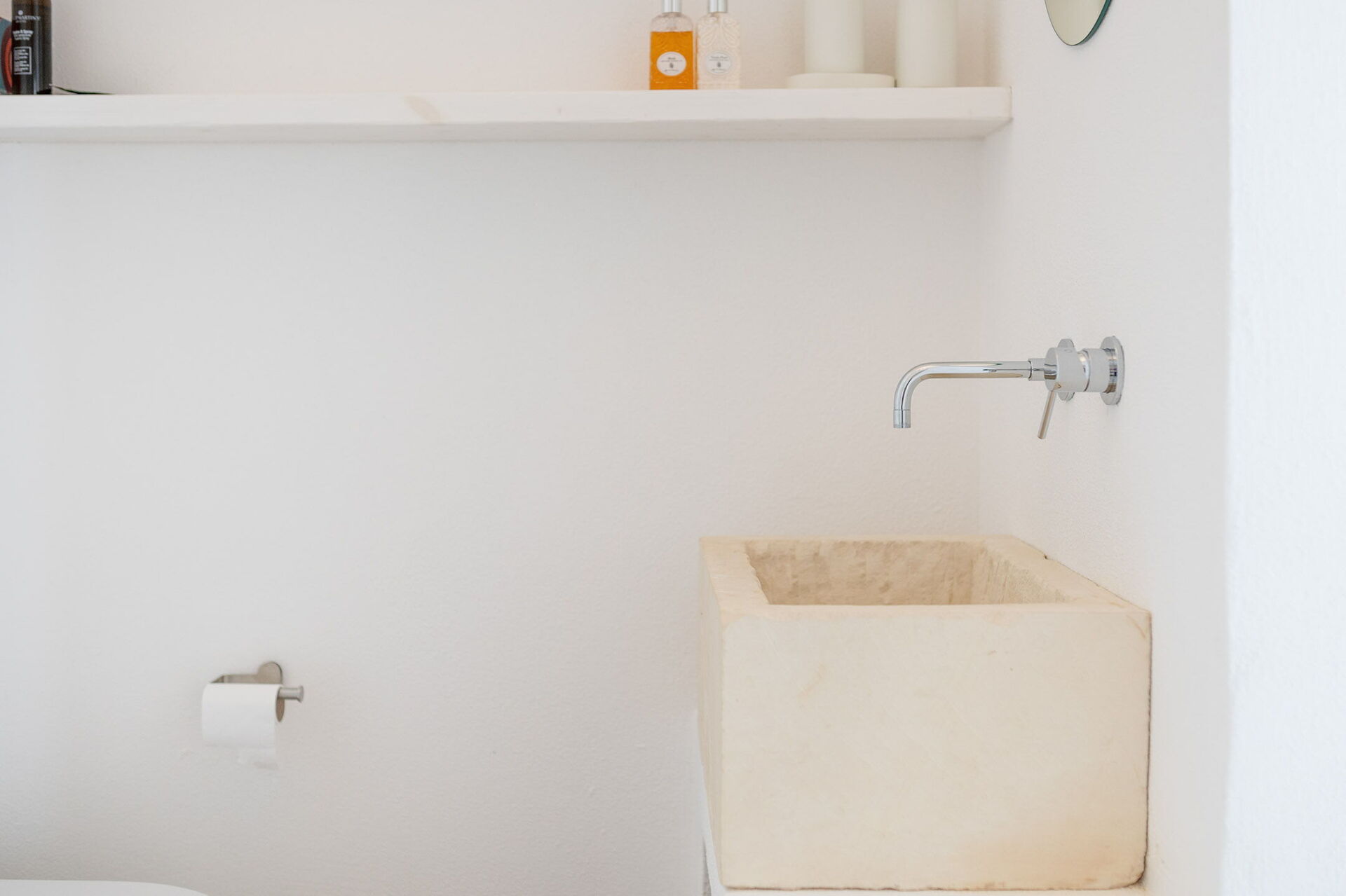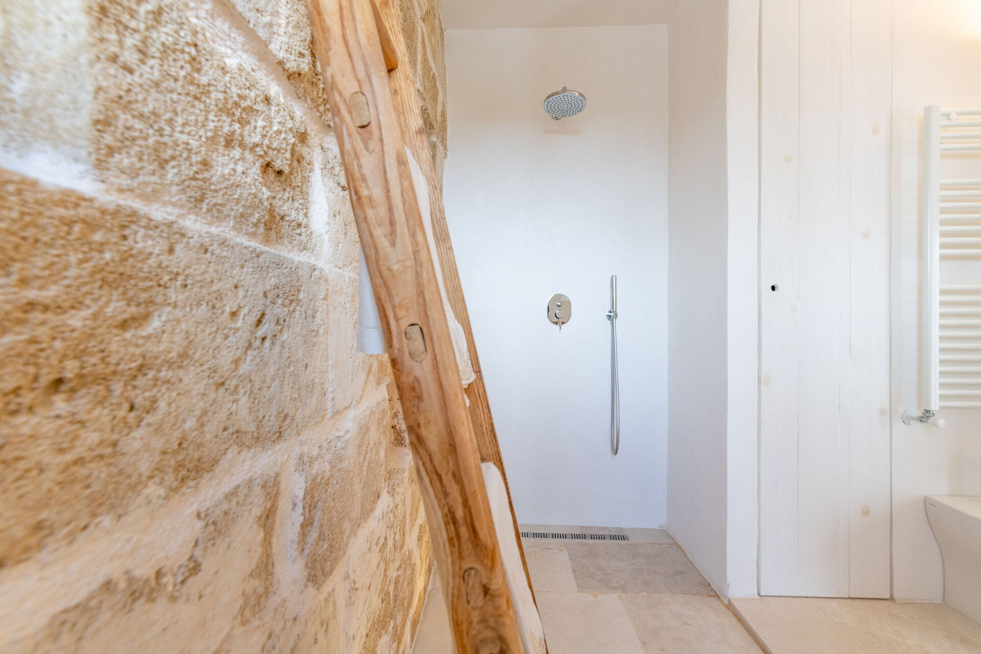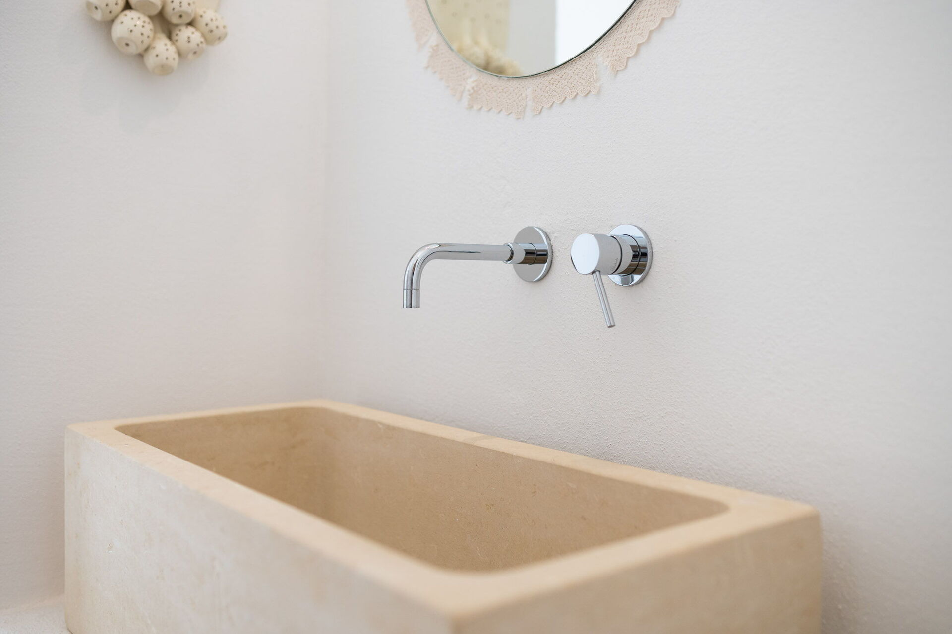 Upon entering the main building, guests will find a large living room with comfortable sofas, a fireplace, and a TV. Accessible from the living room, the well-appointed kitchen serves as the connection to the sleeping quarters. The three double bedrooms are elegantly furnished with a simple and stylish design, boasting features such as exposed stone walls, wooden accents, open wardrobes, double beds, bedside tables, and reading lights. Two of the bedrooms come with en-suite bathrooms, while the third shares a bathroom with the living area. The bathrooms are equipped with all the necessities including a toilet, bidet, sink, mirror, and a shower.