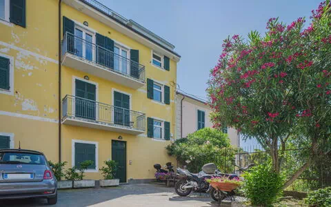 Lille lejlighedshus. Ovenfor Moneglia, i lille byen Lemeglio, 2.2 km fra bymidten af Moneglia, høj beliggenhed ved bakke, 2.2 km fra havet, i en blind vej. I huset: elevator, tagterrasse. Offentlige parkeringspladser 50 m. Supermarked 2 km, restaurant 200 m, busstoppested 50 m, banegård "Moneglia" 2.5 km. Bemærk venligst: bil anbefales.