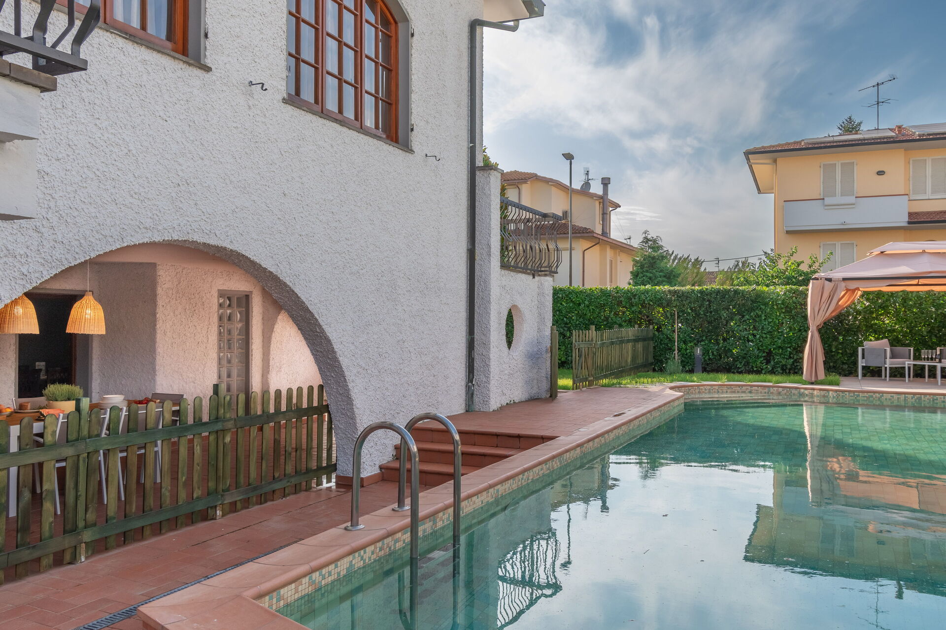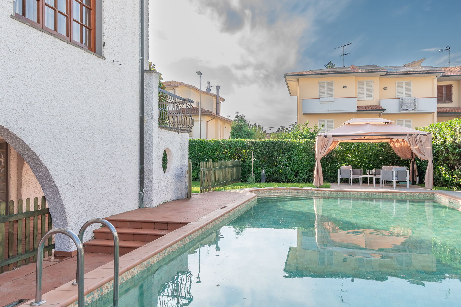 Have: swimmingpool (privat, bredde: 6m, længde: 13m, dybde: 1.5m, max. dybde: 2m, min. dybde: 1m), WIFI internet, udendørs spiseplads, spisebord, havepavillon, havemøbel, liggestol, indhegnet, lukket ejendom.