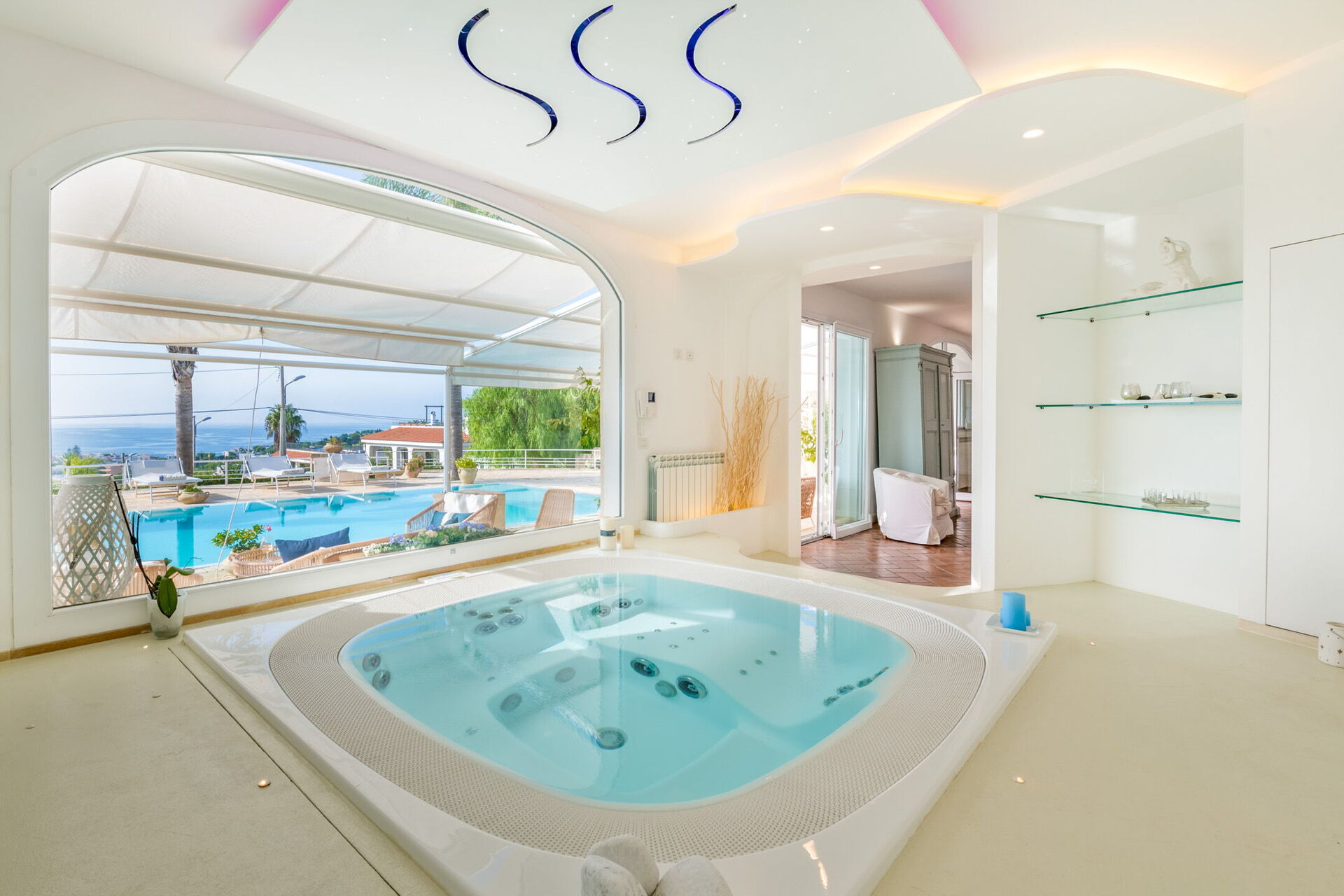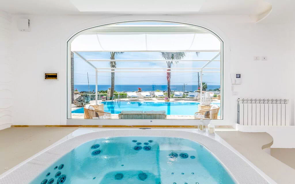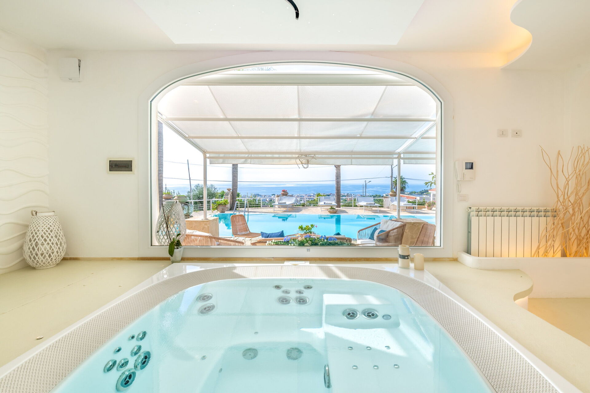 A splendid relaxation area with a jacuzzi, framed by a panoramic window that offers a breathtaking view, perfect for moments of pure well-being.