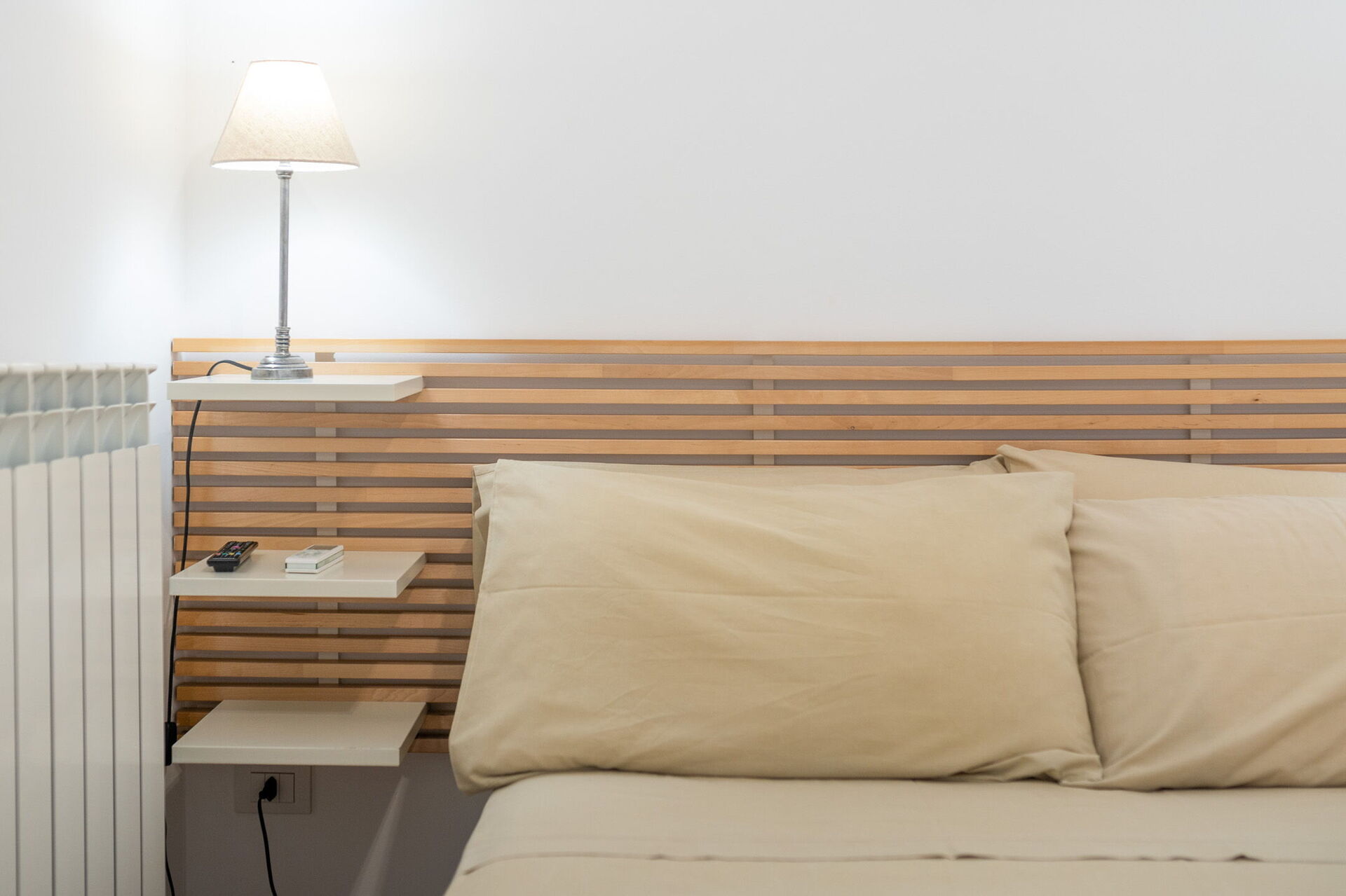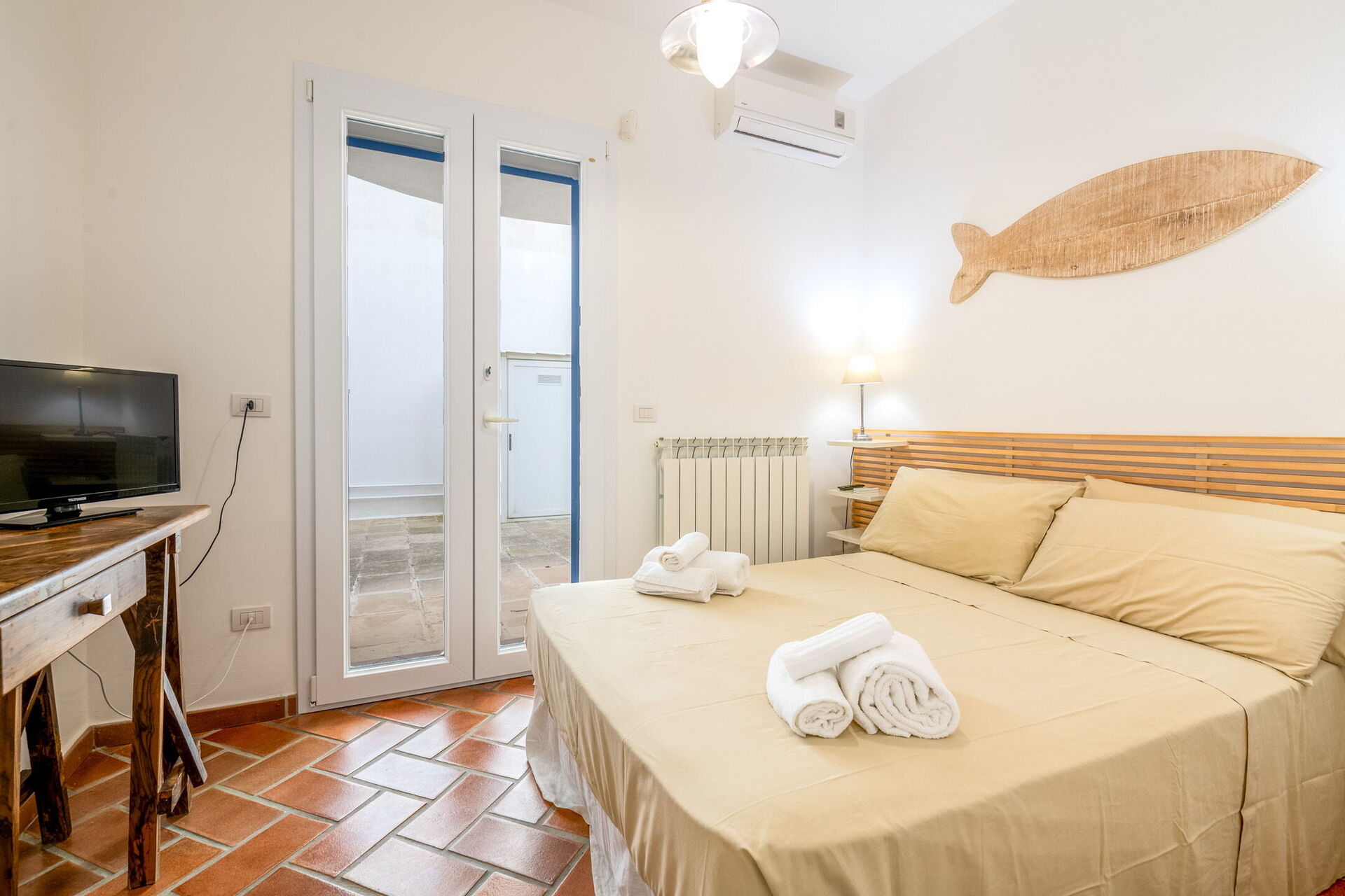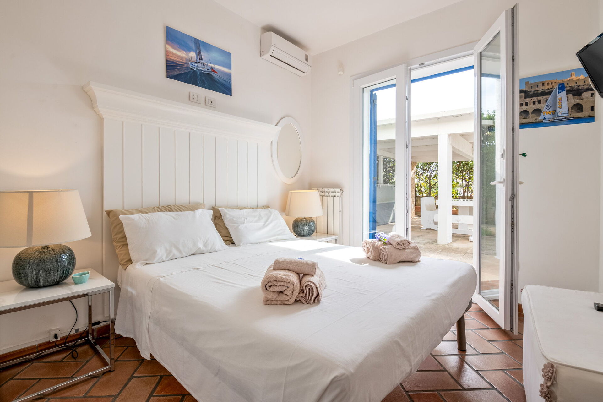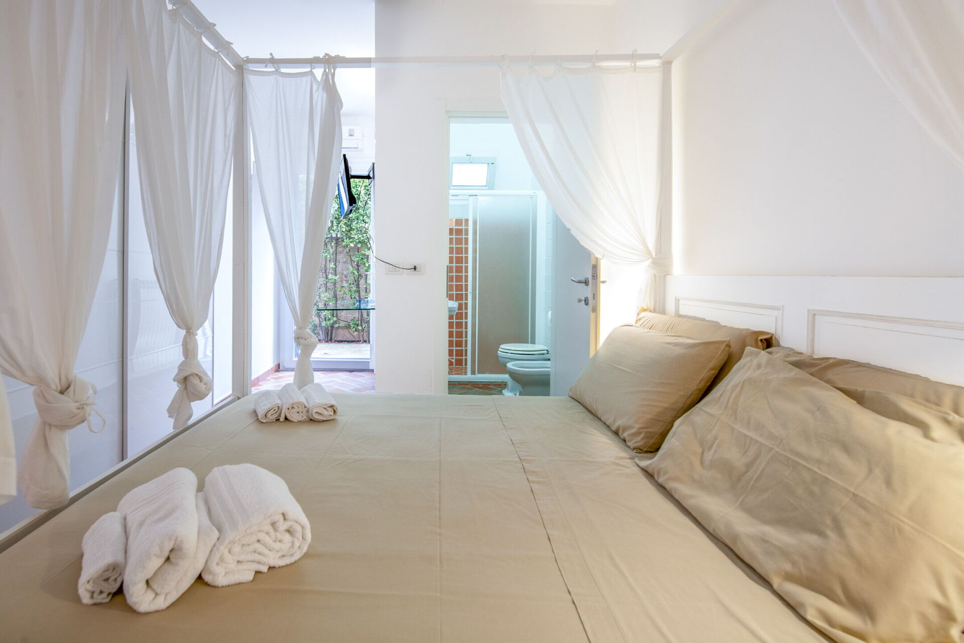 Bedroom + Ensuite Bathroom 1: double bed (length: 1.9m, width: 1.6m), air conditioning, basin, bidet, toilet, shower, hairdryer, WIFI internet, exit to the garden.
