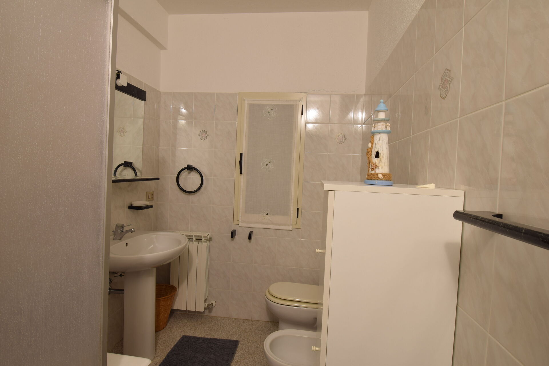 Badeværelse: vask, wc, bidet, bruser, vaskemaskine.