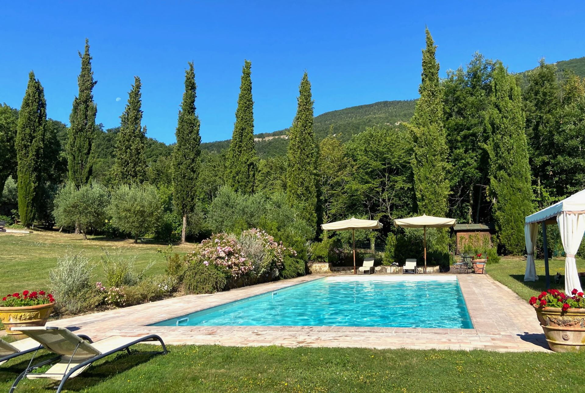 Villaen er omgivet af udstrakte haver afgrænset af frodige buske og modne træer, hvilket skaber en privat oase for afslapning. Swimmingpoolen, som ligger 80 meter fra hovedhuset, er smukt indrammet af rosenbuskadser og oliventræer og tilbyder en idyllisk ramme for afslappede dage under den toskanske sol. Gæster har eksklusiv adgang til flere udendørs underholdningsområder, herunder en stor møbleret loggia udstyret med komfortable sofaer og lænestole, perfekt til at nyde de milde middelhavskaftener. En rummelig pavillon har et spisebord og stole designet til måltider under åben himmel, mens et indbygget grillområde giver fremragende faciliteter til udendørs madlavning. Ejendommen inkluderer også en bowlingbane til rekreative aktiviteter og en charmerende pavillon ved poolen til afslapning ved poolsiden. En økologisk have er tilgængelig for gæster til at nyde friske produkter under deres ophold. Stueetagen åbner ud til en generøs møbleret terrasse, som problemfrit forbinder indendørs og udendørs opholdssteder og giver Dem mulighed for fuldt ud at omfavne skønheden i det omkringliggende toskanske landskab.