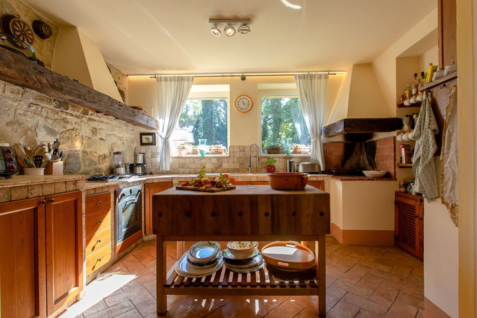 Villaen er udstyret med aircondition i alle fem soveværelser for at sikre behagelig hvile i de varme sommermåneder. Underholdningsmuligheder inkluderer satellit-tv, et fjernsyn, en videobåndoptager og et stereoanlæg med en iPod-dockingstation til Deres fornøjelse. Det fuldt udstyrede køkken har en opvaskemaskine, komfur, ovn, mikrobølgeovn, amerikansk kaffemaskine, køleskab, fryser, brødrister og en traditionel brændeovn til autentiske toskanske madlavningsoplevelser. Et dedikeret vaskerum rummer en vaskemaskine til Deres bekvemmelighed. Det udendørs grillområde inkluderer en indbygget grill, perfekt til tilberedning af middelhavsfestmåltider. De traditionelle pejse placeret i både opholdsstuen og køkkenet tilføjer rustik charme og autentisk toskansk karakter til villaen, og køkkenpejsen er tilgængelig til brug.