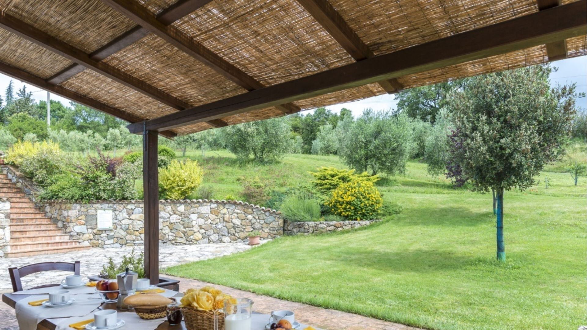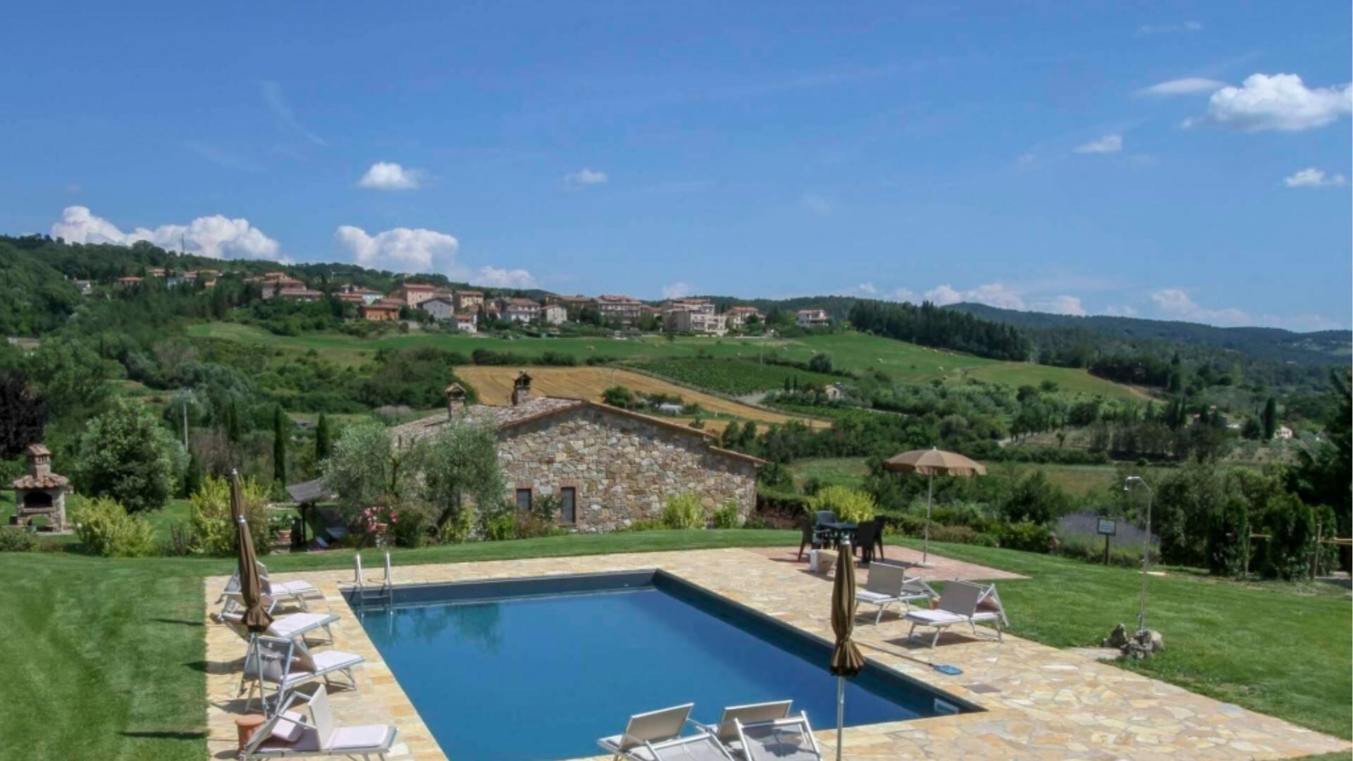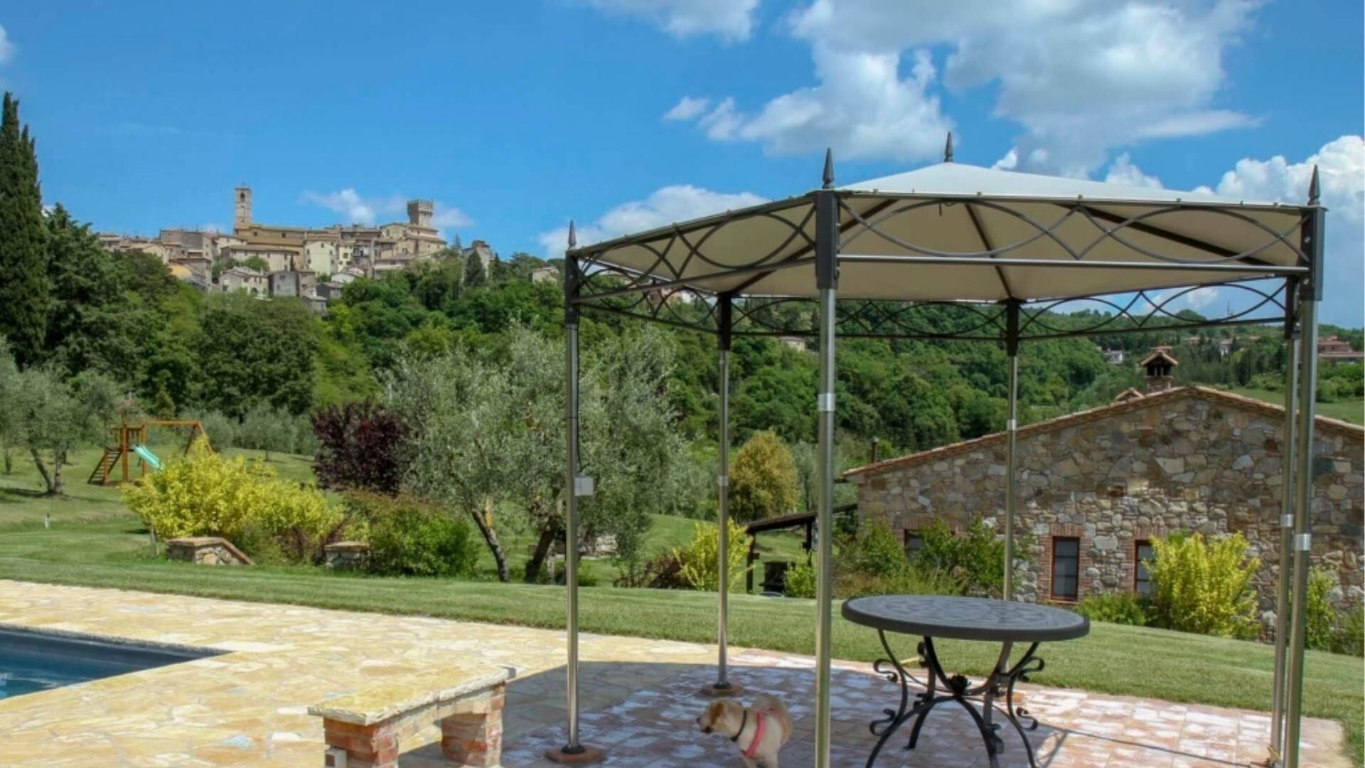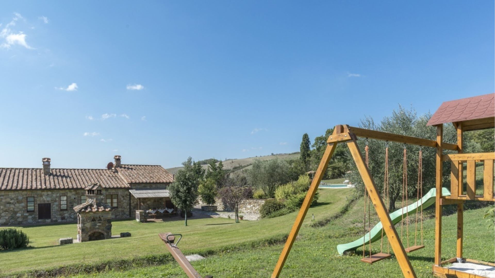 Udendørsarealerne ved Podere Aurora skaber en grøn oase designet til både fredelig afslapning og familieunderholdning. Ejendommen er omgivet af en velplejet have indhegnet med et hegn med en gennemsnitlig højde på 160 centimeter, hvilket giver privatliv og sikkerhed gennem hele opholdet. Midtpunktet i udendørsområdet er den private swimmingpool, som er i drift i den varme sæson og tilbyder forfriskende hvile på sommerdage. Ved siden af poolen finder De komfortable liggestole placeret til solbadning og afslapning. En charmerende pergola giver skyggefuld udendørs spiseplads, hvor De kan nyde måltider tilberedt på det dedikerede grillområde. Verandaen strækker sig langs villaen med flere adgangspunkter fra de indvendige rum, hvilket skaber en problemfri forbindelse mellem indendørs og udendørs ophold. Børn kan nyde den udpegede legeplads inden for de sikre havegrunde, hvilket gør dette udendørsmiljø velegnet til familier.