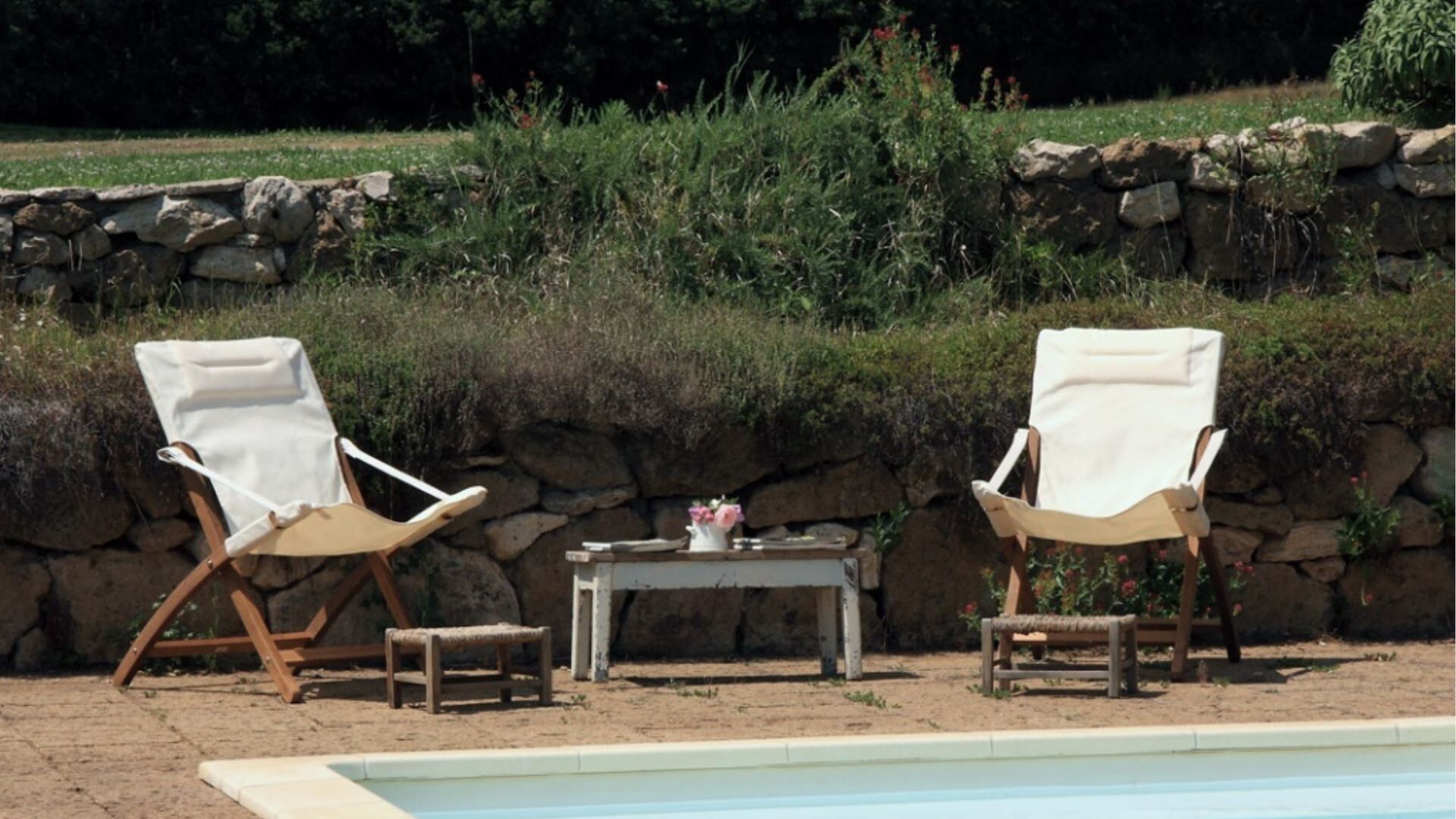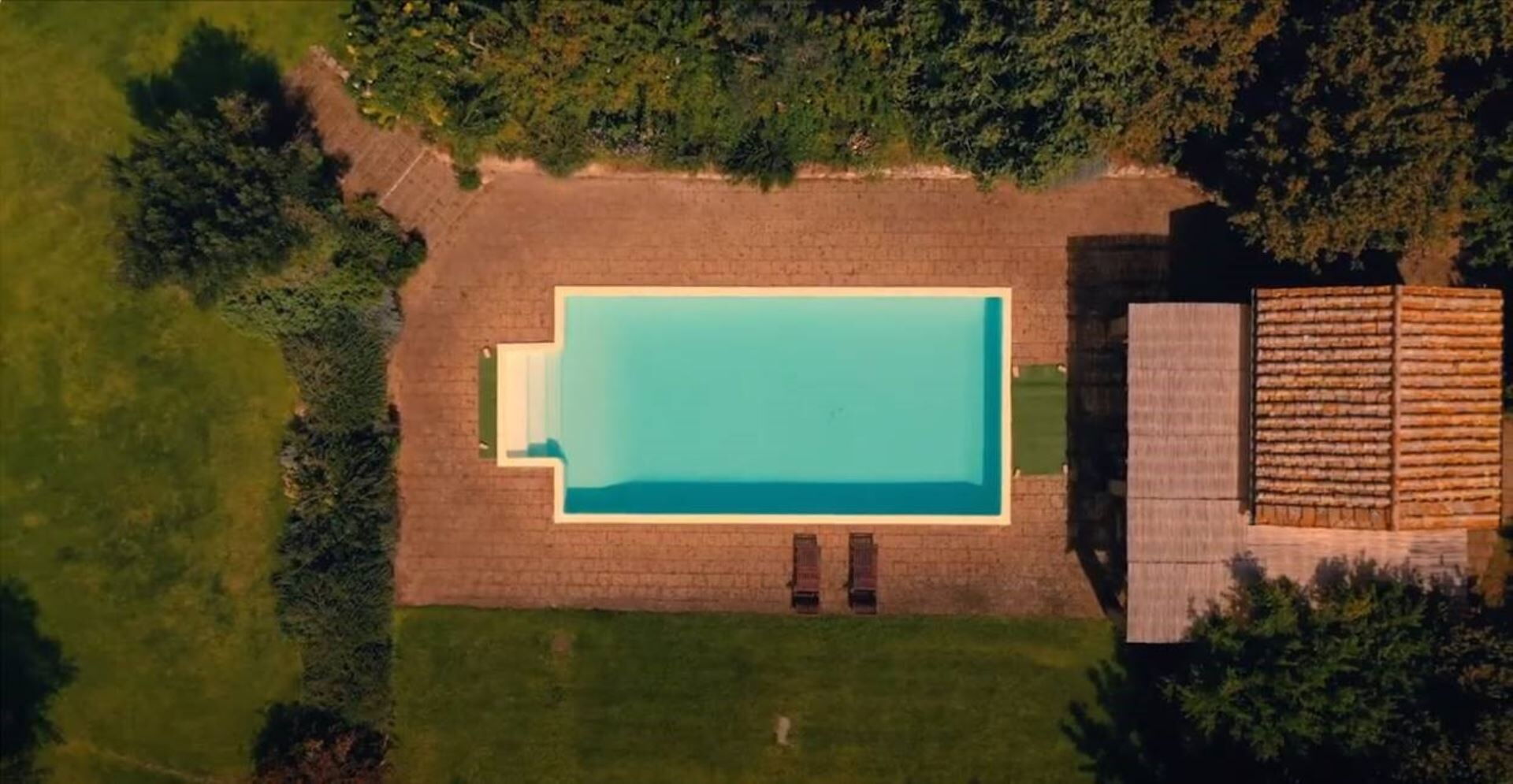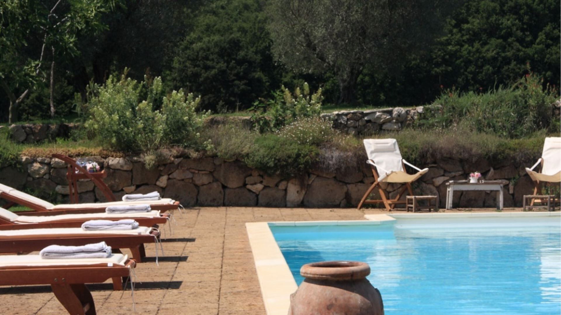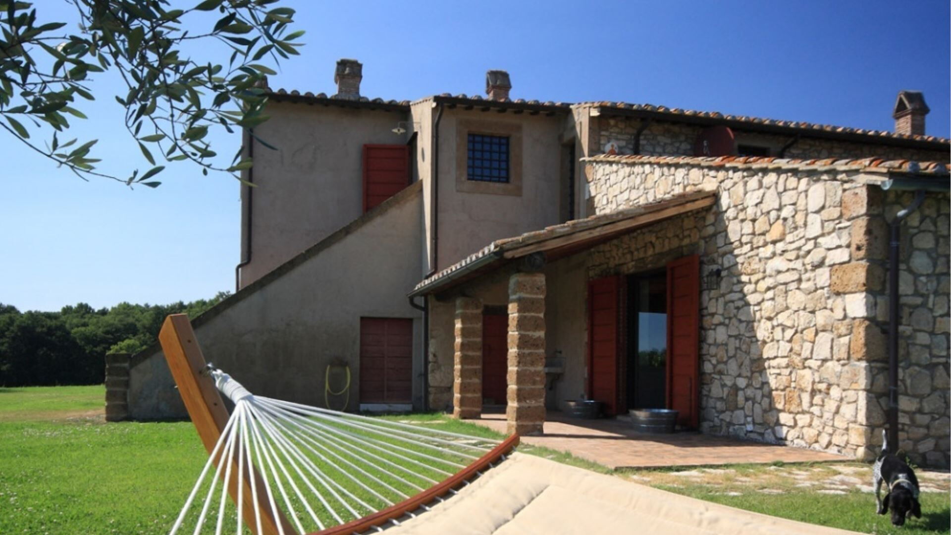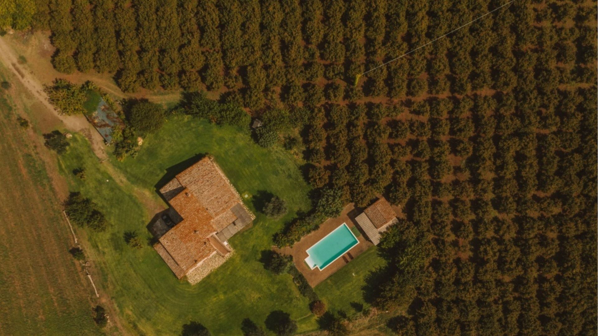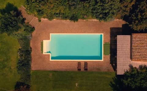 Landbruget er omgivet af et pragtfuldt landskab, der omfatter en skov, biologisk dyrkede marker med sæsonafgrøder og en hasselnøddelund. En stor græsplæne omgiver ejendommen umiddelbart, smukt anlagt med frugttræer, gamle oliventræer og roser, der skaber en charmerende middelhavsstemning. Swimmingpoolen er placeret på et lavere niveau af haven, omgivet af yderligere græsområder og et solarium med tufblokke, der giver naturlige sidde- og solbadningsområder. Foran stuen, med udsigt mod poolen, vil De opdage en overdækning, der skaber et ideelt rum til udendørs spisning, så De kan nyde måltider, mens De tager udsigten over det omgivende landskab ind. En lille bygning ved siden af poolen er flankeret af en pergola og rummer et bekvemt badeværelse med håndvask og toilet, et omklædningsrum og et praktisk tekøkken udstyret med elektriske kogeplader og et lille køleskab. Bag denne poolside-bygning vil De finde en udendørs bruser med koldt vand til forfriskende skylninger efter svømning. Hele ejendommen, hvor landbruget er beliggende, er indhegnet og danner et sikkert lukket område, og den omgivende ejendom tilbyder ideelt terræn til gåture, herunder behagelige udflugter gennem skovene.