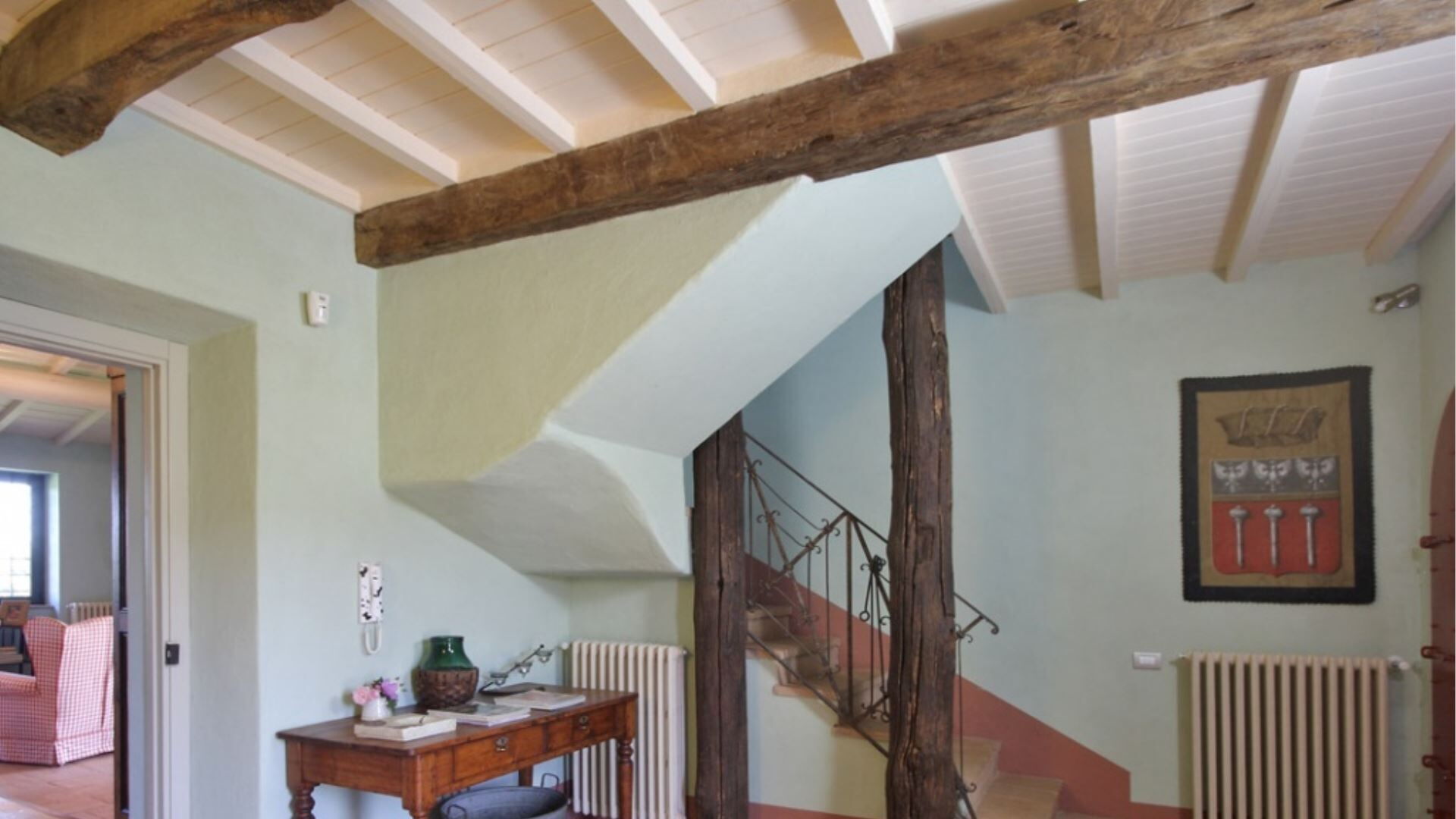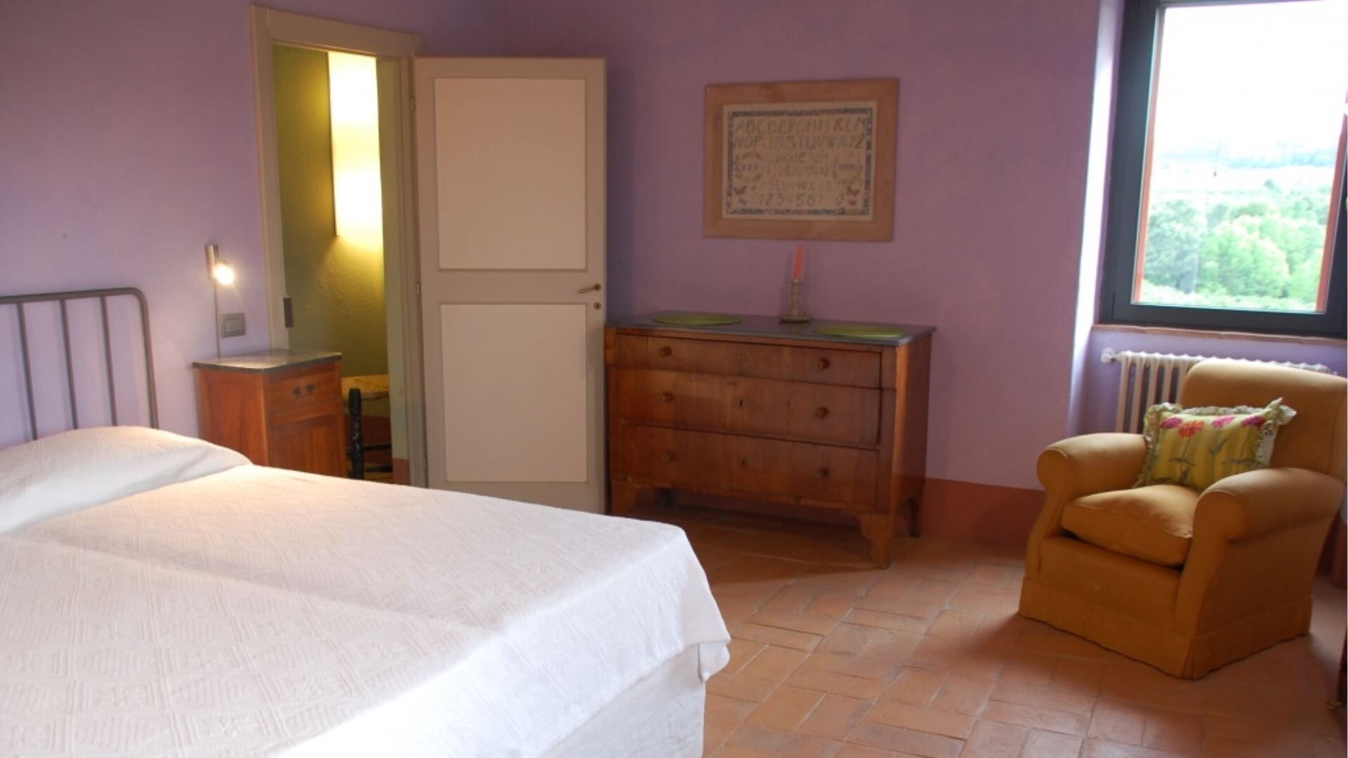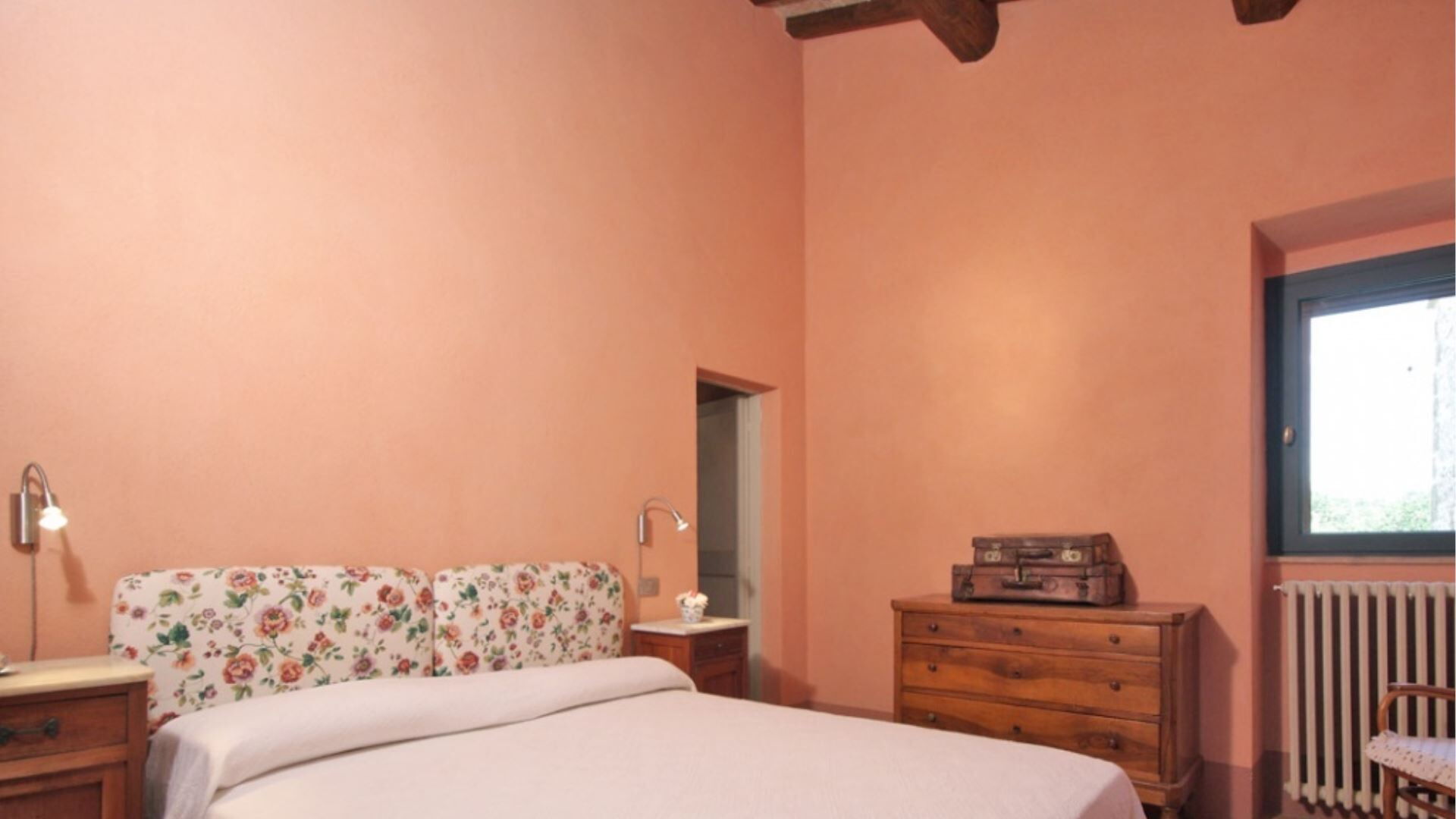 Landbruget kan rumme op til 8 gæster fordelt på 4 dobbeltværelser, hver ledsaget af sit eget private badeværelse. Indkvarteringen er gennemtænkt fordelt over to etager, hvilket skaber en rummelig og komfortabel indretning. På stueetagen vil De finde en stor spisestue med en traditionel pejs, et fuldt udstyret køkken og et bekvemt vaskerum med et servicebadeværelse. Også på dette niveau er der et dobbeltværelse med et tilstødende badeværelse udstyret med en bruseniche, der er specielt designet til at være kørestolsvenlig. Når De går op på første sal, vil De opdage et lille studieområde sammen med tre yderligere dobbeltværelser, hver med sit eget private badeværelse med en stor bruseniche. Et af værelserne på første sal er indrettet med en dobbeltseng, mens de to andre værelser tilbyder fleksible sovearrangementer og kan konfigureres som enten to enkeltsenge eller dobbeltseng efter Deres præferencer. Det indvendige design gennem hele landbruget præsenterer en elegant blanding af antikke familiemøbler, der veksler med omhyggeligt udvalgte moderne tilføjelser, mens væggene er behandlet med kalk og forstærket med meget farverige naturlige pigmenter, der skaber en varm og indbydende atmosfære.
