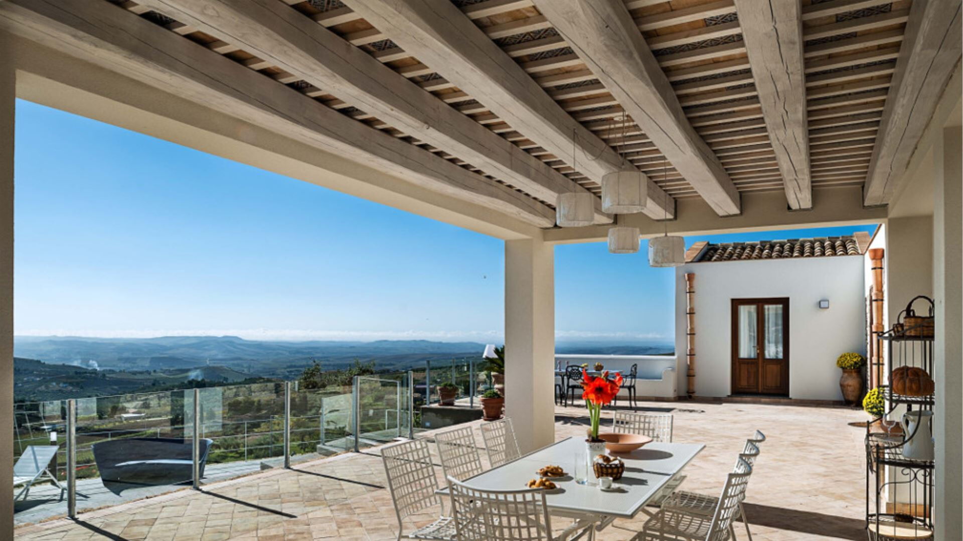 Udendørsarealerne ved Villa Eroica er gennemtænkt designet til at maksimere Deres glæde ved det mediterrane klima og det spektakulære udsyn over landskabet. Den storslåede infinity pool fungerer som omdrejningspunktet for de udvendige faciliteter og tilbyder et luksuriøst rum, hvor De kan svømme, mens De nyder uafbrudt udsigt over dalen nedenfor. Omkring poolen vil De finde et indbydende solariumområde, der er perfekt til solbadning og afslapning. Ejendommen byder på en udstrakt privat have, der omkranser villaen og tilbyder skyggefulde områder og åbne pladser til fritidsaktiviteter. En overdækket veranda giver behageligt udendørs opholdsrum, mens en rummelig terrasse udstyret med spisemøbler skaber en ideel ramme for måltider i det fri og aftensammenkomster under den sicilianske himmel. Disse udendørsområder er møbleret med komfortable siddepladser og designet til fuldt ud at udnytte villaens forhøjede position og betagende panoramaudsigter.
