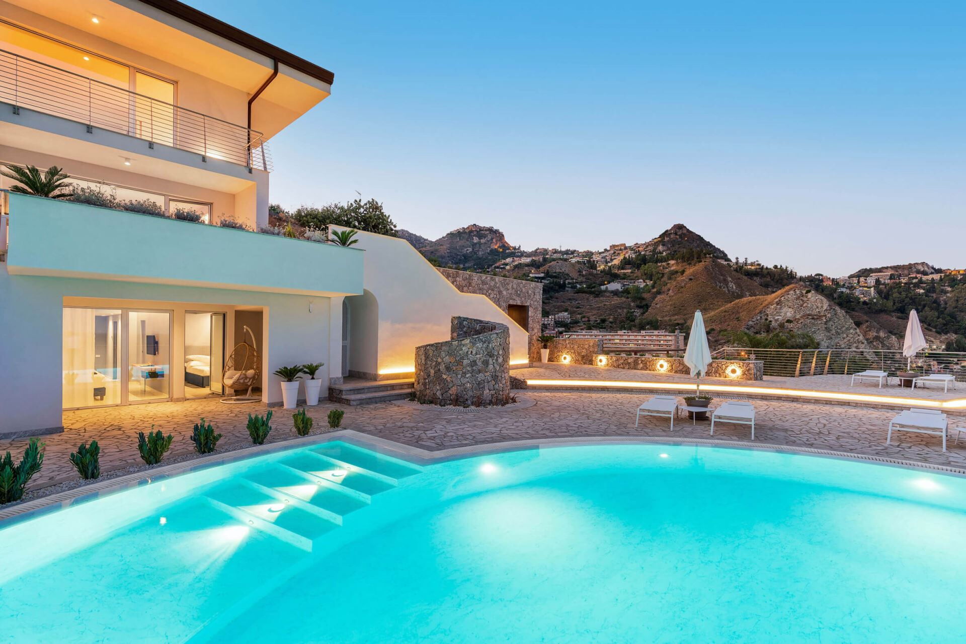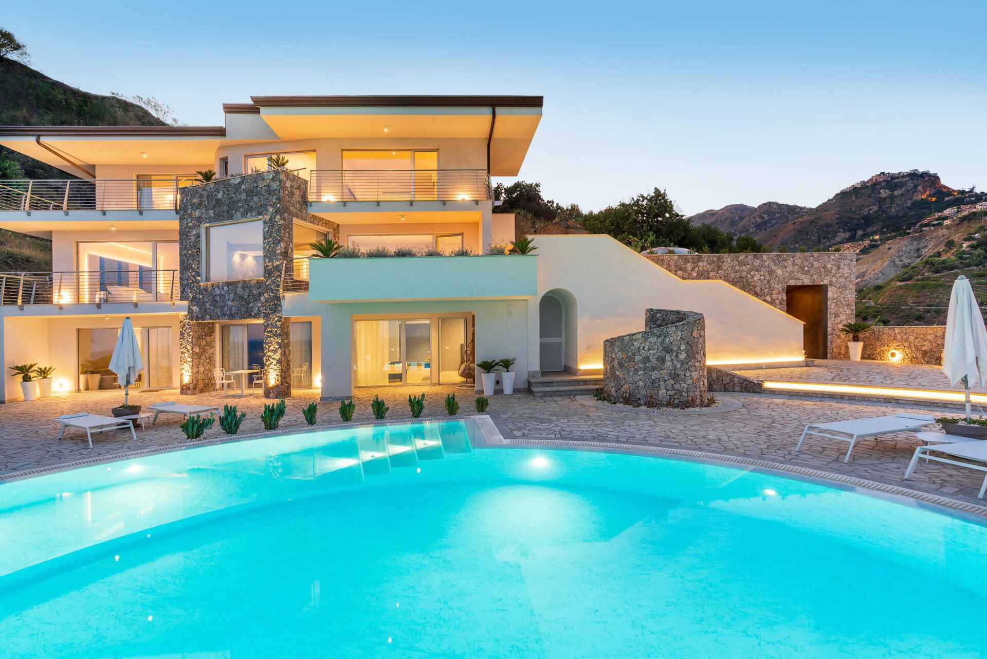 Villa Taormina er en luksus feriebolig beliggende nær Taormina, Italien, der tilbyder et exceptionelt tilflugtssted for kræsne rejsende, som søger komfort og eksklusivitet. Denne panoramiske ejendom er placeret på en bakke og giver betagende udsigt over havet, mens den kun ligger 600 meter fra den nærmeste strand. Villaen har en opvarmet saltvands swimmingpool, der forbedrer Deres afslapningsoplevelse gennem hele opholdet. Villa Taormina er designet til at rumme op til 20 gæster og kombinerer moderne arkitektur med luksuriøse faciliteter, hvilket gør den til et ideelt valg for store familier eller grupper. Ejendommen omfatter et dedikeret wellnessområde komplet med fitnesscenter, sauna, massagerum og multisensorisk bruser, hvilket sikrer, at De nyder en virkelig foryngende ferie. Med sin nærhed til både Giardini Naxos og Taormina fungerer denne bemærkelsesværdige villa som det perfekte udgangspunkt for at udforske de kulturelle og naturlige skatte på Sicilien.