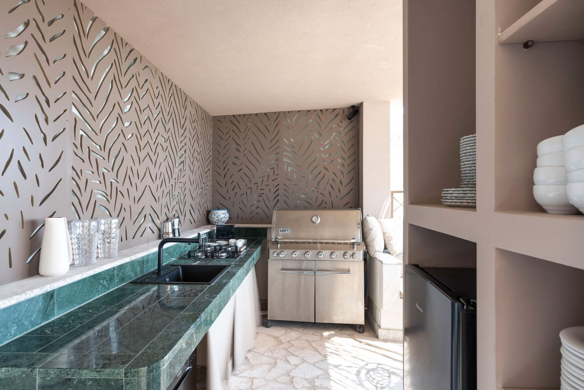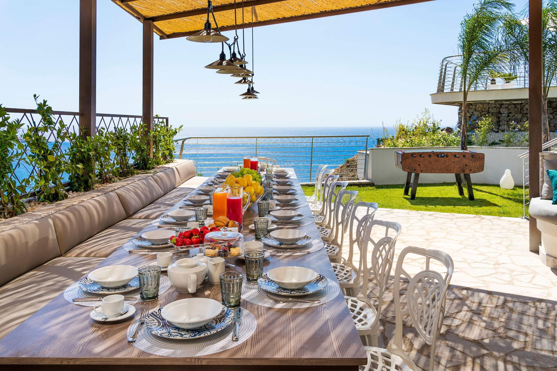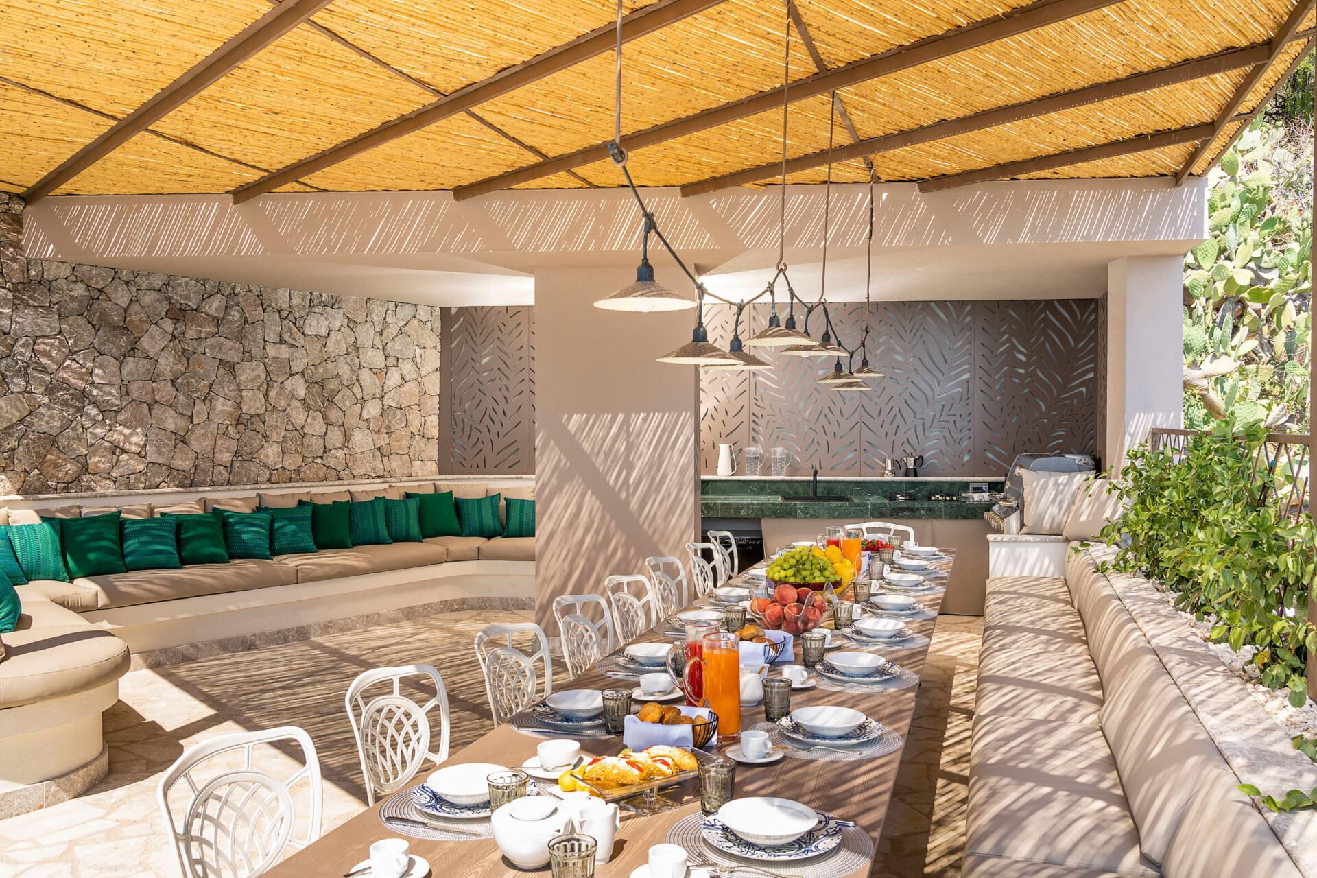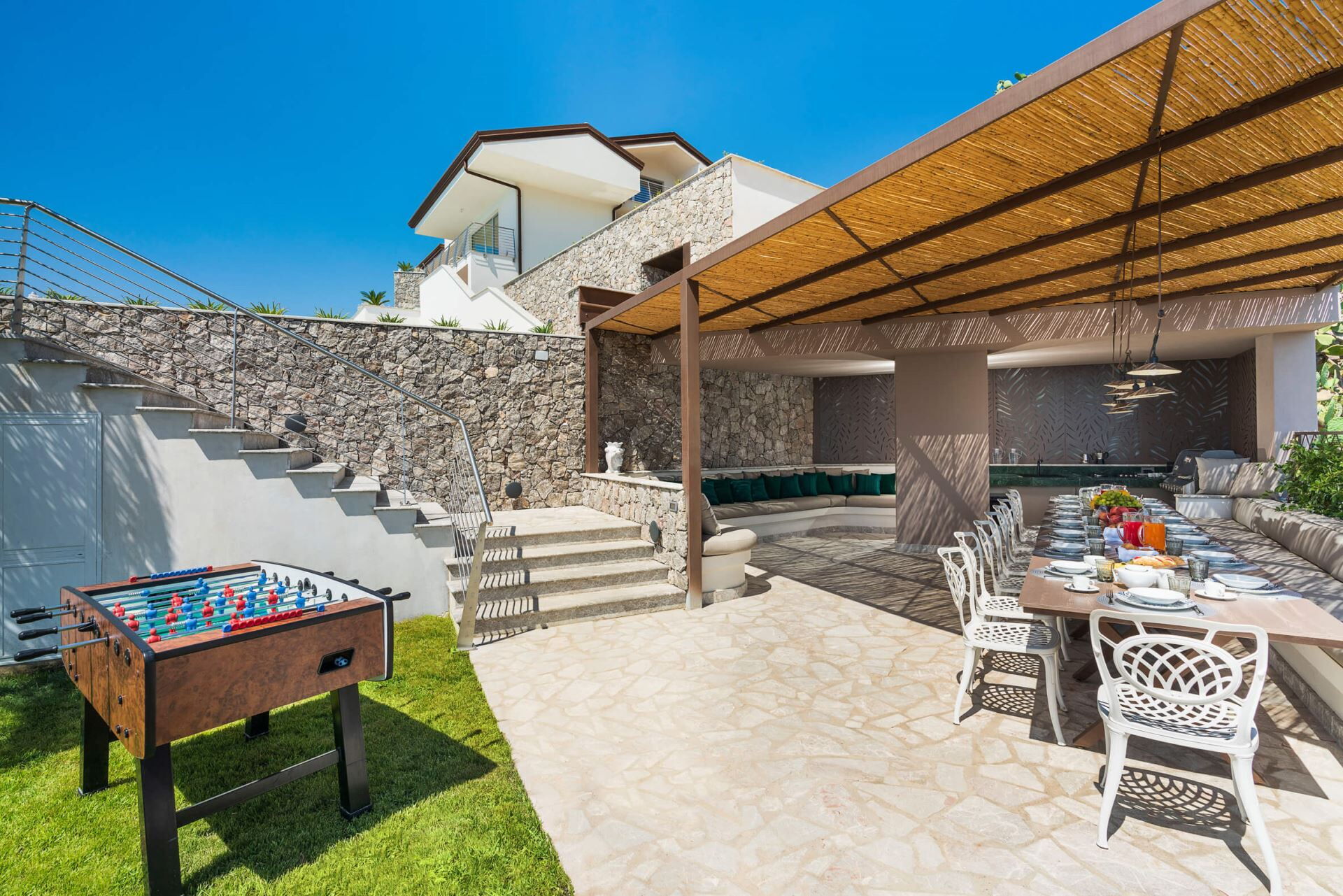 Udendørsområderne ved Villa Taormina er designet til at maksimere Deres nydelse af det mediterrane klima og den fantastiske havudsigt. De vil finde udstrakte terrasser, der giver rigelig plads til afslapning, spisning og underholdning, mens De nyder det panoramiske udsyn. Ejendommen har smukt vedligeholdte haver, der skaber en rolig atmosfære gennem hele området. Den opvarmede saltvands swimmingpool måler 7,00 gange 12,00 meter med en dybde fra 1,20 til 1,50 meter og er i drift hele året fra 01/01 til 31/12, hvilket giver Dem det perfekte sted at forfriskes og slappe af. Ved siden af poolen vil De opdage en dedikeret solterrasse, der er ideel til solbadning. Udendørskøkkenet er fuldt udstyret med grill og spiseområde, så De kan tilberede og nyde måltider i det fri. Derudover er der en privat spabad på 2,00 gange 2,00 meter med en dybde fra 0,60 til 0,80 meter, opvarmet til behagelige 28 grader og i drift hele året. Et udendørs badeværelse med bruser er bekvemt placeret nær poolområdet for Deres komfort.