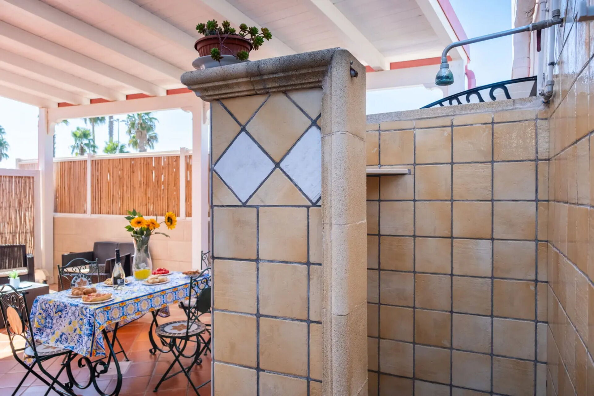 Gårdhave: udendørs spiseplads, spisebord.