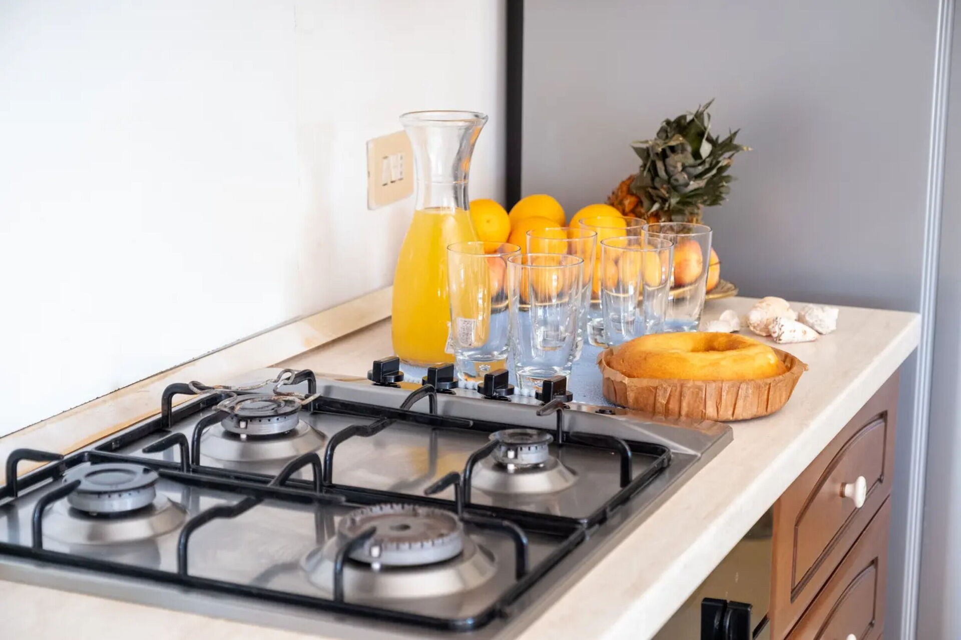 Køkken - stue: veludstyret køkken, spisebord, køleskab, kogeplader, ovn, dobbelt sovesofa, klimaanlæg, tv.