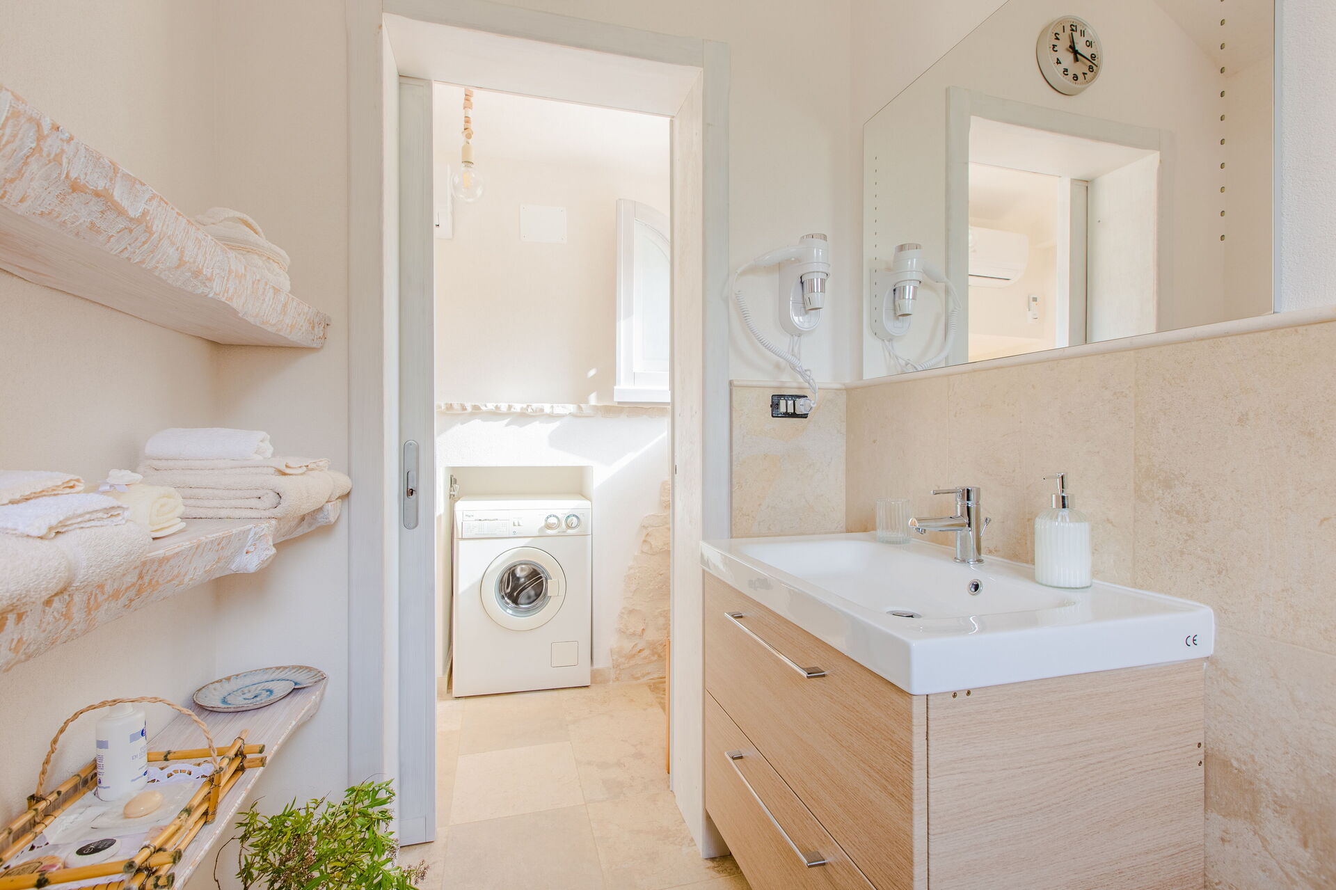 Badeværelse: vask, wc, bidet, bruser, hårtørrer, vaskemaskine.