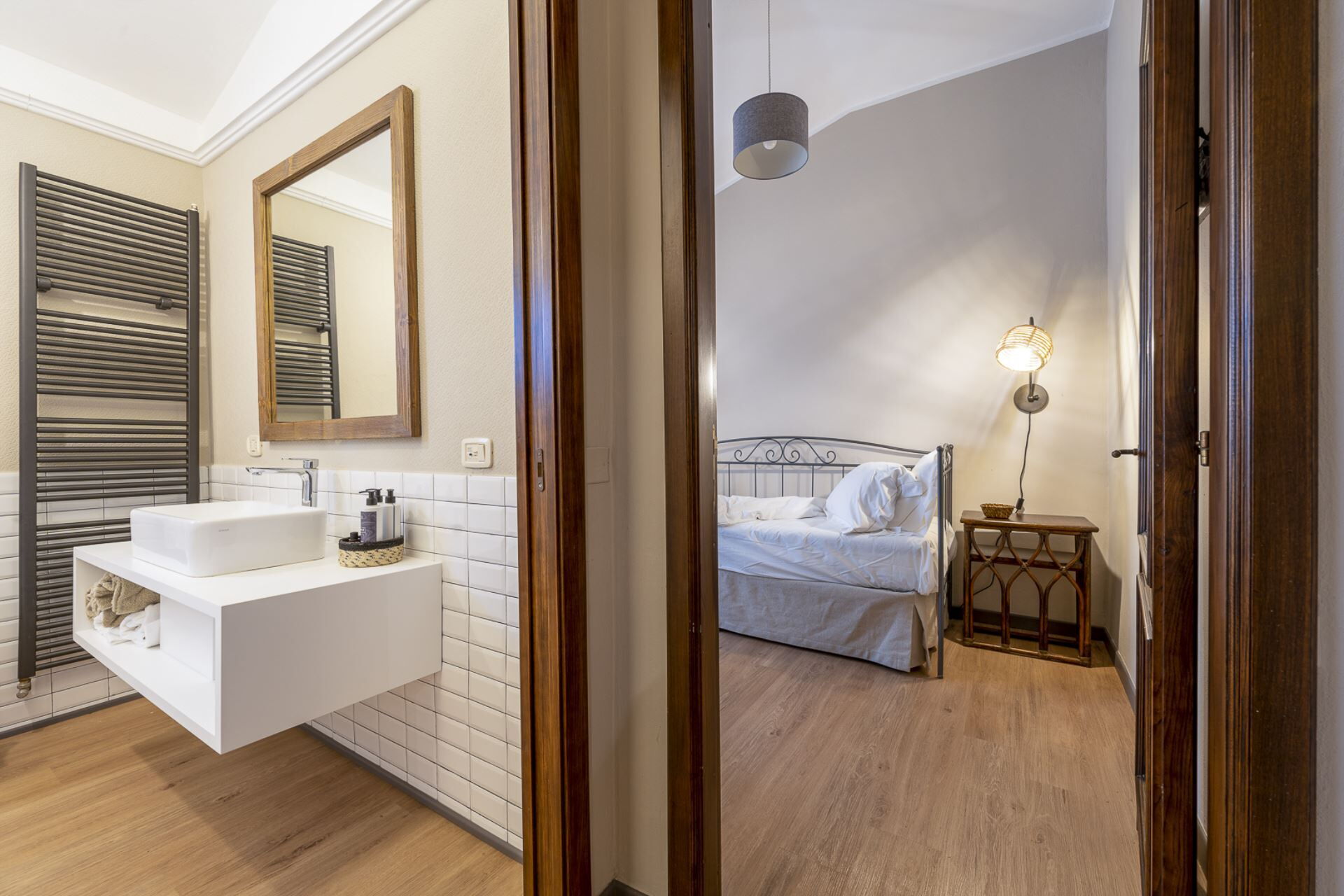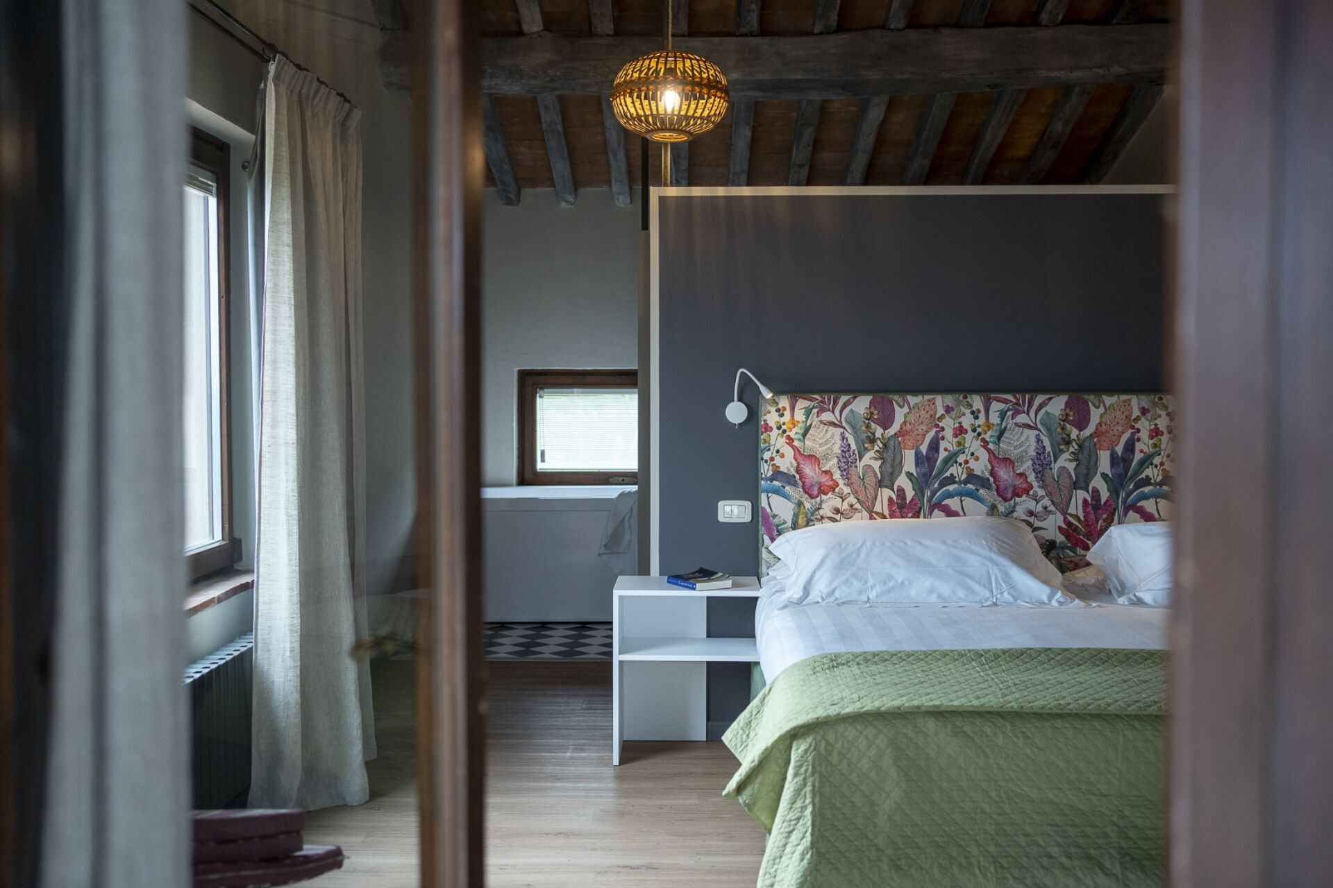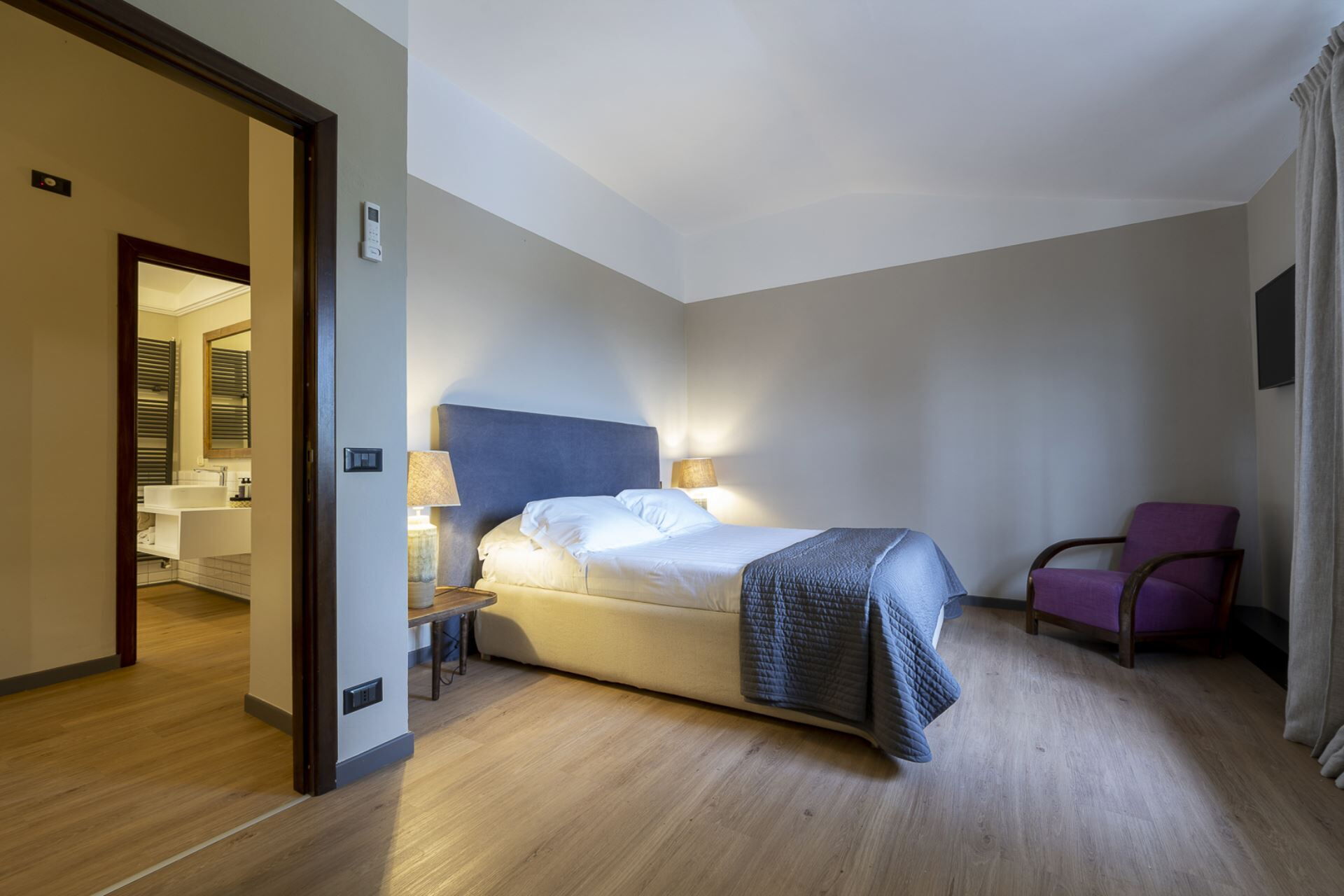 Soveværelse med bad: king size seng, WIFI internet, internet, klimaanlæg, myggenet, satellit tv, tv, boblebad, vask, wc, bidet, bruser, hårtørrer, udgang til terrasse.