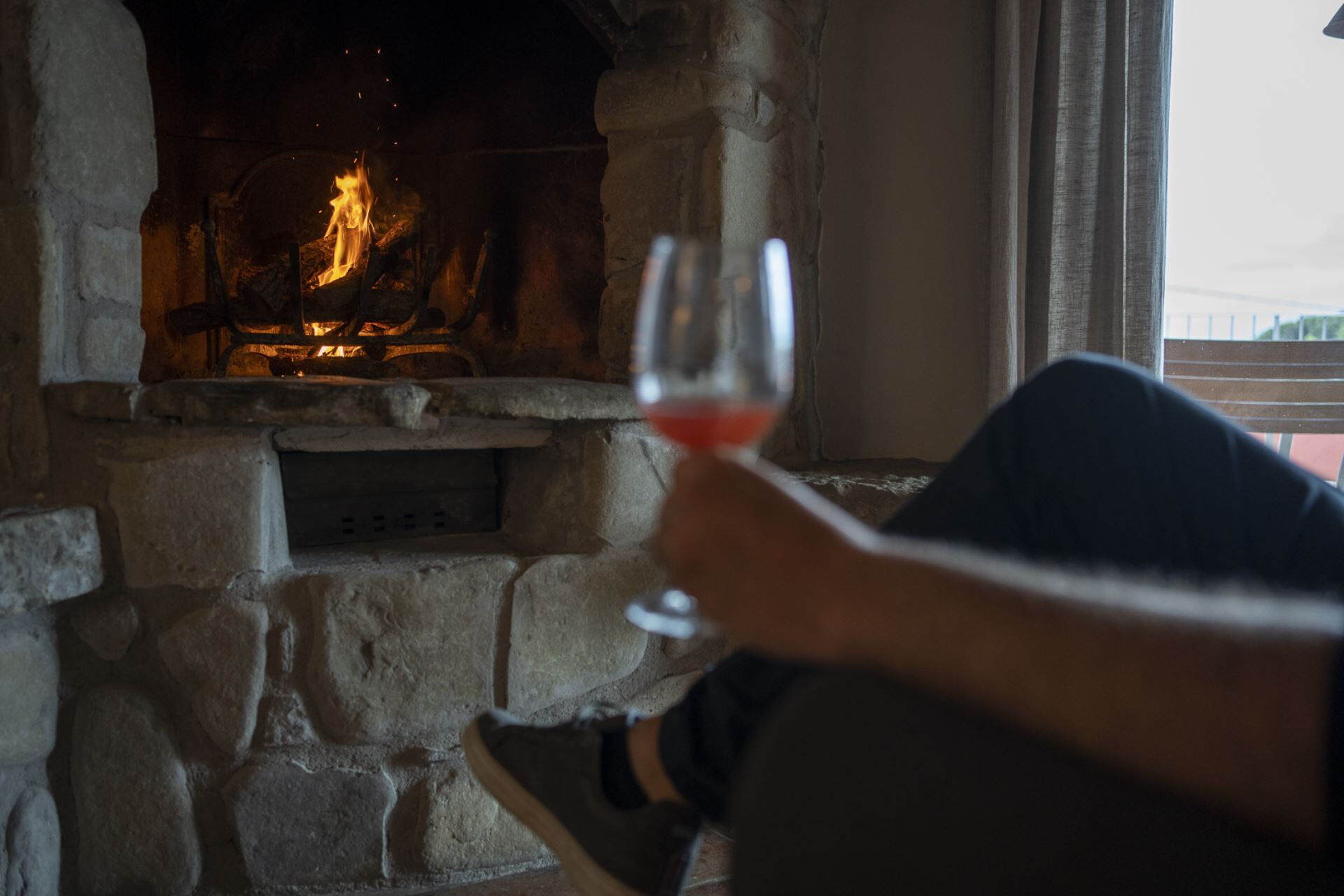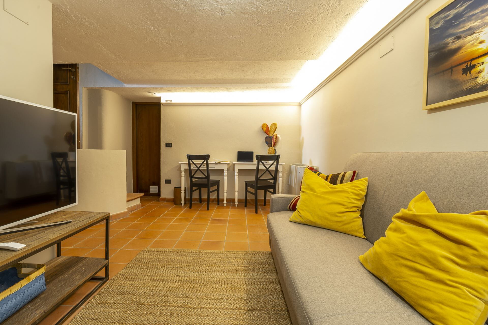 Stue: sofa, kamin, WIFI internet, internet, klimaanlæg, satellit tv, tv, udgang til gårdhave.