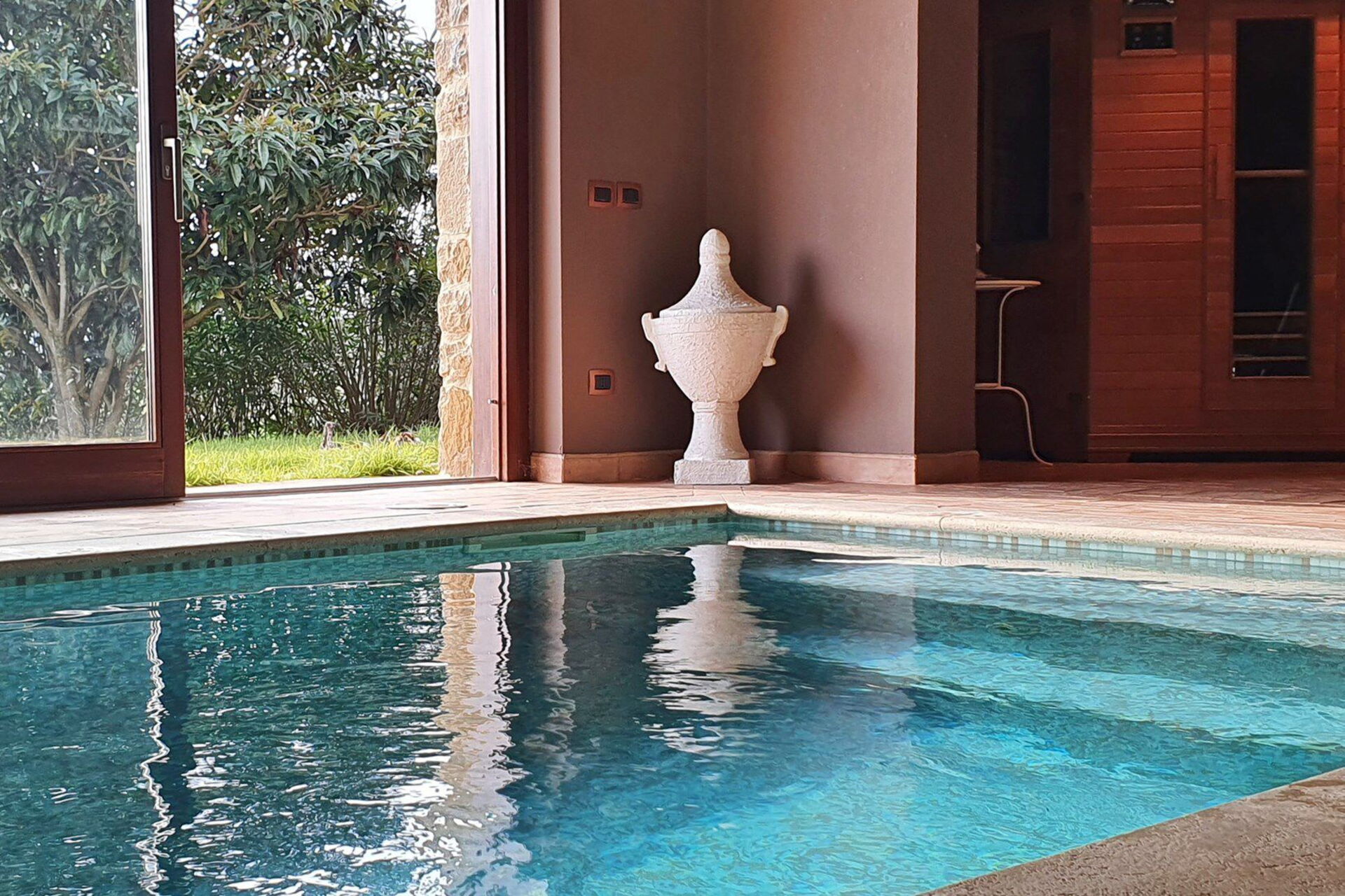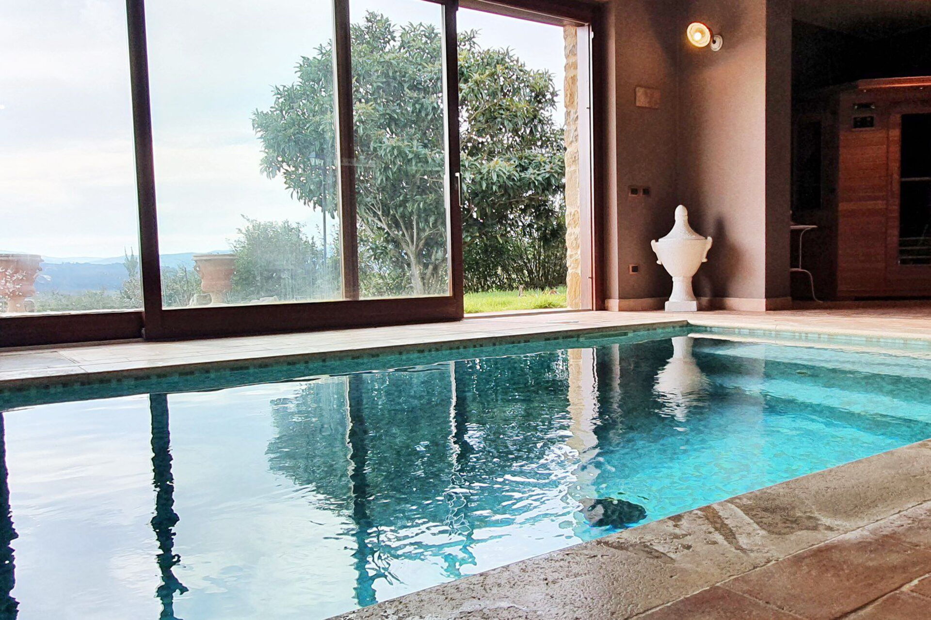 Downstairs, in the walk-out basement, lies a true sanctuary: a wellness area complete with a heated indoor pool, a sauna, and a relaxing lounge. The pool’s large sliding windows reveal