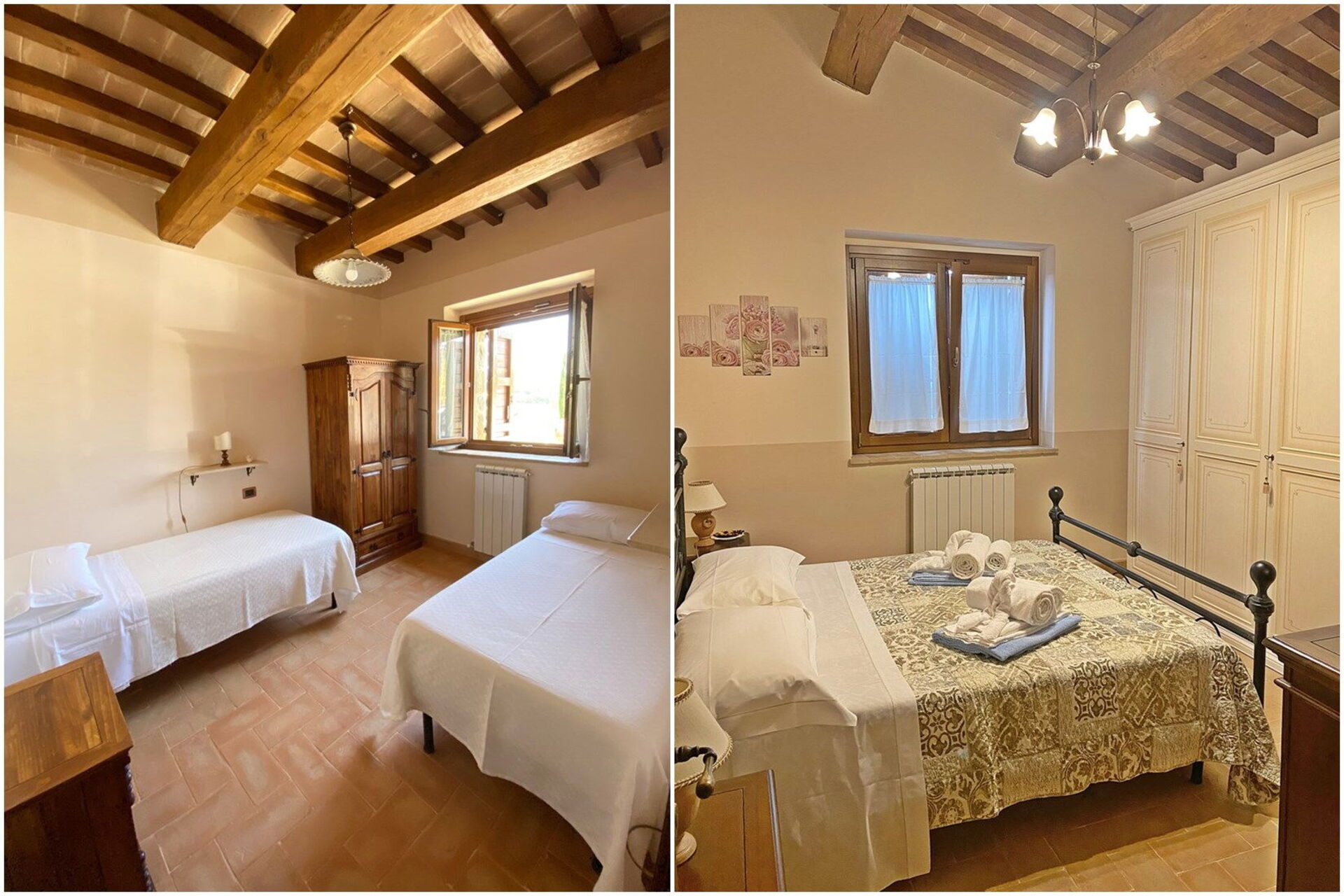 Upstairs, the master bedroom boasts an en-suite bathroom and a private terrace offering sweeping vistas of the Umbrian hills—a serene spot to enjoy a quiet morning coffee.