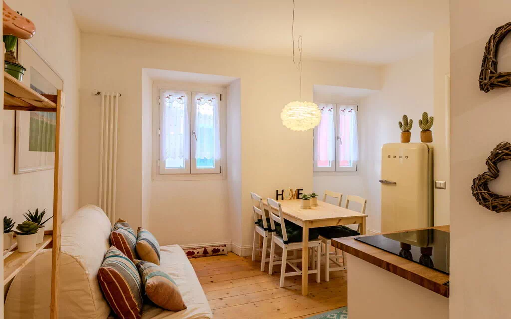 "Dosso", 2-værelse-lejlighed 50 m2 i 2. etage. Lys, delvis renoveret i år 2025, rustikt og hyggeligt indrettet: stue/spisestue med 1 dobbelt sovesofa (140 cm, længde 190 cm), TV. 1 dobbeltværelse. Kogeniche (ovn, opvaskemaskine, 4 Induktionskomfur, kedel, mikroovn, fryser). Brus/bidet/WC. Opvarming. Opvarme kun tilgængelig fra 15.11. til 30.04. Trægulve. Til benyttelse: strygejern hårtørrer. Internet (trådløs LAN [WLAN], gratis). Parkeringsplads ved huset. Bemærk venligst: ikke-ryger lejlighed. Maksimum 1 husdyr/hund tilladt. Privat indgang, brandslukker, ingen elevator. IT022006C2WB7AQX9B
