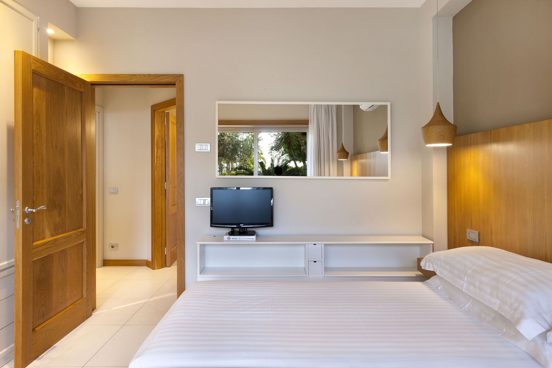 Soveværelse med bad 6: king size seng (bredde: 1.8m, længde: 2m), vugge, WIFI internet, klimaanlæg, tv, vask, wc, bruser, hårtørrer.
