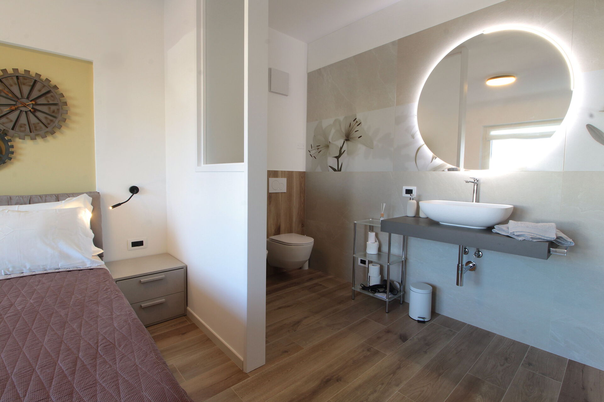 Soveværelse med bad: dobbeltseng, WIFI internet, klimaanlæg, handikap ok, vask, wc, bidet, bruser, hårtørrer.