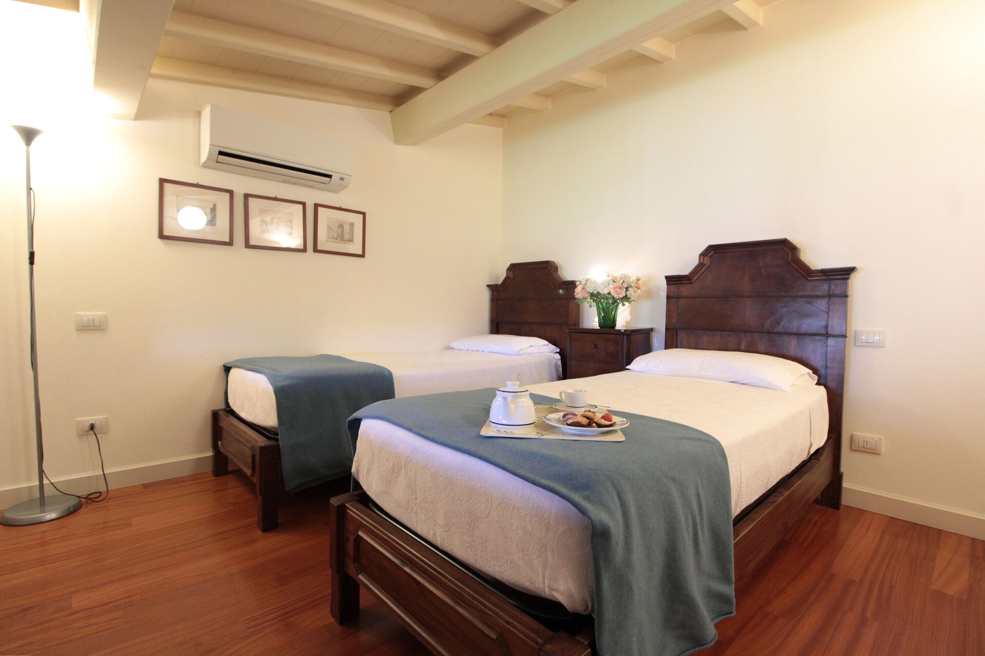 Soveværelse med bad: dobbeltseng, klimaanlæg, vask, wc, bidet, bruser, hårtørrer.