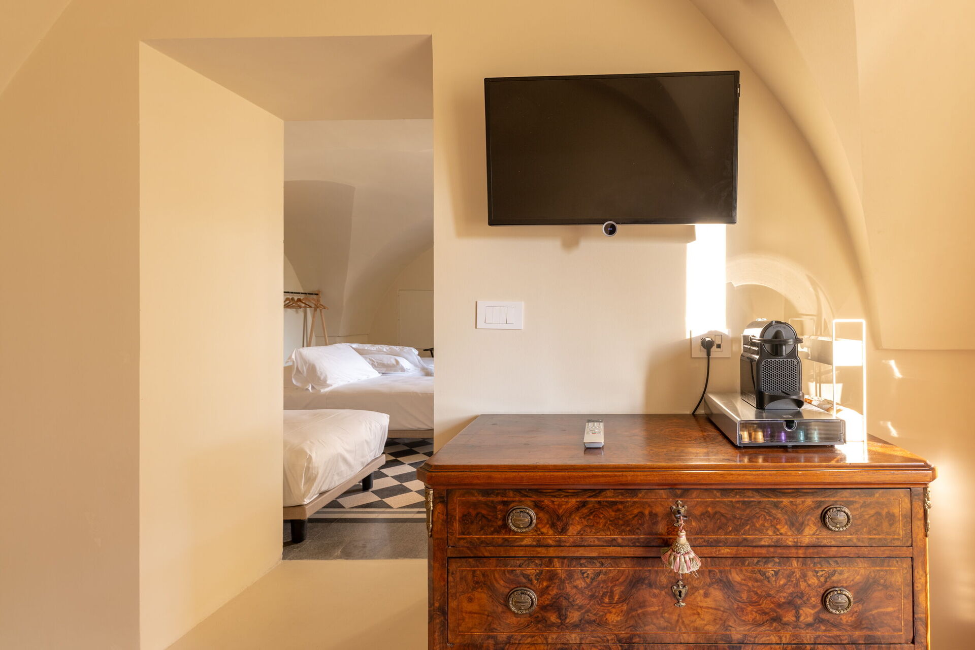 The ground floor offers elegant and functional rooms, including a large kitchen, a beautiful living room with an office area, and a bathroom that can be adapted as a single bedroom. There is also the Garden Suite, overlooking the garden, with a bright and relaxing atmosphere, equipped with a Nespresso machine with capsules, a kettle, and a minibar.