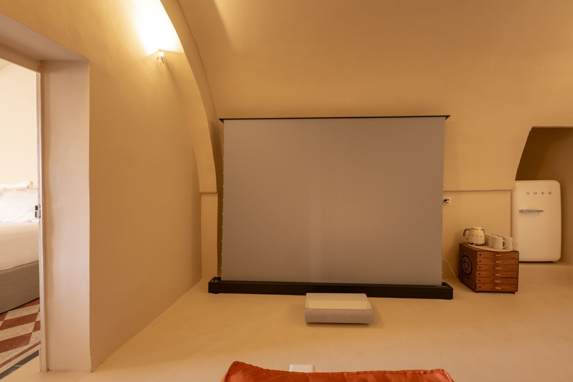 On the mezzanine floor, we find the Family Suite, ideal for up to six adults, with two bedrooms, two bathrooms, and a cozy cinema and games room with a 100-inch screen, 4K projector, and PlayStation 5. Here too, we find a Nespresso machine with capsules, a kettle, and a fridge.