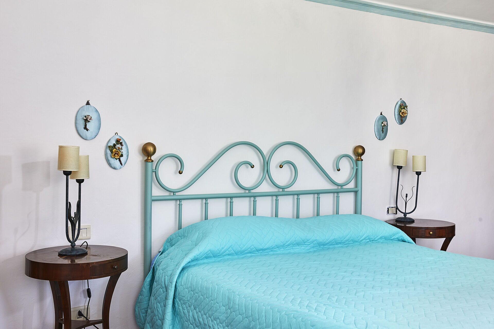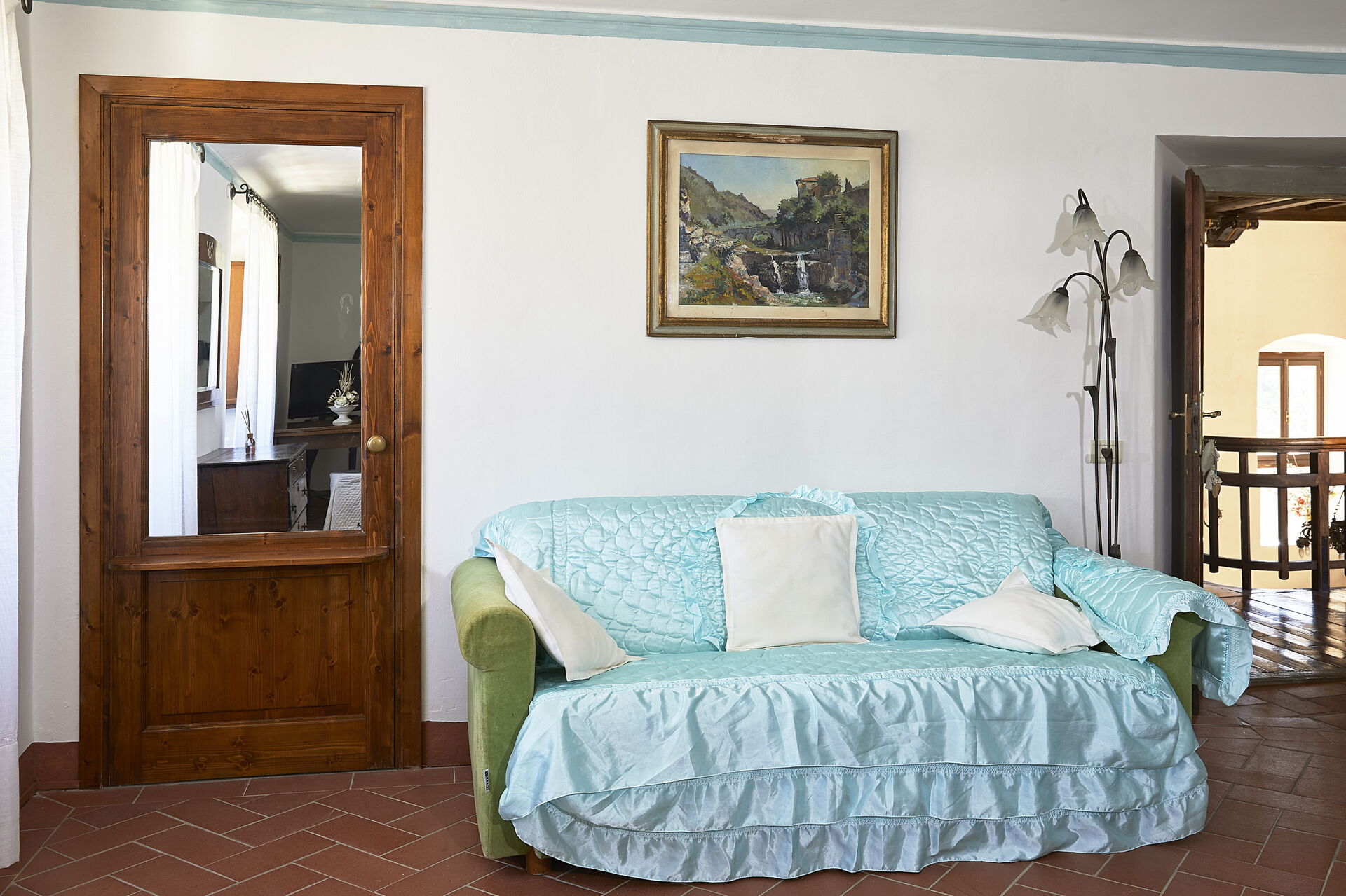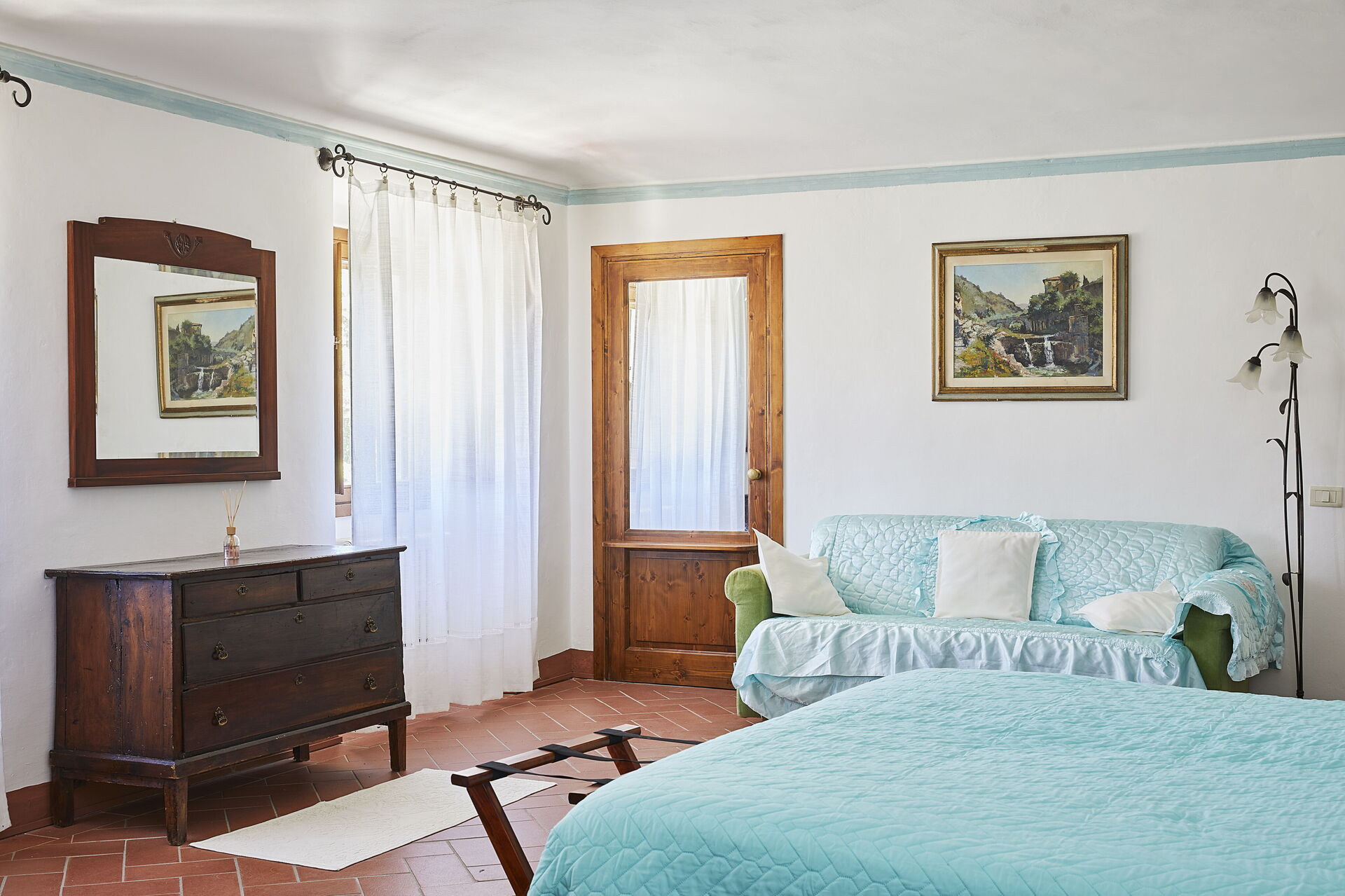 Clemente VII Suite (Ekstra): To-værelses lejlighed (ca. 70 kvm) på første sal, med en stor stue med originalt terracotta gulv og træspær, dobbeltværelse og et lyseblåt badeværelse med Jacuzzi kar/bruser.