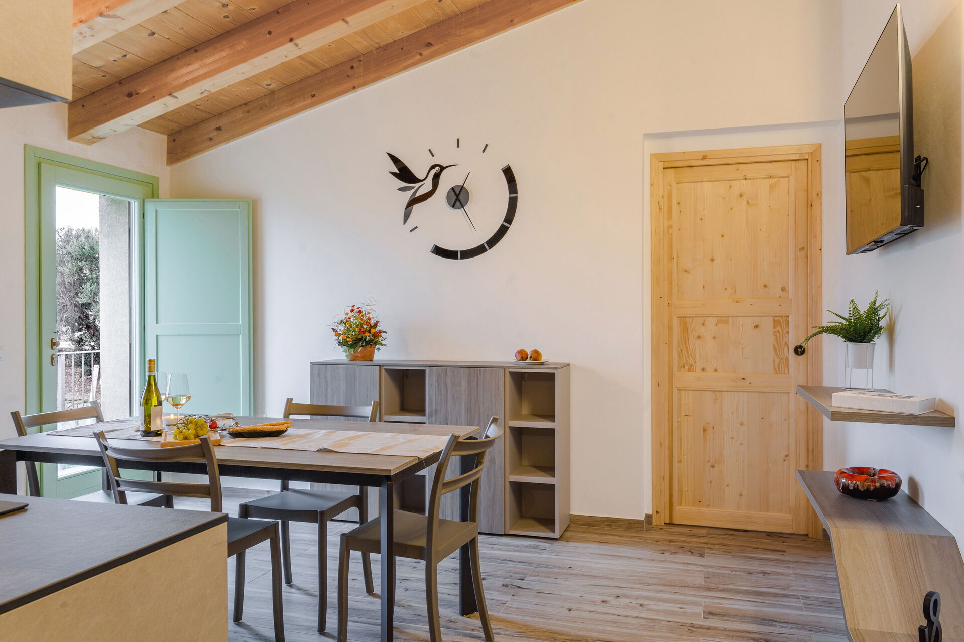 Køkken - stue: veludstyret køkken, spisebord, opvaskemaskine, køleskab, fryser, mikroovn, kogeplader, ovn, italiensk kaffemaskine, to lænestole, WIFI internet, klimaanlæg, myggenet, satellit tv, røgalarm, co2 detektor, udgang til have.